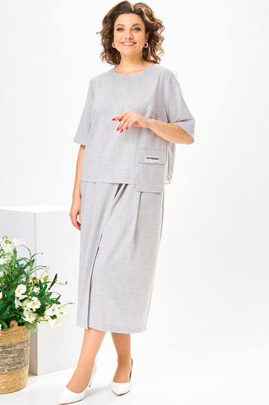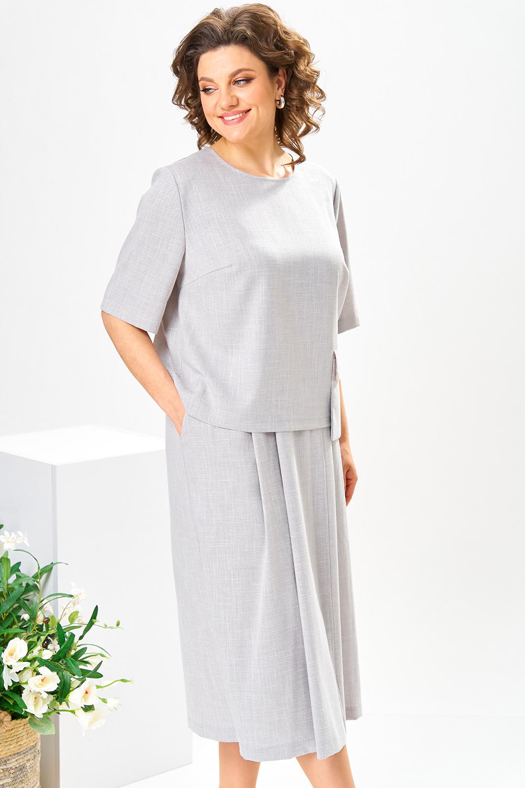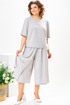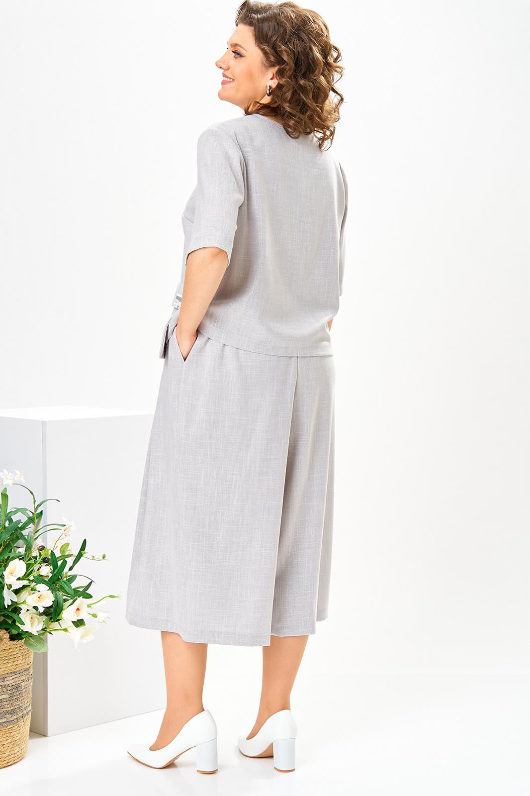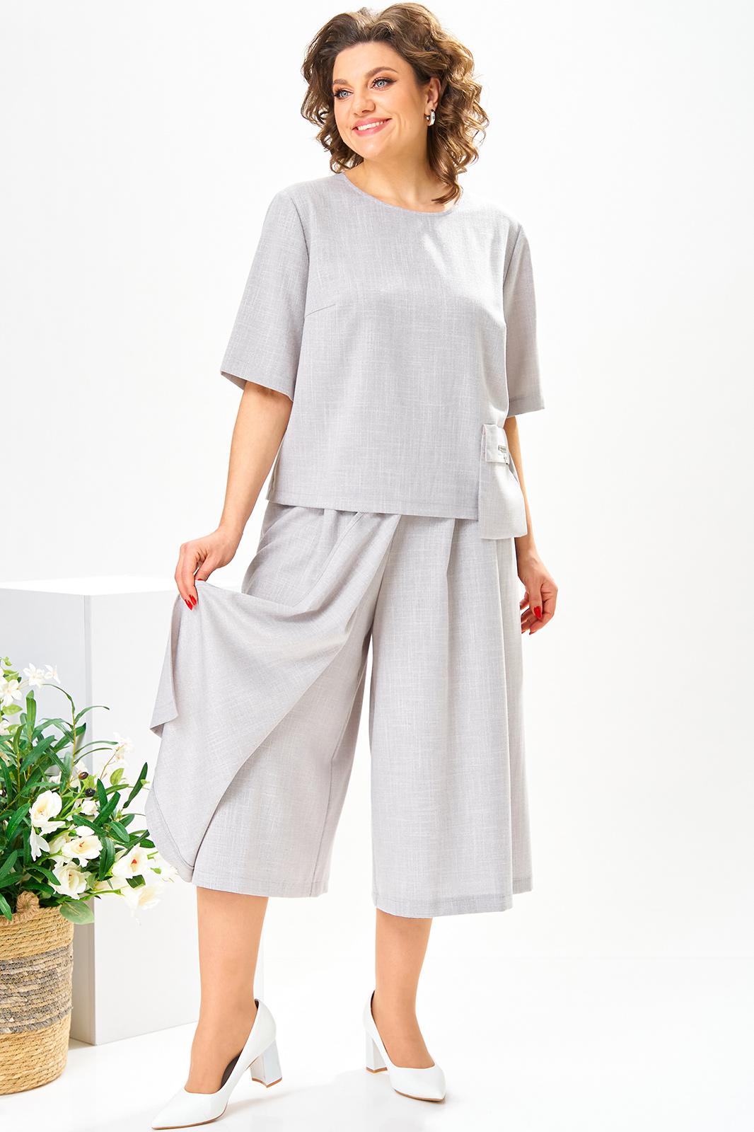 Костюм женский, предназначен для повседневной носки. Костюм женский 2-х предметный, блузон и юбка-брюки. Блузон женский прямого силуэта, длиной выше линии бёдер на 4 см. Перед с 2-мя нагрудными вытачками, с накладным отлётным прямоугольным карманом с клапаном, декорированным надстрочной аппликацией на левой части переда. Спинка цельнокроеная. Горловина круглая, обточная, без воротника. Рукав втачной одно шовный, длиной до локтя. Блузон без плечевых накладок. Юбка-брюки свободного покроя, длиной до нижней части икры. Передние половинки с отлётной отделочной деталью справа имитирующей запах. Передние половинки с карманами в боковых швах с отрезными бочками с 2-мя односторонними складками на линии талии. Юбка брюки с притачным поясом, частично собранным на эластичную тесьму, закреплённую 2-мя отделочными строчками. Длина юбки-брюк 83 см. Длина спинки блузона 53 см, длина рукава 31,5 см.