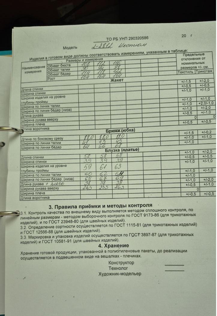 Костюм женский, предназначен для повседневной носки. Костюм женский 2-х предметный блузка и юбка. Блузка женская прямого силуэта, длиной до линии бёдер. Перед с 6-ю декоративными защипами шириной 0,5 см. Спинка цельнокроеная. На уровне линии талии обработана кулиса со шнуром с 2-мя металлическими наконечниками. Горловина круглая, без воротника, обработана косой бейкой. Рукав реглан, одно шовный, длиной до локтя, 4 см от низа рукава собран на эластичную тесьму, закреплённую 2-мя отделочными строчками. Блузка без плечевых накладок. Юбка женская, расширенная к низу, из отделочной ткани, длиной до нижней части икры. Переднее полотнище цельнокроеное. Заднее полотнище со средним швом. Низ юбки с притачным воланом с лёгкой сборкой по верхнему срезу. Юбка с притачным поясом, собранным на эластичную тесьму, закреплённую 2-мя отделочными строчками. Длина юбки по боковому срезу 88 см. Длина спинки блузки 58 см, длина рукава + плеча 38 см.