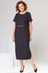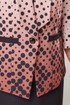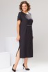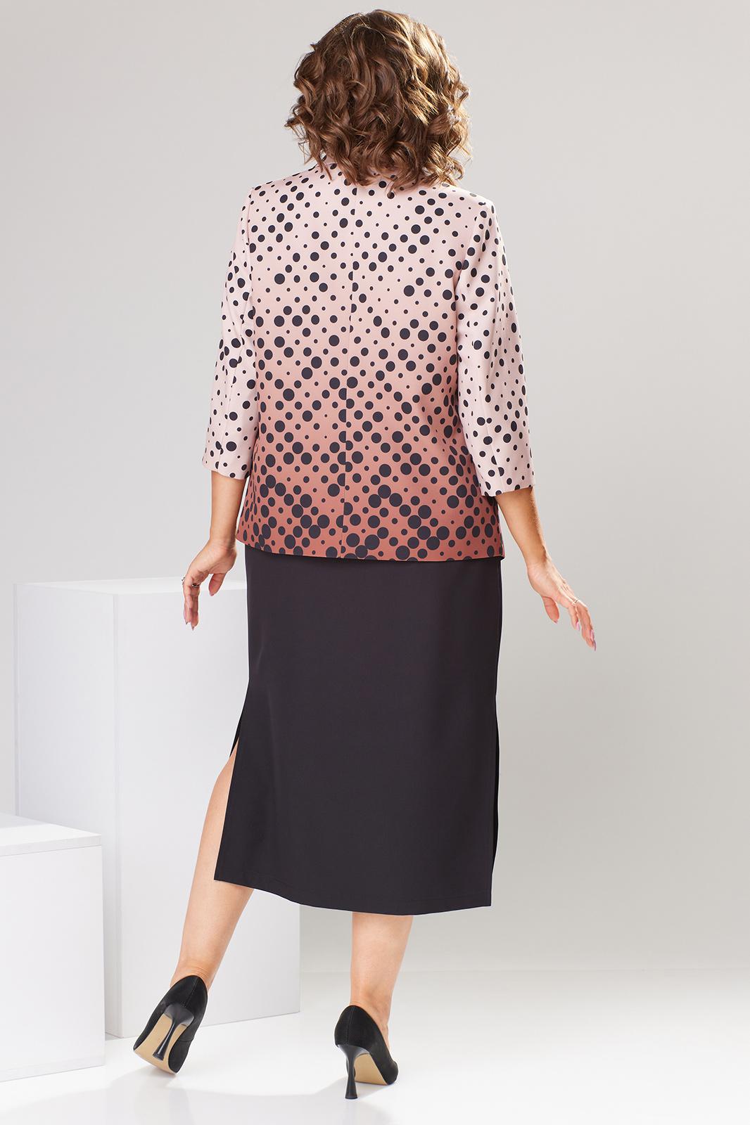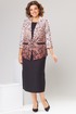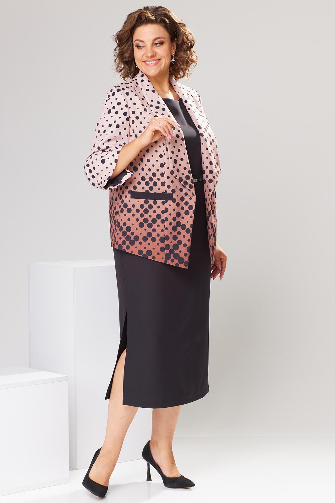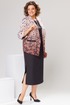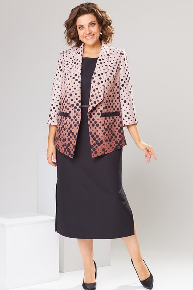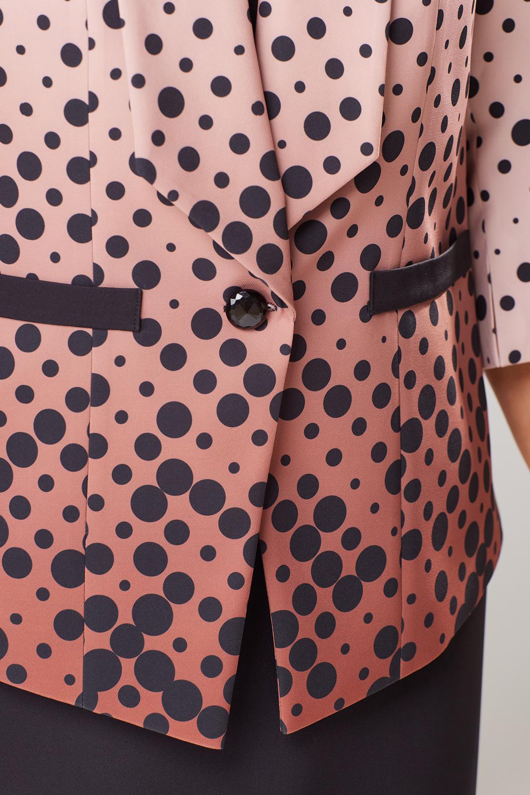 Комплект женский относится к торжественной нарядной одежде. Комплект женский 2-х предметный жакет и платье. Жакет полуприлегающего силуэта с фигурным низом, длиной до линии бёдер. Перед с 2-мя отрезными рельефами и 2-мя настрочными листочками на уровне линии талии. Спинка со средним швом. Горловина с V-образным вырезом с цельнокроеным воротником. Застёжка центральная бортовая на 1-ну петлю и 1-ну пришивную пуговицу. Рукав втачной, 2-х шовный, длиной 3/4, с разрезом внизу локтевого шва. Жакет на приточной подкладке. Жакет с плечевыми накладками. Платье женское полуприлегающего силуэта, длиной до середины икры. Платье отрезное по линии талии. Верхняя часть переда с 2-мя отрезными бочками; нижняя часть переда с 2-мя таллиевыми выточками. Шов соединения частей переда по линии талии декорирован термотесьмой. Спинка верхняя часть с 2-мя таллиевыми вытачками; нижняя часть спинки с 2-мя таллиевыми вытачками. Боковые швы с разрезами. Горловина круглая обточная без воротника. Застёжка на потайную тесьму-молнию в левом боковом шве платья. Рукав втачной, короткий одношовный. Платье без плечевых накладок. Длина спинки жакета 64 см, длина рукава 45 см. Длина спинки платья 120 см, длина рукава 21 см