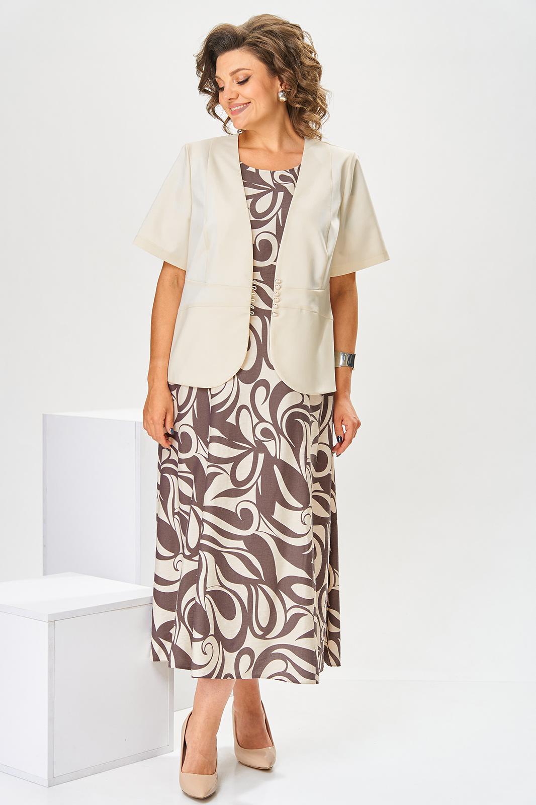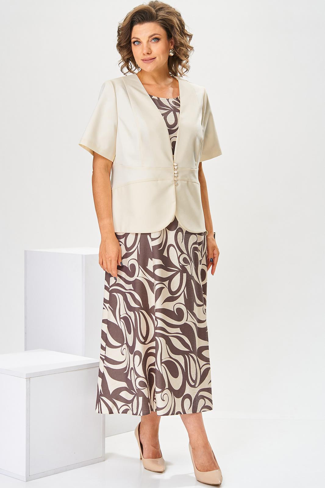 Комплект женский, коктейльное. Комплект женский 2-х предметный жакет и платье. Жакет женский прилегающего силуэта, длиной ниже линии бёдер на 5 см. Перед с 2-мя отрезными рельефами, выходящими из плечевых швов с втачным фигурным поясом. Спинка со средним швом и 2-мя рельефами, выходящими из плечевых швов с втачным фигурным поясом. Низ жакета с притачной баской. Горловина с V-образным вырезом, обтачная без воротника. Застёжка центральная, бортовая на 6-ть навесных петель и 6-ть пришивных пуговиц. Рукав втачной, короткий, одно шовный. Жакет с плечевыми накладками. Платье женское, полу прилегающего силуэта, расширенное к низу, длиной до нижней части икры. Перед с 2-мя рельефами, выходящими из плечевых швов. Спинка с 2-мя рельефами, выходящими из плечевых швов. Горловина круглая обточная без воротника. Рукав втачной, короткий, одно шовный. Застёжка на потайную тесьму-молнию в левом боковом шве платья. Платье без плечевых накладок. Длина спинки жакета 60 см, длина рукава 27 см. Длина спинки платья 125 см, длина рукава 19 см.