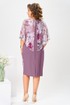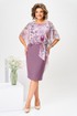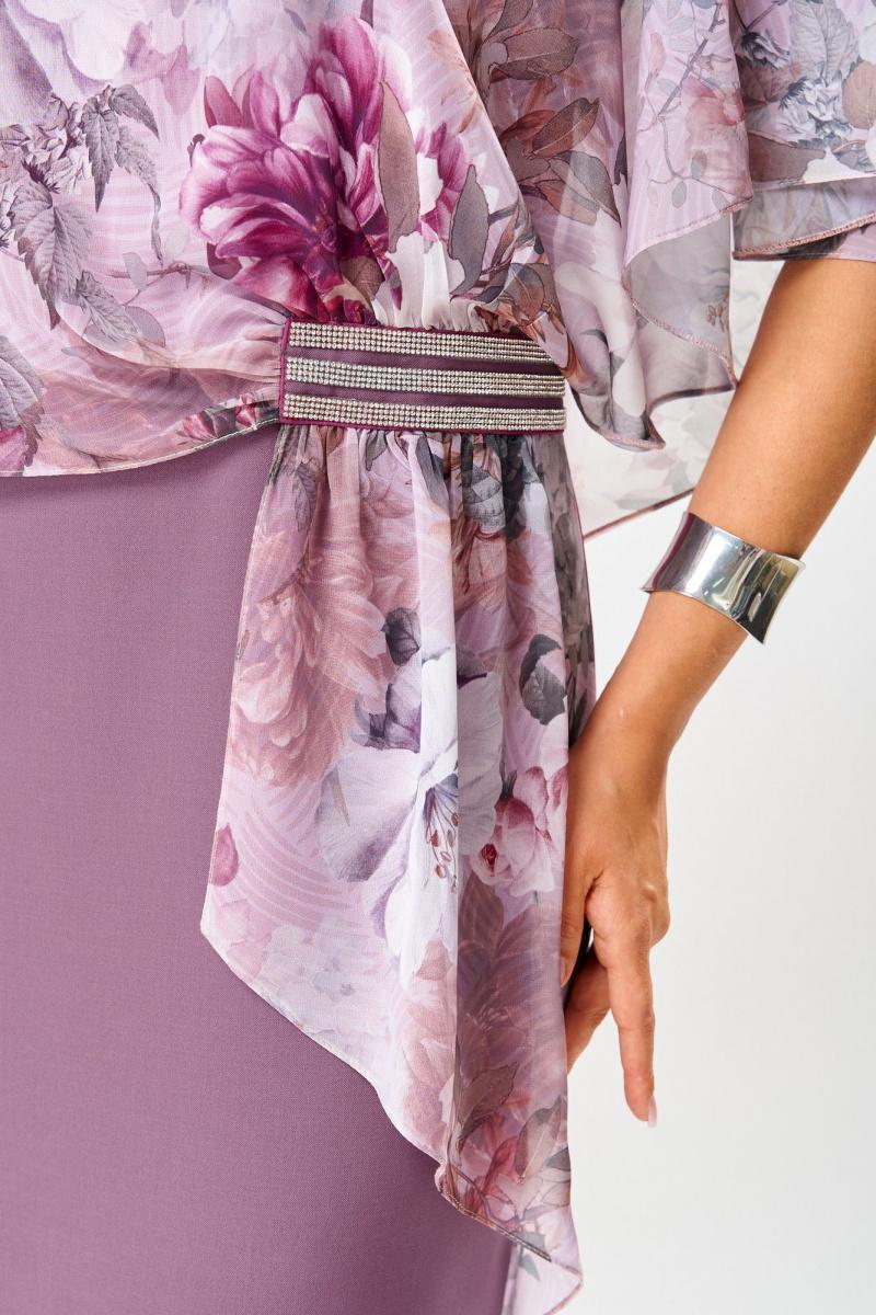 Платье женское относится к нарядной торжественной одежде. Платье полуприлегающего силуэта, с отлетной накидкой длиной за колено. Перед с двумя нагрудными вытачками, с двумя талиевыми вытачками. Спинка с двумя талиевыми вытачками и средним швом, заканчивающимся шлицей. Застежка на потайную тесьму-молнию в среднем шве спинки. Горловина круглая, обтачная, без воротника, по горловине закреплена накидка. Слева на уровне линии талии отделочным хлястиком, декорированным тесьмой накидка закрепляется на платье, нижняя часть накидки закреплена в левом боковом шве. Накидка с фигурным низом. Платье без рукавов. Длина спинки 103 см. Длина накидки от горловины 38 см