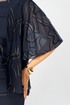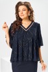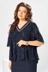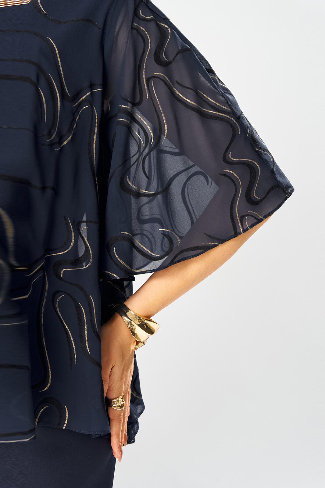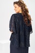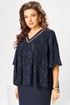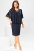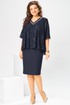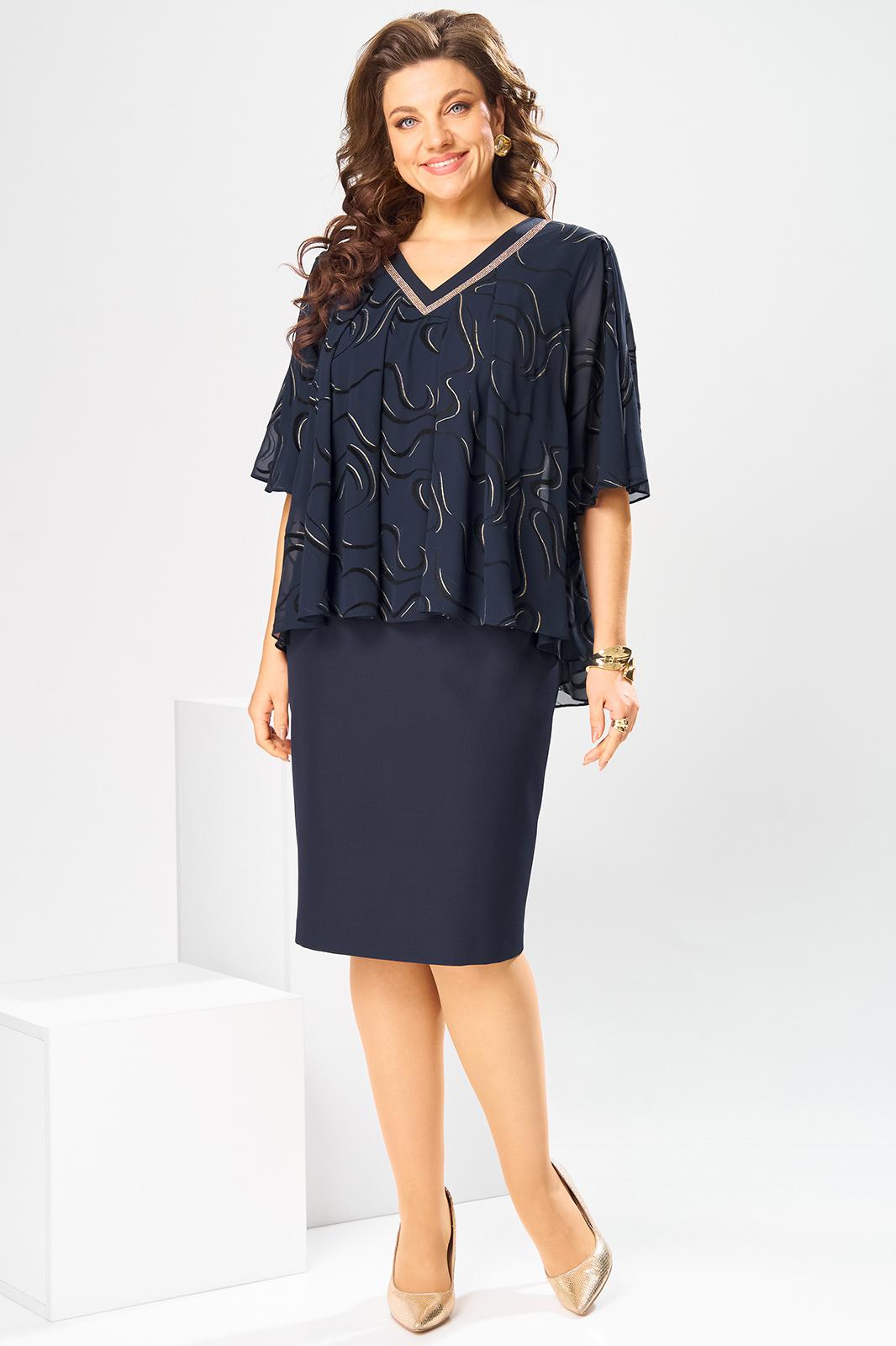 Платье женское относится к нарядной торжественней одежде. Платье полуприлегающего силуэта, длиной за колено. Перед с двумя нагрудными и двумя талиевыми вытачками, с отрезной планкой по горловине, декорированной отделочной термотесьмой. Спинка с двумя талиевыми вытачками и средним швом, заканчивающимся разрезом. Застежка на потайную тесьму-молнию в левом боковом шве платья. По горловине и проймам к платью закреплена отлетная накидка из отделочной ткани. Перед накидки с 4-мя односторонними складками, зафиксированными от горловины. Накидка с фигурным низом. Рукав втачной, одно шовный, расширенный к низу, по окату рукава закреплена глубокая односторонняя складка, рукав длиной до локтя. Платье с плечевыми накладками. Длина спинки 105 см. Длина рукава 35 см