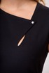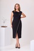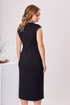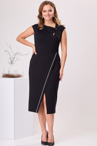 Платье женское, прилегающего силуэта. Платье отрезное по линии талии. Верхняя часть переда с двумя нагрудными выточками. Нижняя часть переда с запахом, с отрезной приточной планкой. Шов притачивания планки декорирован отделочной тесьмой с бусинами. Верхняя часть спинки с двумя таллиевыми выточками и средним швом. Нижняя часть спинки так же с двумя выточками и средним швом. Горловина фигурная, обточная, с обточным разрезом по переду, фиксирующимся на одну пришивную отделочную пуговицу-бусину. Застёжка на потайную тесьму молнию в среднем шве спинки. Платье со спущенным плечом, проймы обточные. Верхняя часть платья (лиф) на подкладке. Платье без плечевых накладок. Длина спинки платья 115 см, ширина спинки 38 см. Ширина плеча 15 см.