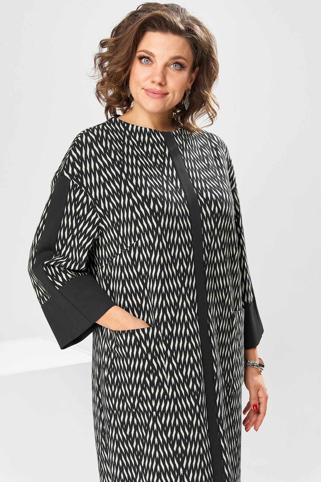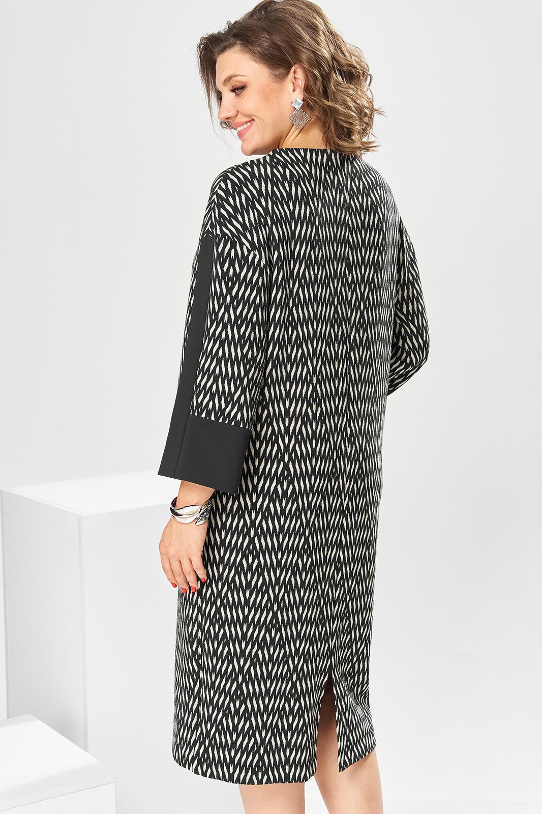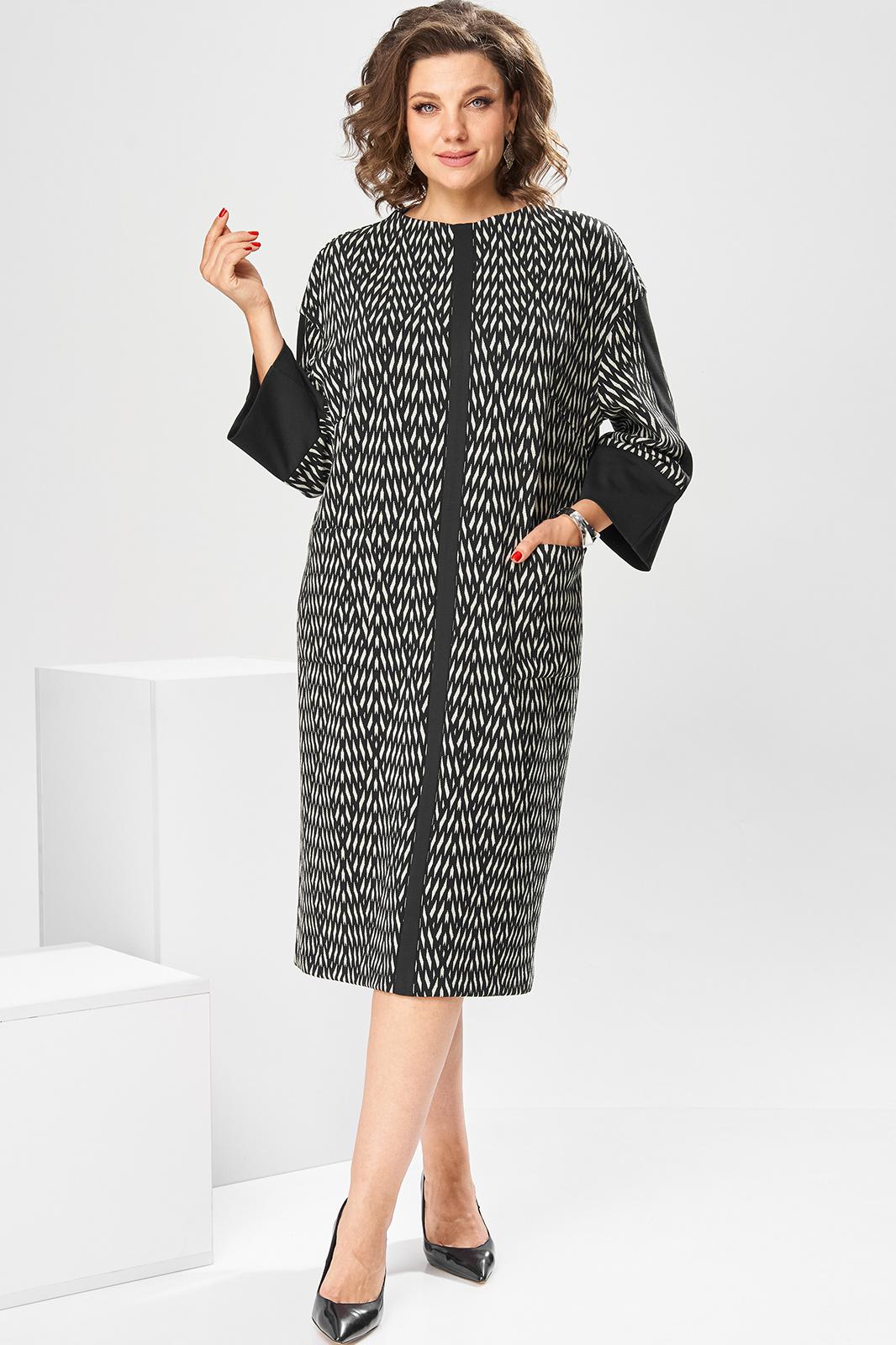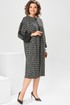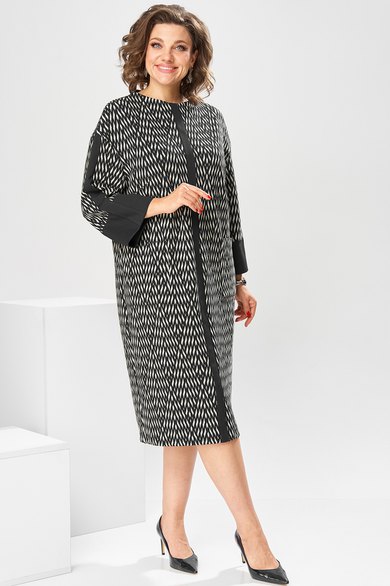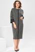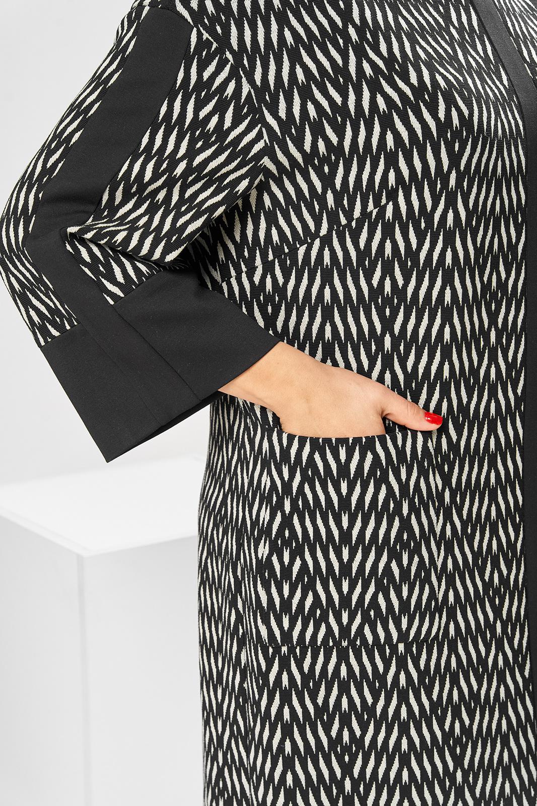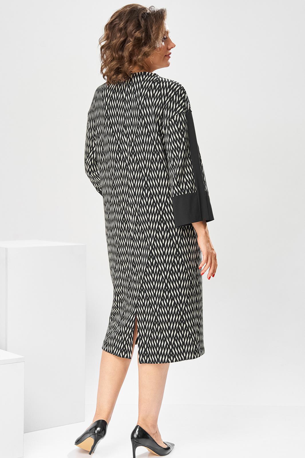 Платье женское для повседневной носки. Платье женское полу прилегающего силуэта, длиной за колено. Перед с 2-мянагрудными выточками, с 2-мя накладными прямоугольными карманами, на уровне линии бёдер, с приточной вертикальной планкой из отделочной ткани. Спинка со средним швом, заканчивающимся разрезом. Застёжка на потайную тесьму-молнию в среднем шве спинки. Горловина с цельнокроеной стойкой, обточная. Платье со спущенным плечом. Рукав втачной, длиной 7/8 с приточной манжетой из отделочной ткани и приточной вертикальной планкой из отделочной ткани по центру. Платье без плечевых накладок. Длина спинки 107 см, длина рукава от горловины 61 см.
