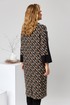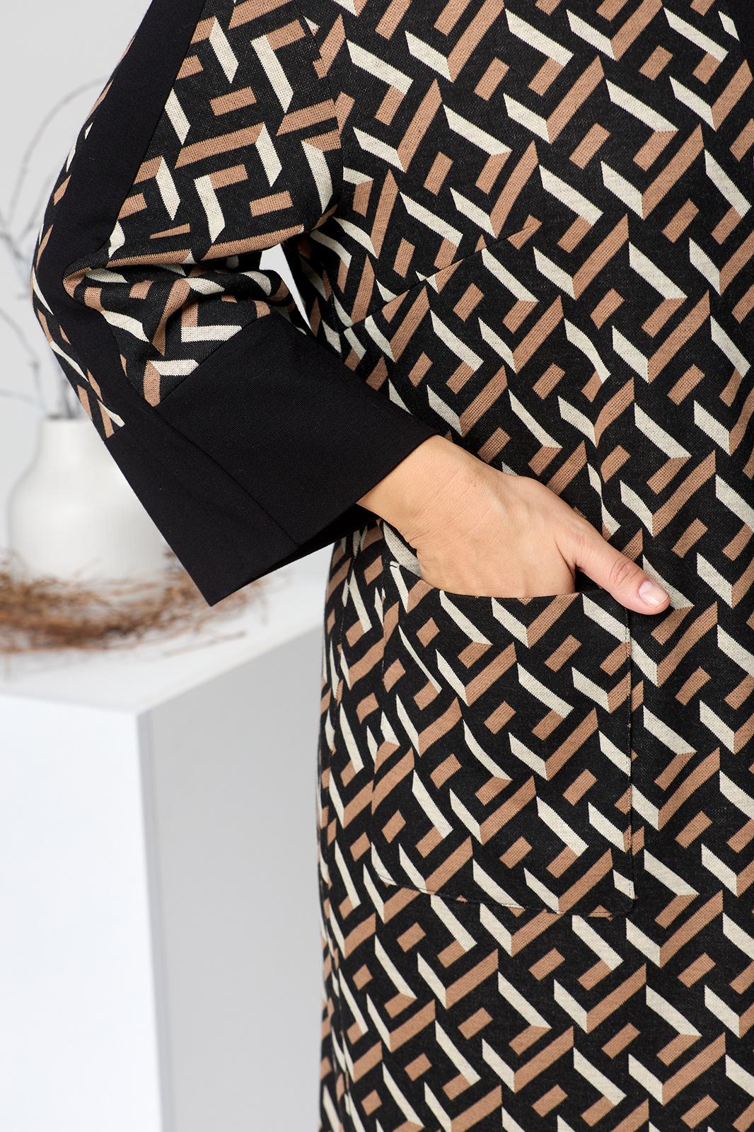 Платье женское для повседневной носки. Платье женское полу прилегающего силуэта, длиной за колено. Перед с 2-мянагрудными выточками, с 2-мя накладными прямоугольными карманами, на уровне линии бёдер, с приточной вертикальной планкой из отделочной ткани. Спинка со средним швом, заканчивающимся разрезом. Застёжка на потайную тесьму-молнию в среднем шве спинки. Горловина с цельнокроеной стойкой, обточная. Платье со спущенным плечом. Рукав втачной, длиной 7/8 с приточной манжетой из отделочной ткани и приточной вертикальной планкой из отделочной ткани по центру. Платье без плечевых накладок. Длина спинки 107 см, длина рукава от горловины 61 см.