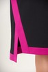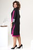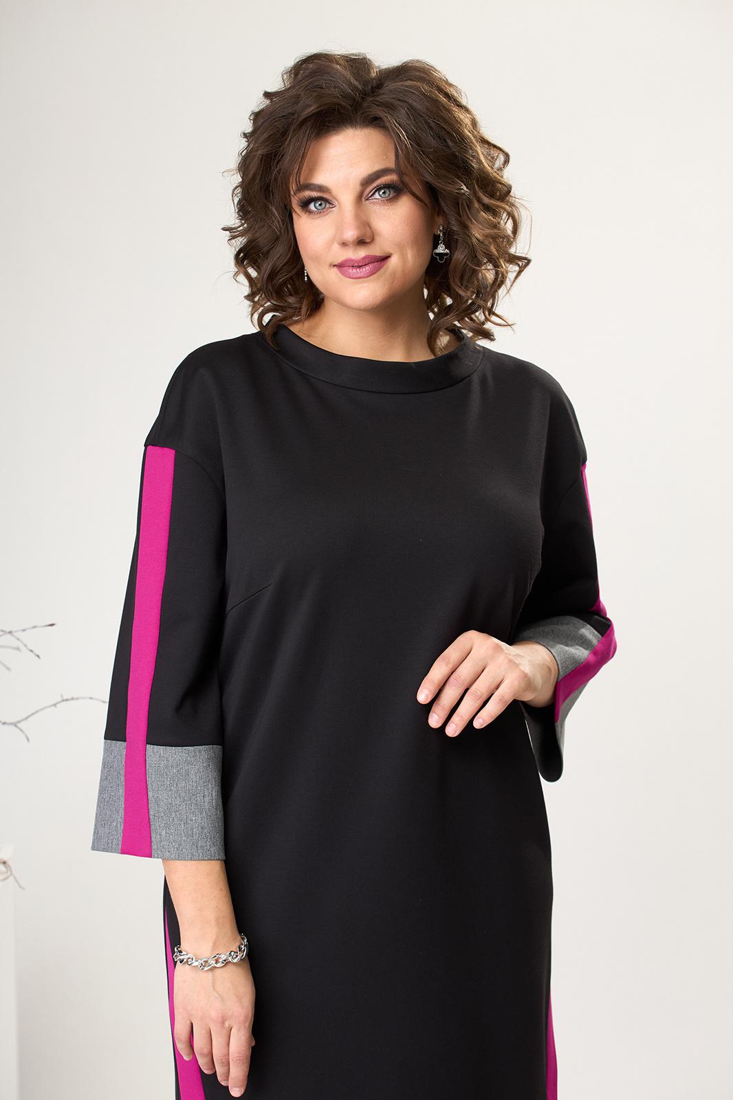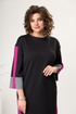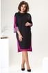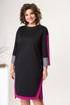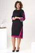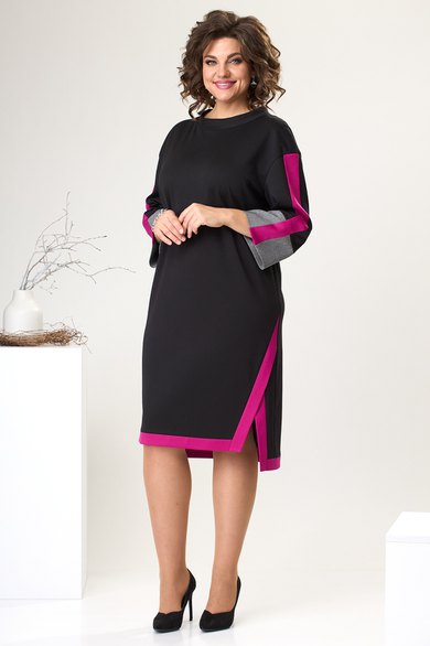 Платье женское для повседневной носки. Платье женское прямого силуэта, длиной за колено, с фигурным низом ступенька. Перед с двумя нагрудными вытачками. Спинка цельнокроеная. Боковые швы с фигурными разрезами. Разрезы и низ платья с приточными планками из отделочной ткани. Горловина круглая с втачной стойкой. Платье со спущенным плечом. Рукав втачной, длиной 7/8, с приточной вертикальной планкой из отделочной ткани по центру и приточной манжетой из отделочной ткани. Платье без плечевых накладок. Длина рукава от горловины 60 см, длина спинки 103 см.
