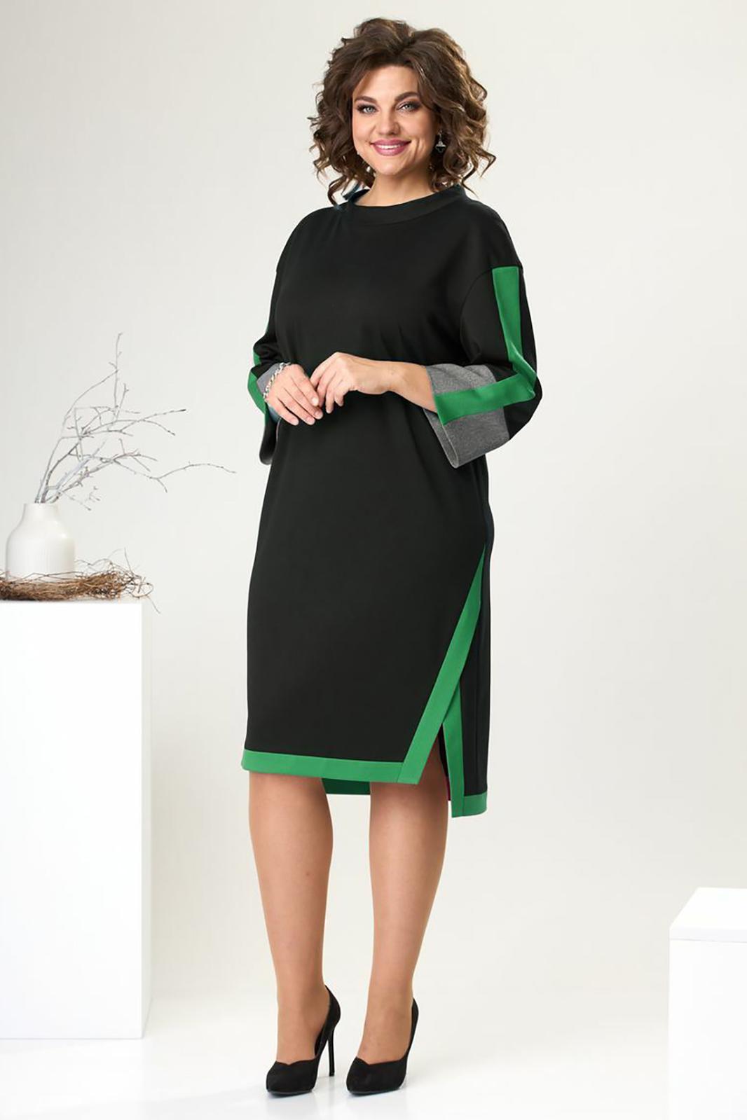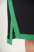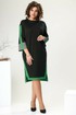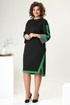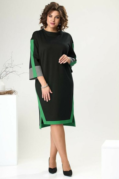 Платье женское для повседневной носки. Платье женское прямого силуэта, длиной за колено, с фигурным низом ступенька. Перед с двумя нагрудными вытачками. Спинка цельнокроеная. Боковые швы с фигурными разрезами. Разрезы и низ платья с приточными планками из отделочной ткани. Горловина круглая с втачной стойкой. Платье со спущенным плечом. Рукав втачной, длиной 7/8, с приточной вертикальной планкой из отделочной ткани по центру и приточной манжетой из отделочной ткани. Платье без плечевых накладок. Длина рукава от горловины 60 см, длина спинки 103 см.