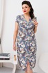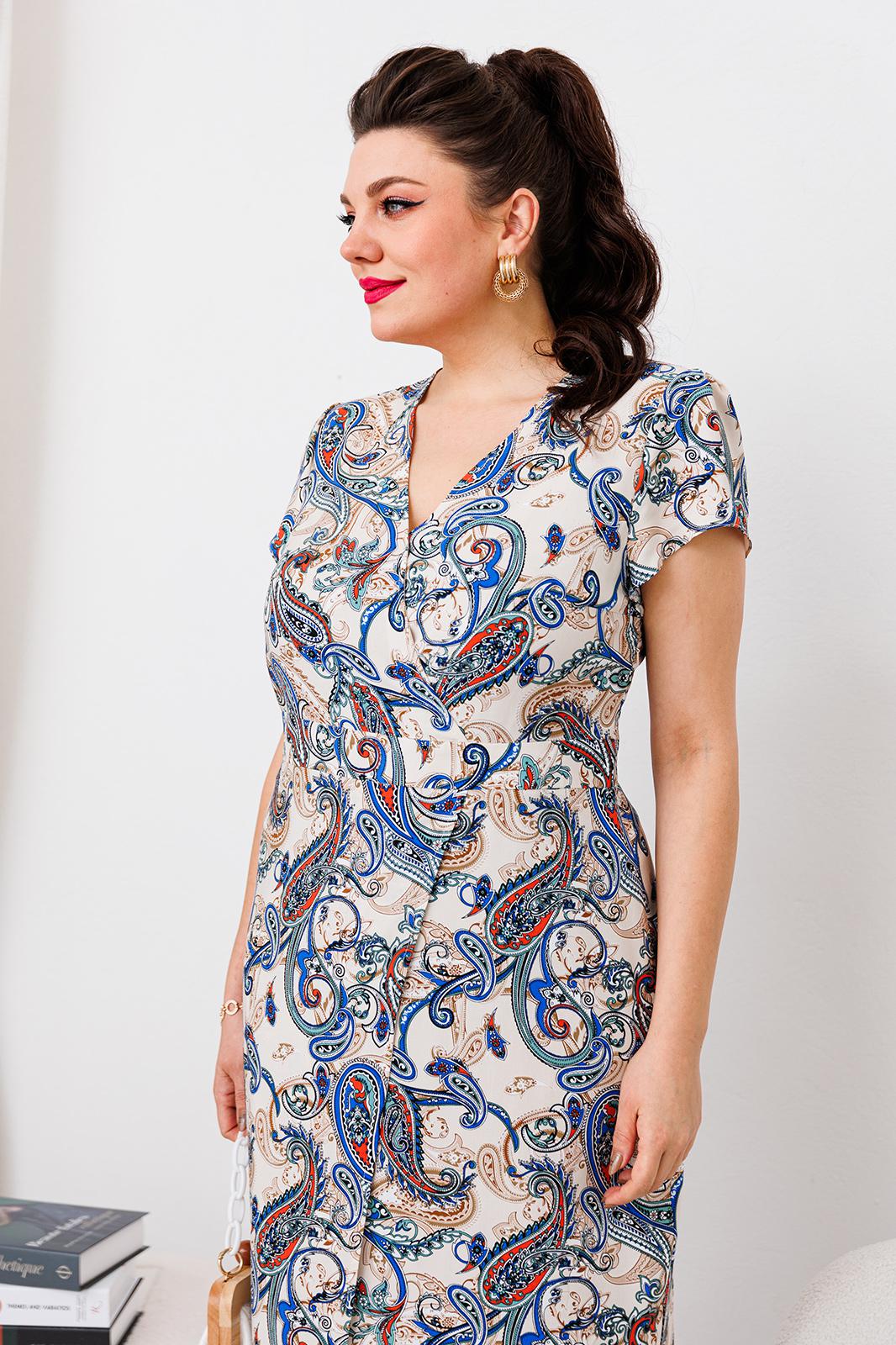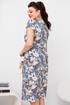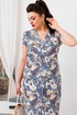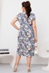 Платье женское, предназначено для повседневной носки. Платье женское полу прилегающего силуэта, длиной до середины икры. Перед с втачным поясом, верхняя часть переда с 2-мя нагрудными вытачками, нижняя часть с запахом. Спинка отрезная по линии талии с втачным поясом, верхняя часть спинки с таллиевыми вытачками. Горловина с V-образным вырезом, с запахом, без воротника. Застёжка на потайную тесьму-молнию в левом боковом шве платья. Рукав короткий одно шовный втачной с фигурным низом, 1-ной встречной складкой по центру оката. Платье без плечевых накладок. Длина спинки 116 см, длина рукава 15,5 см.