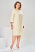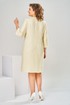 Платье женское, предназначено для повседневной носки. Платье женское А-силуэта, длиной за колено. Перед с 2-мя нагрудными вытачками, с надстрочной вертикальной планкой, декорированной 3-мя пришивными пуговицами, с отрезной притачной планкой по горловине, шов притачивания декорирован отделочной тесьмой с бусинами. Спинка с 2-мя таллиевыми вытачками и средним швом. Платье с карманами в боковых швах. Горловина круглая, обточная, без воротника. Застёжка на потайную тесьму-молнию в среднем шве спинки. Рукав втачной, 2х шовный, длиной 3/4. Платье на подкладке. Платье с плечевыми накладками. Длина спинки платья 98 см. Длина рукава 48 см.