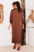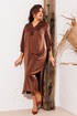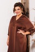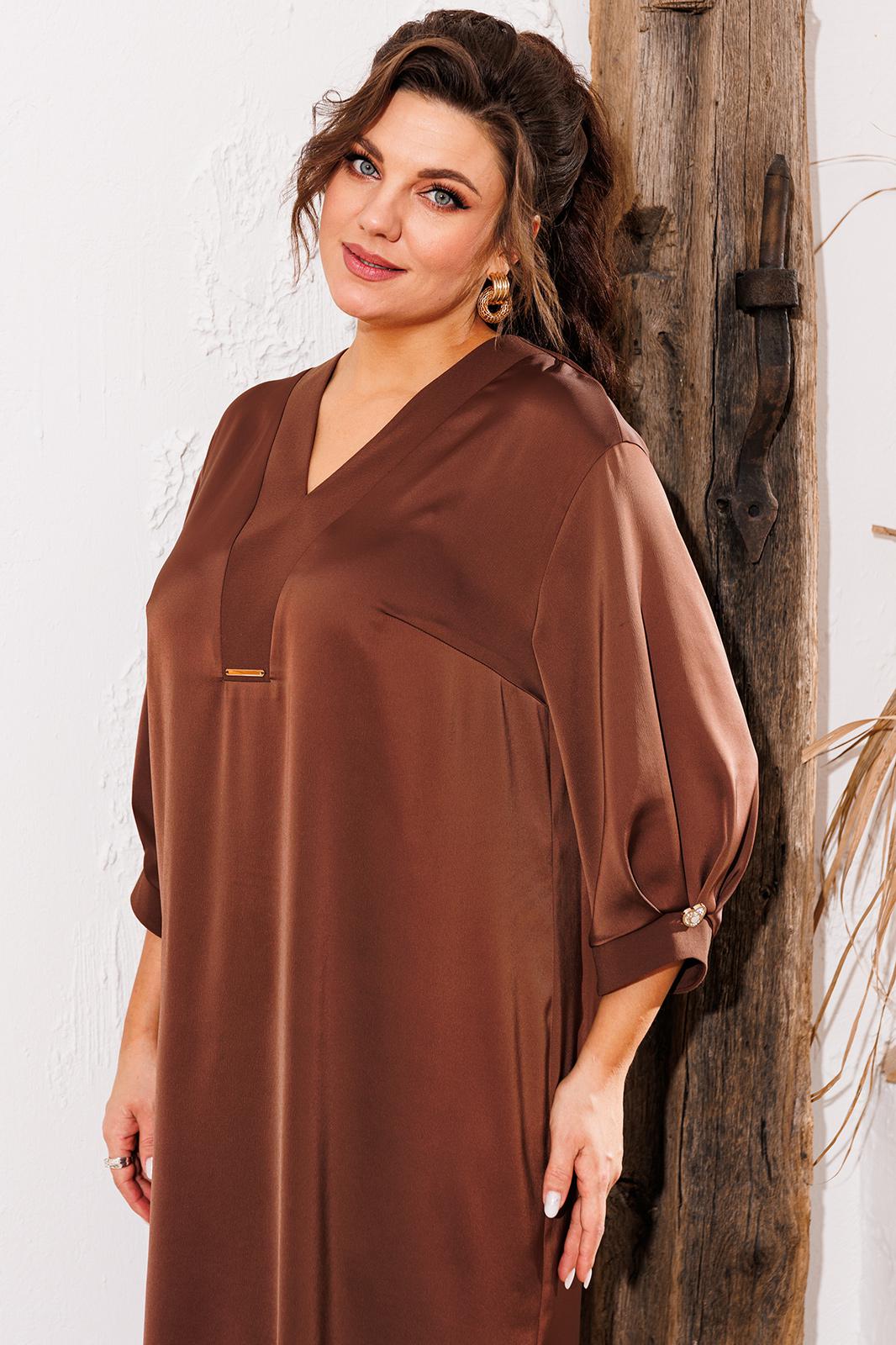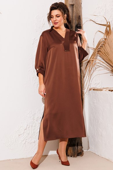 Платье женское относится к торжественной одежде. Платье женское прямого силуэта, длиной до нижней части икры. Перед с 2-мя нагрудными вытачками с втачной планкой по горловине, декорированной пришивной металлической пластиной. Спинка цельнокроеная. Боковые швы с разрезами. Горловина с V-образным вырезом, обточная, без воротника. Платье со спущенным плечом. Рукав втачной, одно шовный, длиной 3/4, низ рукава с 2-мя односторонними складками и 1-ной встречной, с притяжной фигурной манжетой. Рукав декорирован пришивной пуговицей на встречной складке. Платье без плечевых накладок. Длина спинки платья 126 см, длина рукава 40 см.