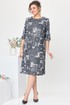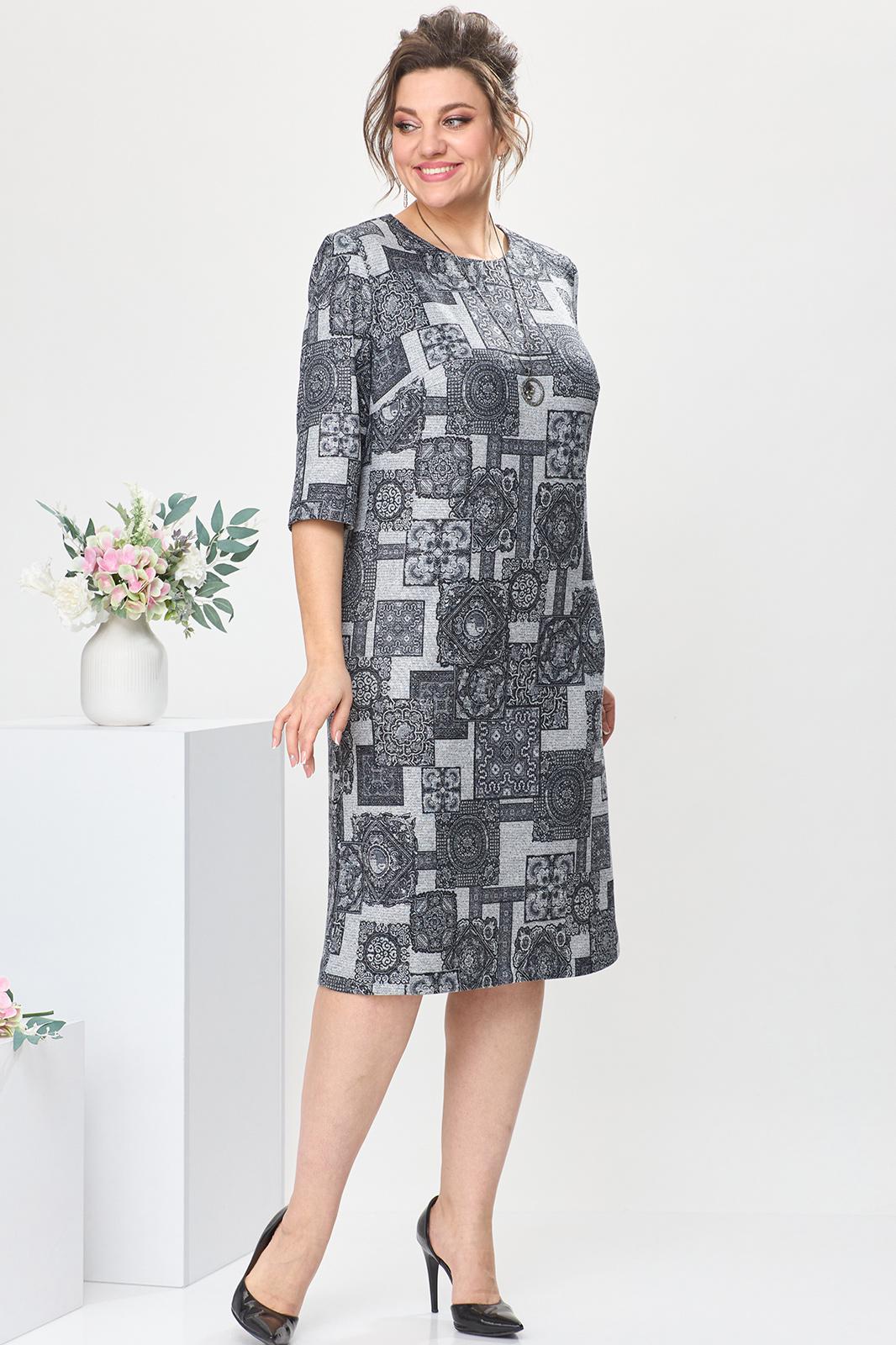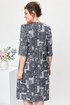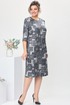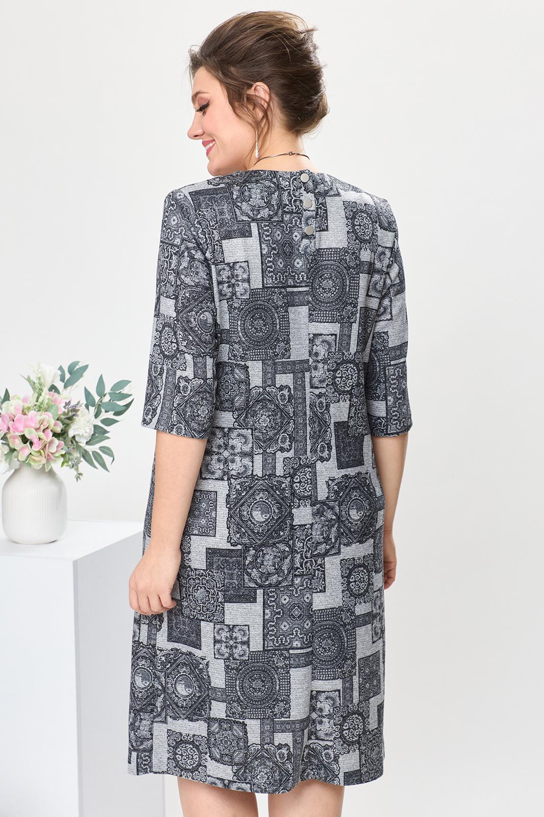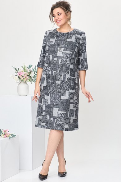 Платье женское предназначено для повседневной носки. Платье женское прямого силуэта, длиной за колено. Перед с двумя нагрудными вытачками. Спинка со средним швом, с двумя втачными планками вверху среднего шва. Застежка на три пробивных металлических кнопки на планках спинки. Горловина круглая, обтачная, без воротника. Рукав втачной, одношовный, длиной за локоть. В боковых швах платья обработаны карманы. Платье с плечевыми накладками. К платью прилагается съемное украшение. Длина платья 105 см. Длина рукава 40 см.