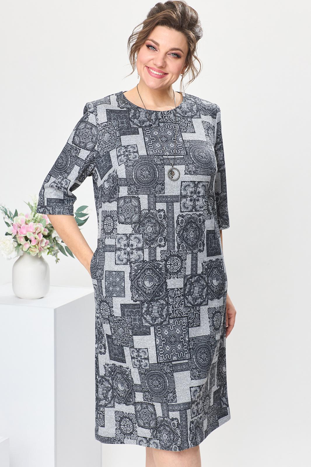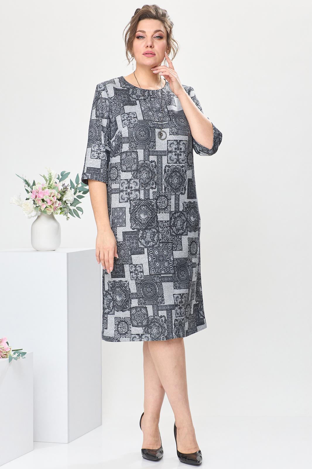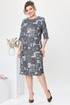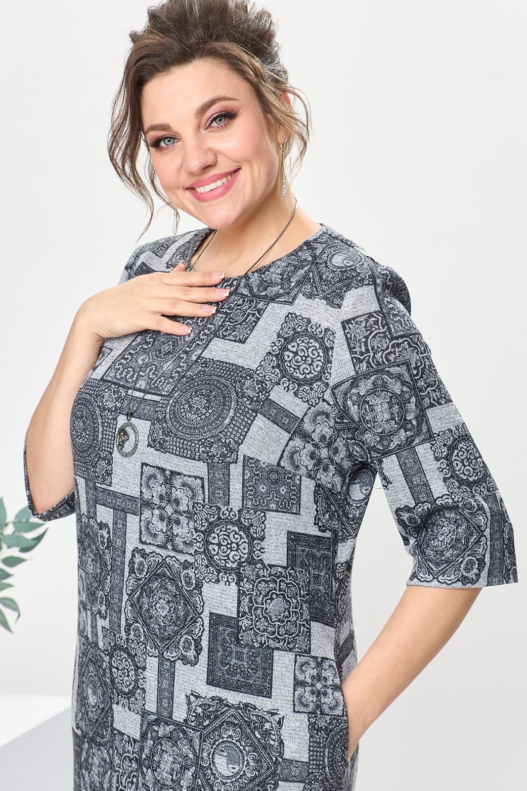 Платье женское предназначено для повседневной носки. Платье женское прямого силуэта, длиной за колено. Перед с двумя нагрудными вытачками. Спинка со средним швом, с двумя втачными планками вверху среднего шва. Застежка на три пробивных металлических кнопки на планках спинки. Горловина круглая, обтачная, без воротника. Рукав втачной, одношовный, длиной за локоть. В боковых швах платья обработаны карманы. Платье с плечевыми накладками. К платью прилагается съемное украшение. Длина платья 105 см. Длина рукава 40 см.