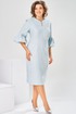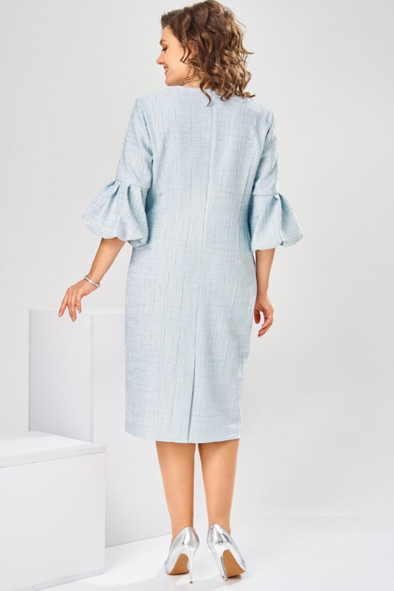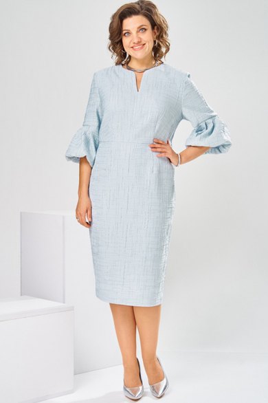 Платье женское, относится к торжественной нарядной одежде. Платье женское, полу прилегающего силуэта, длиной ниже колена. Перед отрезной по линии талии. Верхняя часть переда со средним швом и 2-мя таллиевыми вытачками, нижняя часть с 2-мя таллиевыми вытачками. Спинка с 2-мя таллиевыми вытачками и средним швом, заканчивающимся шлицей. Горловина фигурная, обточная, без воротника. Застёжка на потайную тесьму-молнию в среднем шве спинки. Рукав втачной, одно шовный, длиной 3/4, с горизонтальным разрезом, нижняя часть рукава с 5-ю односторонними складками, со сборкой по низу, низ обточной. Платье на подкладке с плечевыми накладками. Длина спинки платье 111 см, длина рукава 45 см.