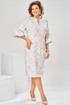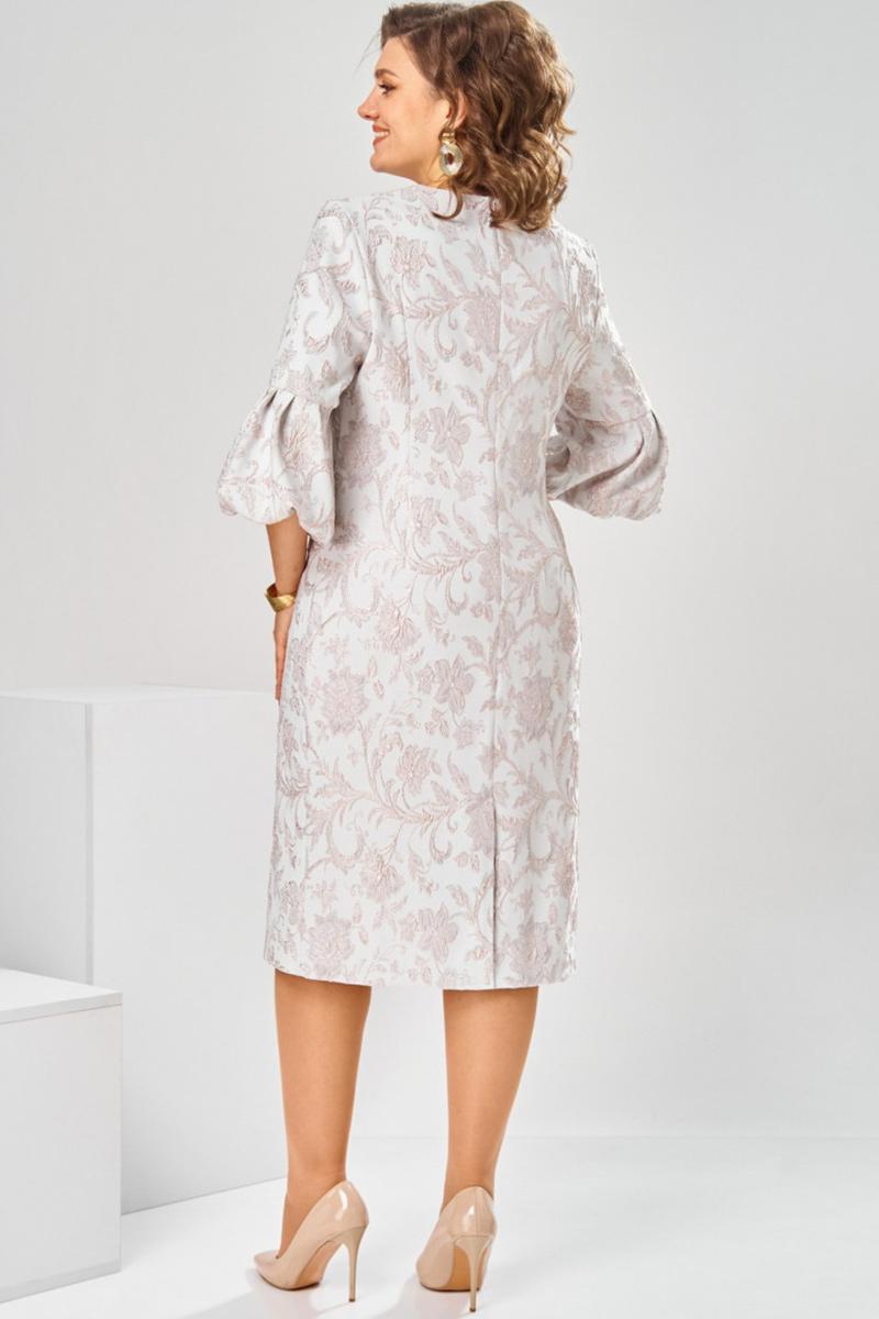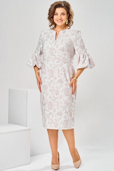 Платье женское, относится к торжественной нарядной одежде. Платье женское, полу прилегающего силуэта, длиной ниже колена. Перед отрезной по линии талии. Верхняя часть переда со средним швом и 2-мя таллиевыми вытачками, нижняя часть с 2-мя таллиевыми вытачками. Спинка с 2-мя таллиевыми вытачками и средним швом, заканчивающимся шлицей. Горловина фигурная, обточная, без воротника. Застёжка на потайную тесьму-молнию в среднем шве спинки. Рукав втачной, одно шовный, длиной 3/4, с горизонтальным разрезом, нижняя часть рукава с 5-ю односторонними складками, со сборкой по низу, низ обточной. Платье на подкладке с плечевыми накладками. Длина спинки платье 111 см, длина рукава 45 см.