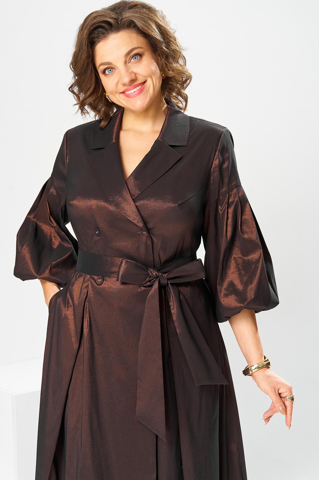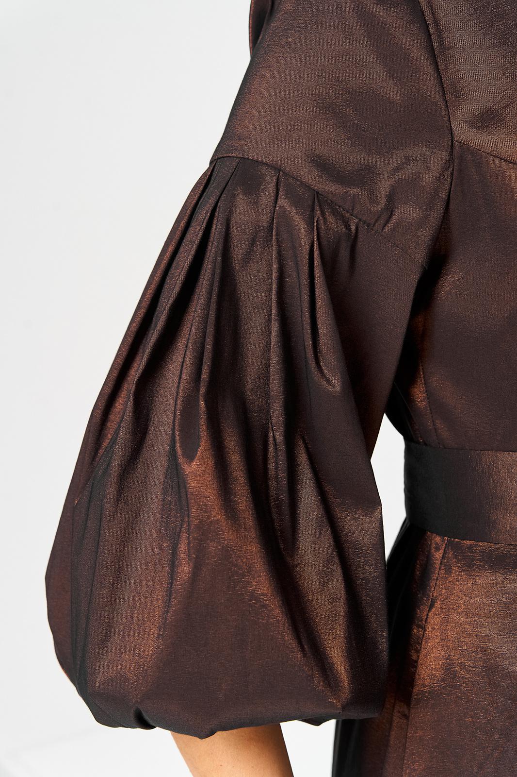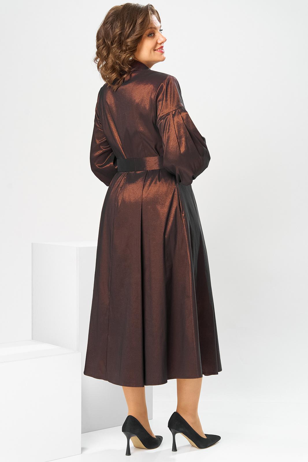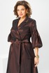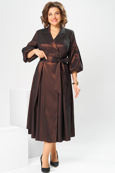 Платье женское, относится к торжественной одежде. Платье женское отрезное по линии талии, расширенное к низу, длиной до нижней части икры. Верхняя часть переда с 2-мя наружными выточками, нижняя часть с 2-мя односторонними складками. Верхняя часть спинки с 2-мя таллиевыми выточками, нижняя часть спинки с 2-мя односторонними складками. В боковых швах обработаны карманы. Горловина с V-образным вырезом, с вточным воротничком пиджачного типа с отрезным отложным лацканом. Застёжка центральная 2-х бортная на 4-и обмётанные петли и 4-и пришивные пуговицы. Рукав вточной одно шовный, длиной 3/4 с горизонтальным подрезом, нижняя часть рукава с 6-ю односторонними складками, низ рукава расширенный, обтачной, собран на эластичную тесьму. Рукав на подкладке. Платье на отлетной подкладке. Платье с плечевыми накладками. К платью прилагается съёмный пояс. Длина спинки платья 130 см, длина рукава 47 см.