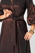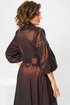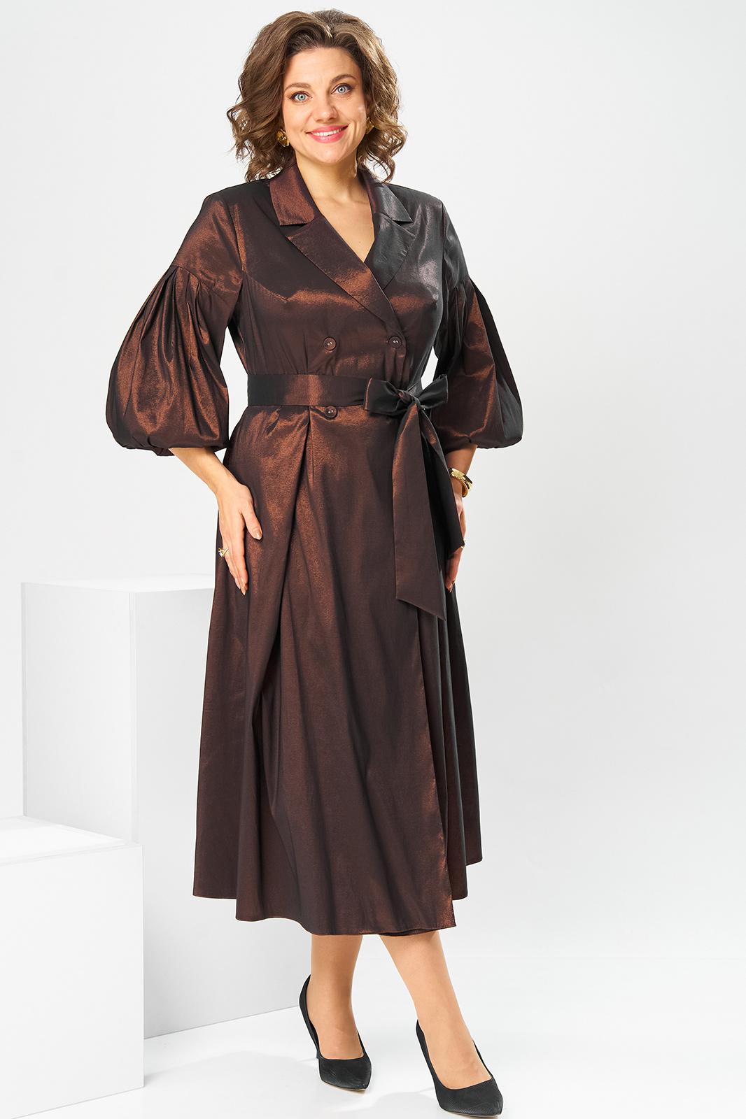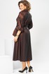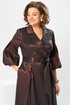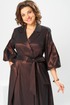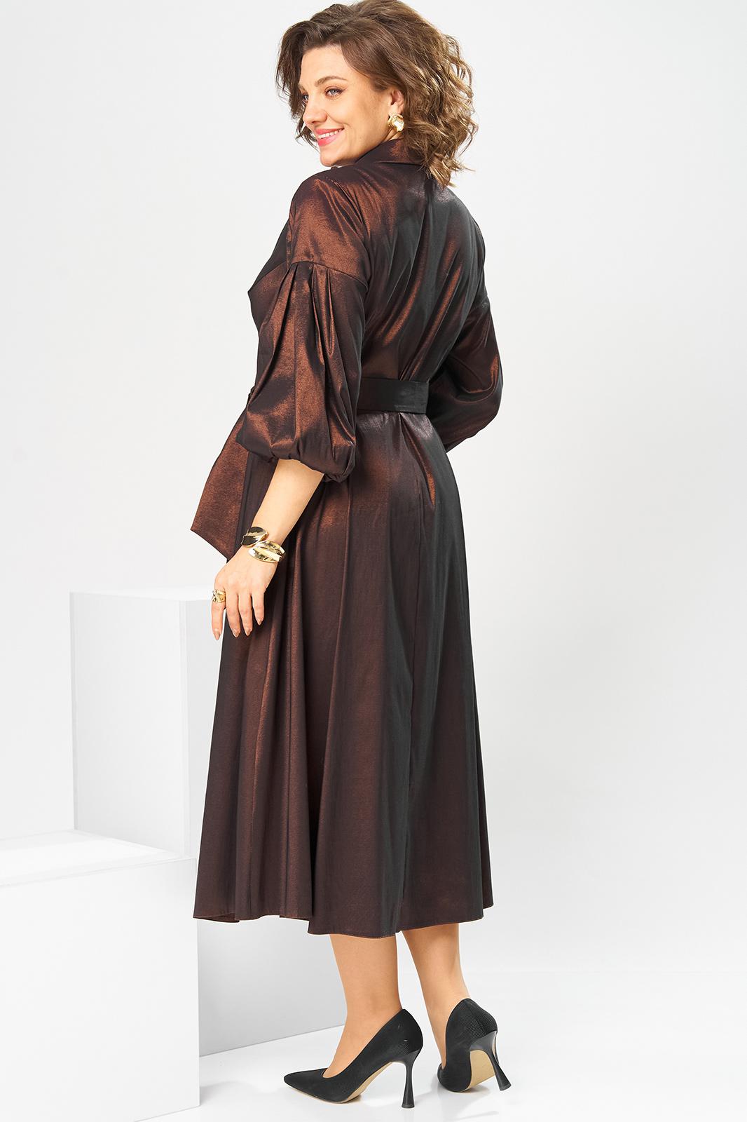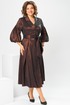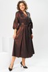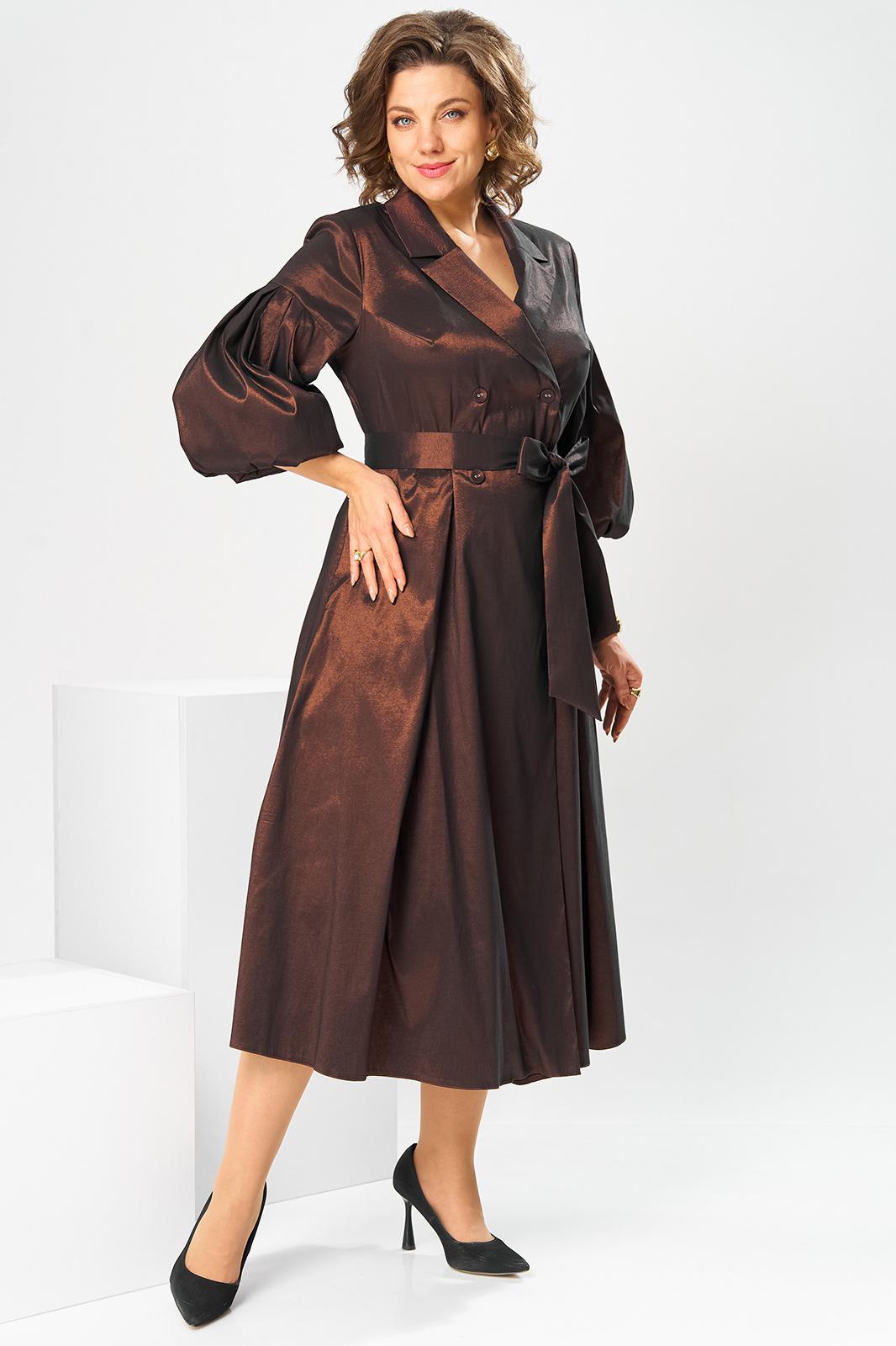 Платье женское, относится к торжественной одежде. Платье женское отрезное по линии талии, расширенное к низу, длиной до нижней части икры. Верхняя часть переда с 2-мя наружными выточками, нижняя часть с 2-мя односторонними складками. Верхняя часть спинки с 2-мя таллиевыми выточками, нижняя часть спинки с 2-мя односторонними складками. В боковых швах обработаны карманы. Горловина с V-образным вырезом, с вточным воротничком пиджачного типа с отрезным отложным лацканом. Застёжка центральная 2-х бортная на 4-и обмётанные петли и 4-и пришивные пуговицы. Рукав вточной одно шовный, длиной 3/4 с горизонтальным подрезом, нижняя часть рукава с 6-ю односторонними складками, низ рукава расширенный, обтачной, собран на эластичную тесьму. Рукав на подкладке. Платье на отлетной подкладке. Платье с плечевыми накладками. К платью прилагается съёмный пояс. Длина спинки платья 130 см, длина рукава 47 см.