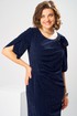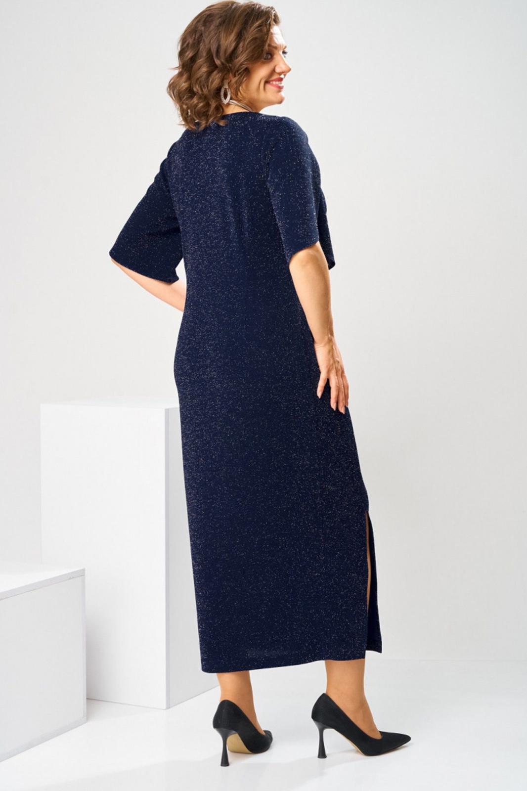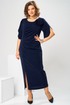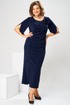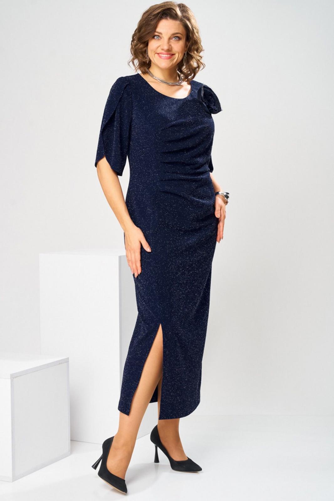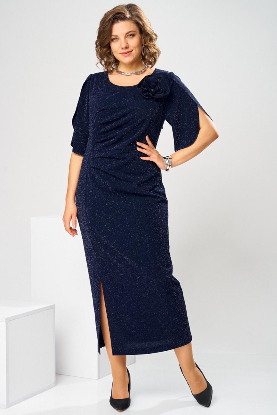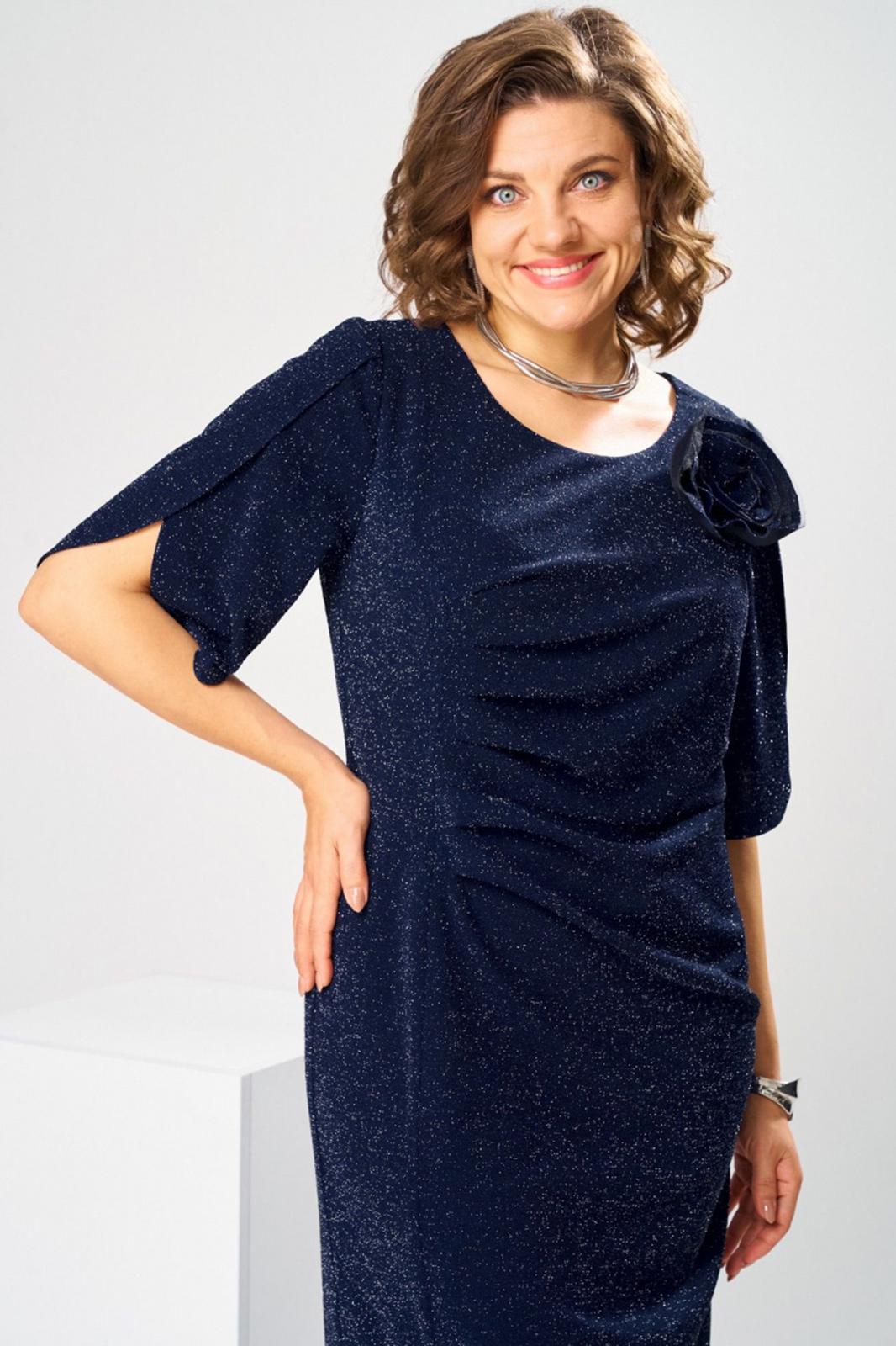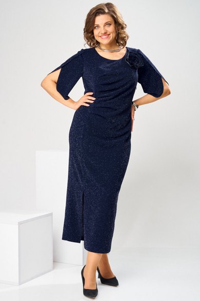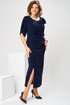 Платье женское, предназначено к нарядной торжественной одежде. Платье женское, полу прилегающего силуэта, длиной до нижней части икры. Перед с 1-ним отрезным бочком справа, шов соединения его с передом заканчивается разрезом, перед отрезной по линии талии, верхняя часть с 4-мя зафиксированными складками, нижняя часть с 2-мя такими же складками расположенными справа по шву притачивания бочка. Спинка с 2-мя таллиевыми вытачками. Горловина круглая обточная без воротника. Застёжка на потайную тесьму-молнию в левом боковом шве платья. Рукав втачной, длиной до локтя с запахом по окату с закруглёнными концами. Платье на подкладке. Платье с плечевыми накладками. К платью прилагается съёмное украшение. Длина платья 128 см. Длина рукава 34 см.