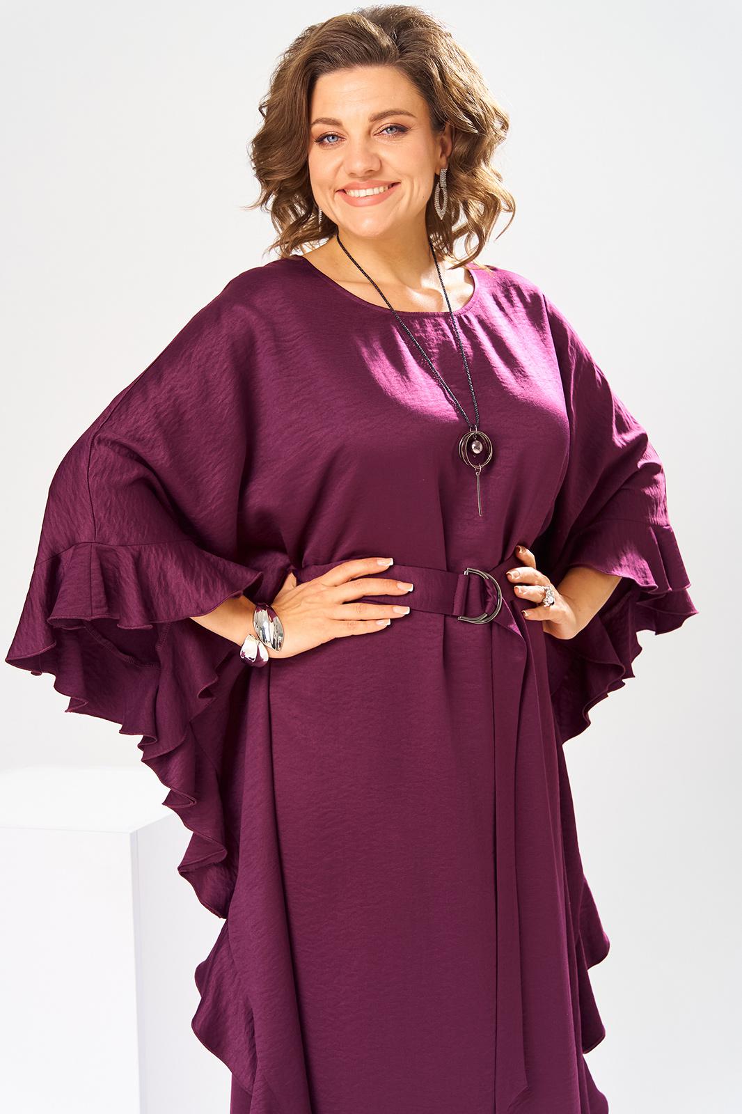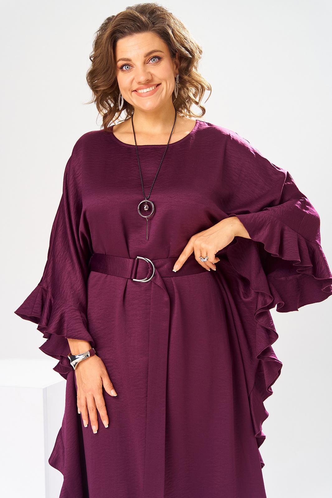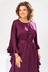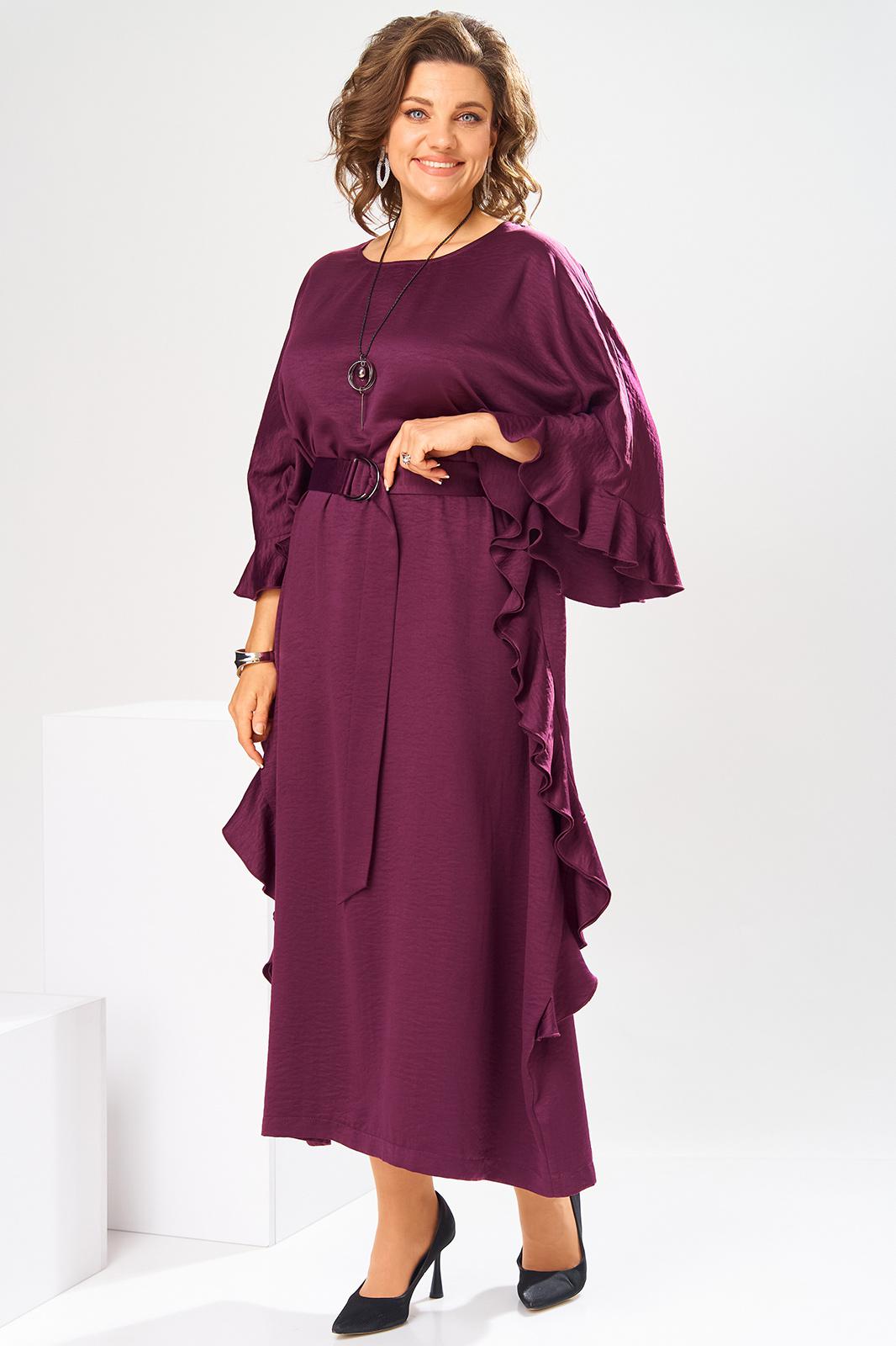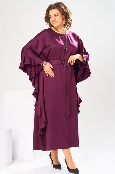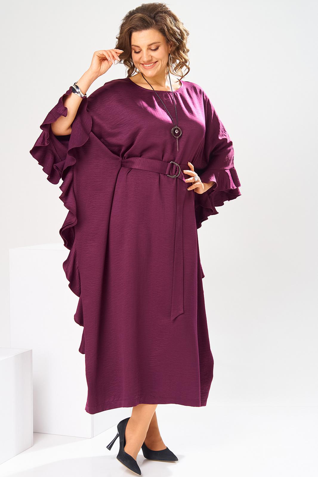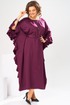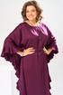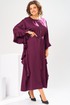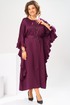 Платье женское, относится к нарядной торжественной одежде. Платье пончо свободного кроя, длинное. Перед цельнокроеный. Спинка со средним швом, вверху с разрезом, фиксирующимся по горловине на 1-ну навесную петлю и 1-ну пришивную пуговицу. Горловина круглая, обточная, без воротника, по переду горловины отделочная строчка 0,6 см. Рукав цельнокроеный удлинённый. Низ рукава и боковые швы декорированы приточной оборкой. По боковым швам зафиксирован уровень пройм и место расположения петель на уровне линии талии отделочными строчками. К платью прилагается съёмный пояс с пряжкой, фиксируемые на платье в петли на уровне линии талии. Платье без плечевых накладок. Длина спинки платья 132 см, ширина на уровне глубины проймы 66 см, ширина по линии талии 66 см, ширина плеча+длина рукава 56,5 см.