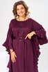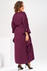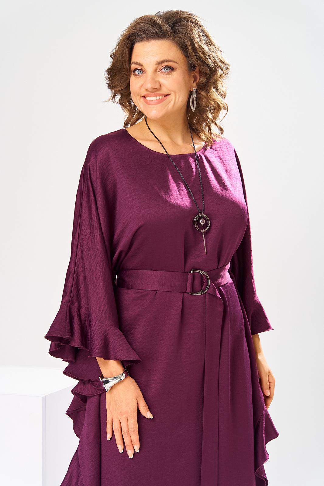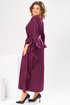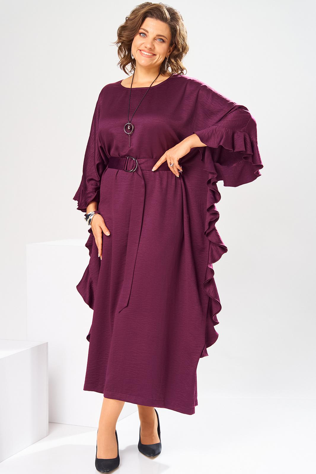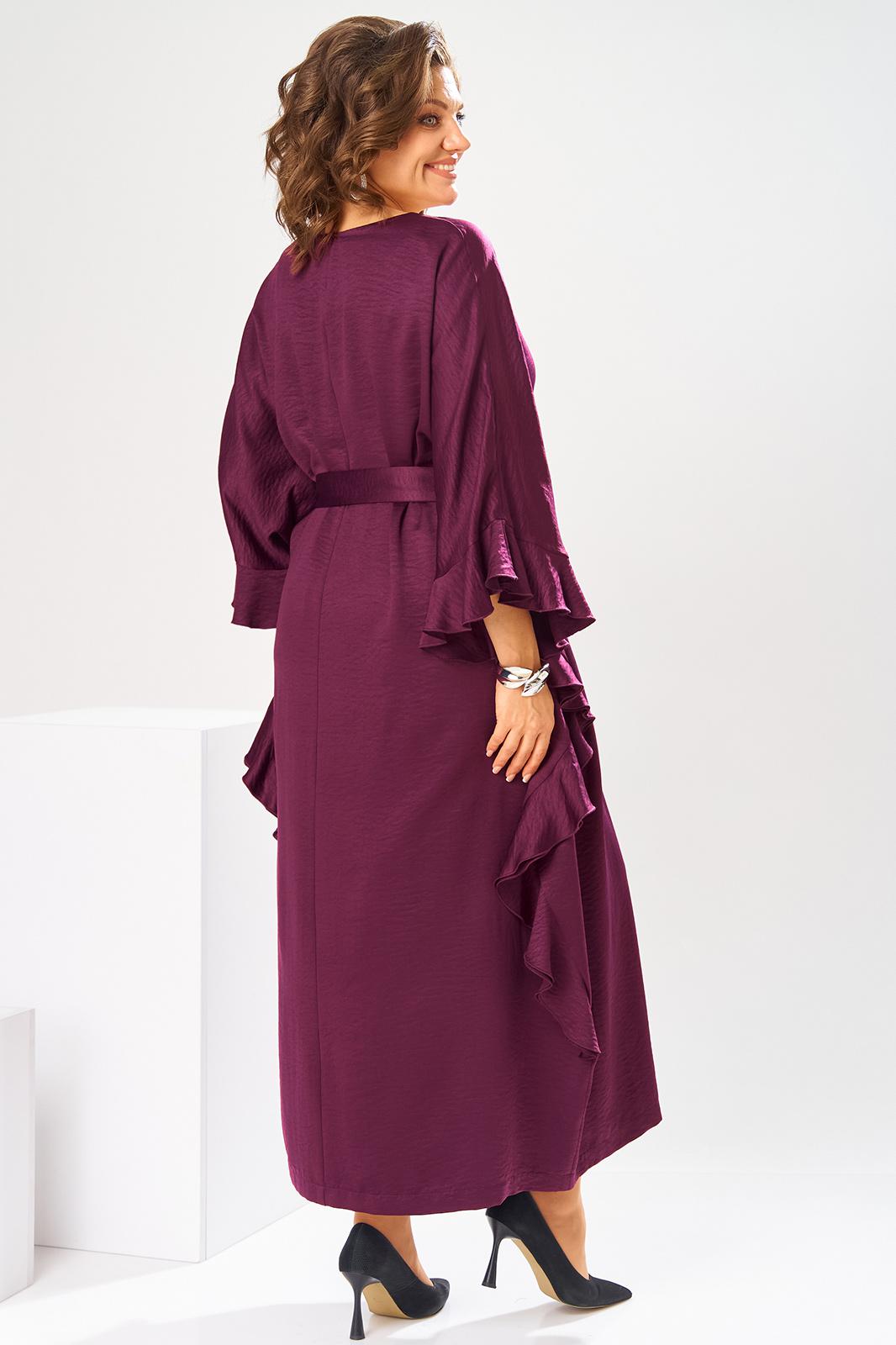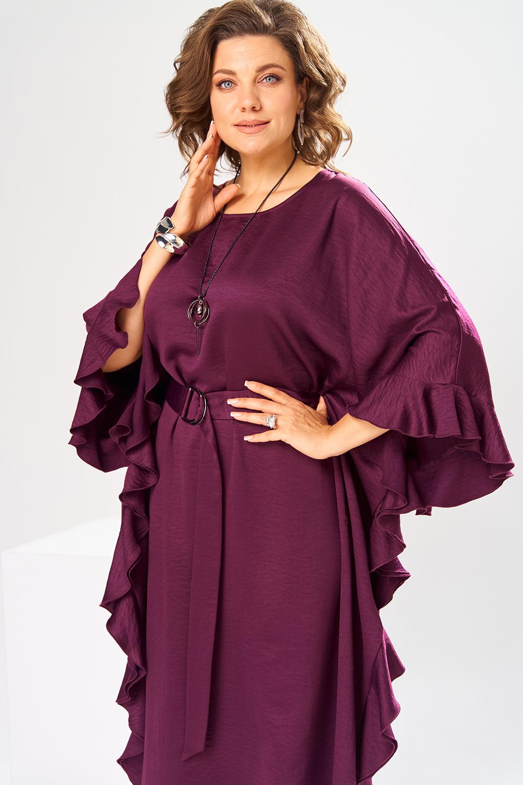 Платье женское, относится к нарядной торжественной одежде. Платье пончо свободного кроя, длинное. Перед цельнокроеный. Спинка со средним швом, вверху с разрезом, фиксирующимся по горловине на 1-ну навесную петлю и 1-ну пришивную пуговицу. Горловина круглая, обточная, без воротника, по переду горловины отделочная строчка 0,6 см. Рукав цельнокроеный удлинённый. Низ рукава и боковые швы декорированы приточной оборкой. По боковым швам зафиксирован уровень пройм и место расположения петель на уровне линии талии отделочными строчками. К платью прилагается съёмный пояс с пряжкой, фиксируемые на платье в петли на уровне линии талии. Платье без плечевых накладок. Длина спинки платья 132 см, ширина на уровне глубины проймы 66 см, ширина по линии талии 66 см, ширина плеча+длина рукава 56,5 см.