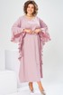 Платье женское, относится к нарядной торжественной одежде. Платье пончо свободного кроя, длинное. Перед цельнокроеный. Спинка со средним швом, вверху с разрезом, фиксирующимся по горловине на 1-ну навесную петлю и 1-ну пришивную пуговицу. Горловина круглая, обточная, без воротника, по переду горловины отделочная строчка 0,6 см. Рукав цельнокроеный удлинённый. Низ рукава и боковые швы декорированы приточной оборкой. По боковым швам зафиксирован уровень пройм и место расположения петель на уровне линии талии отделочными строчками. К платью прилагается съёмный пояс с пряжкой, фиксируемые на платье в петли на уровне линии талии. Платье без плечевых накладок. Длина спинки платья 132 см, ширина на уровне глубины проймы 66 см, ширина по линии талии 66 см, ширина плеча+длина рукава 56,5 см.