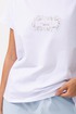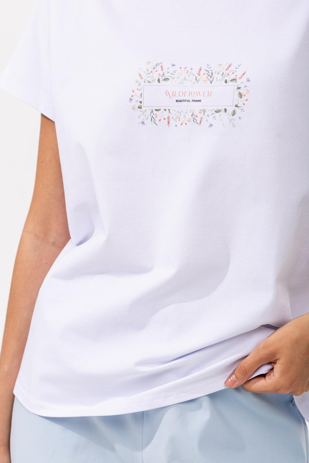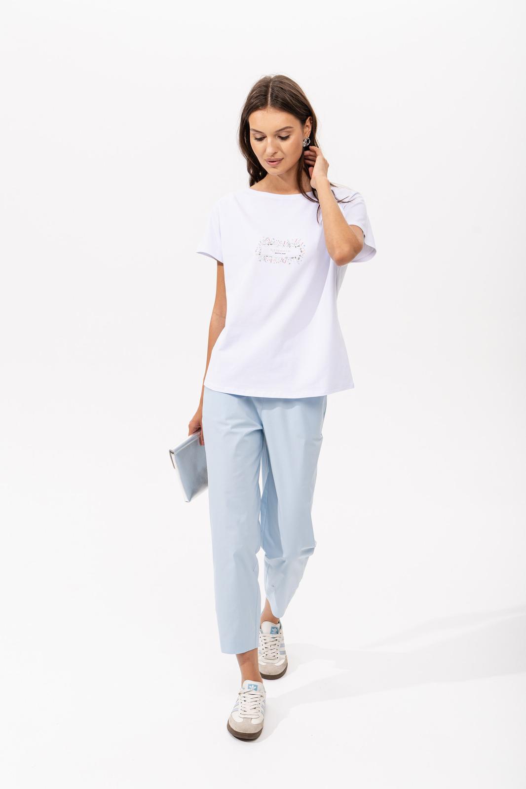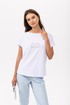 Свободный крой , короткие рукава и круглый вырез, дополненный блестящим принтом;
