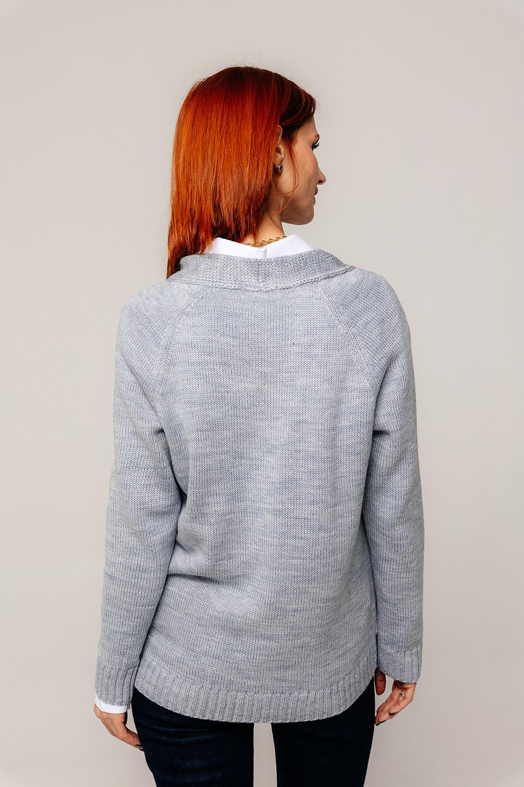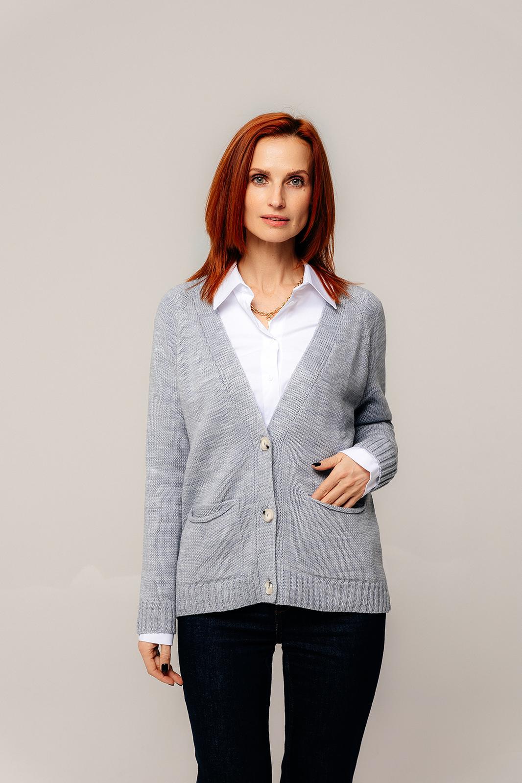 Женский трикотажный жакет из мягкого материала. Изготовлен из высококачественной дышащей пряжи, выполнен переплетением кулирная гладь, очень мягкий и приятный к телу. Свободный и эргономичный крой. Базовая модель с втачными прямыми рукавами для повседневной носки. Длина жакета до середины бедра, V-образный неглубокий вырез, рукав-реглан, накладные карманы, пуговицы. Жакет прост в уходе, после стирки не линяет. Носи его в офис, а также на встречу с друзьями. Этот уютный и мягкий джемпер, будет прекрасно сочетается с брюками палаццо, платьями и джинсами. Длина изделия по спинке 57 см, длина рукава 64 см.