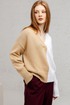 Джемпер прямого силуэта с заниженной линией плеча. Рукав рубашечный, длинный. Изготовлен джемпер из пряжи, в состав которой входит хлопок 50%, Пан 50%. Вырез горловины V-образный обработан накеттлёванной бейкой. Части переда и спинки выполнены из пряжи разного цвета. Джемпер очень мягкий и приятный к телу, вывязан переплетением кулирная гладь . Низ изделия и рукавов связан переплетением ластик 2*2.