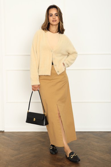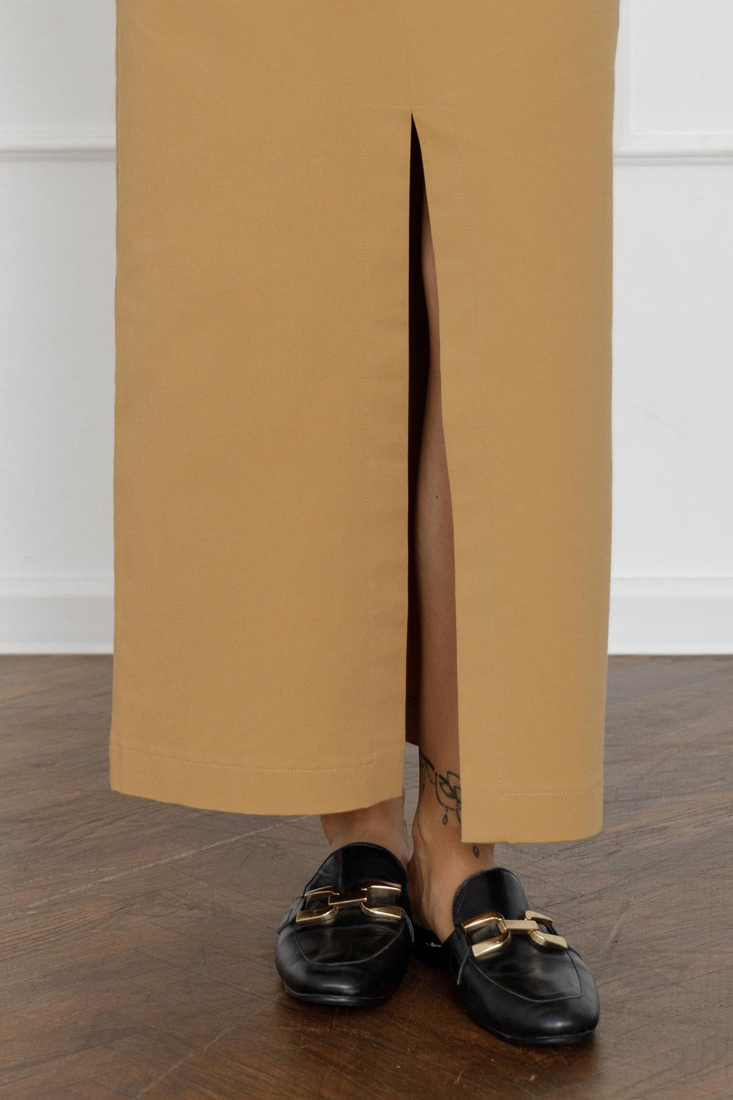 Дизайн: юбка-карандаш с высоким поясом и разрезом спереди, подчёркивающая силуэт;