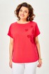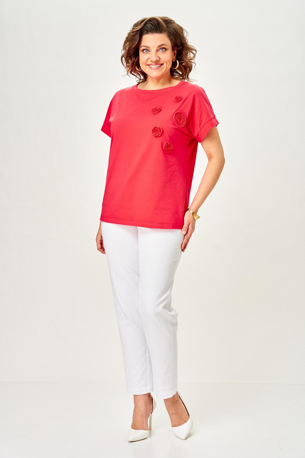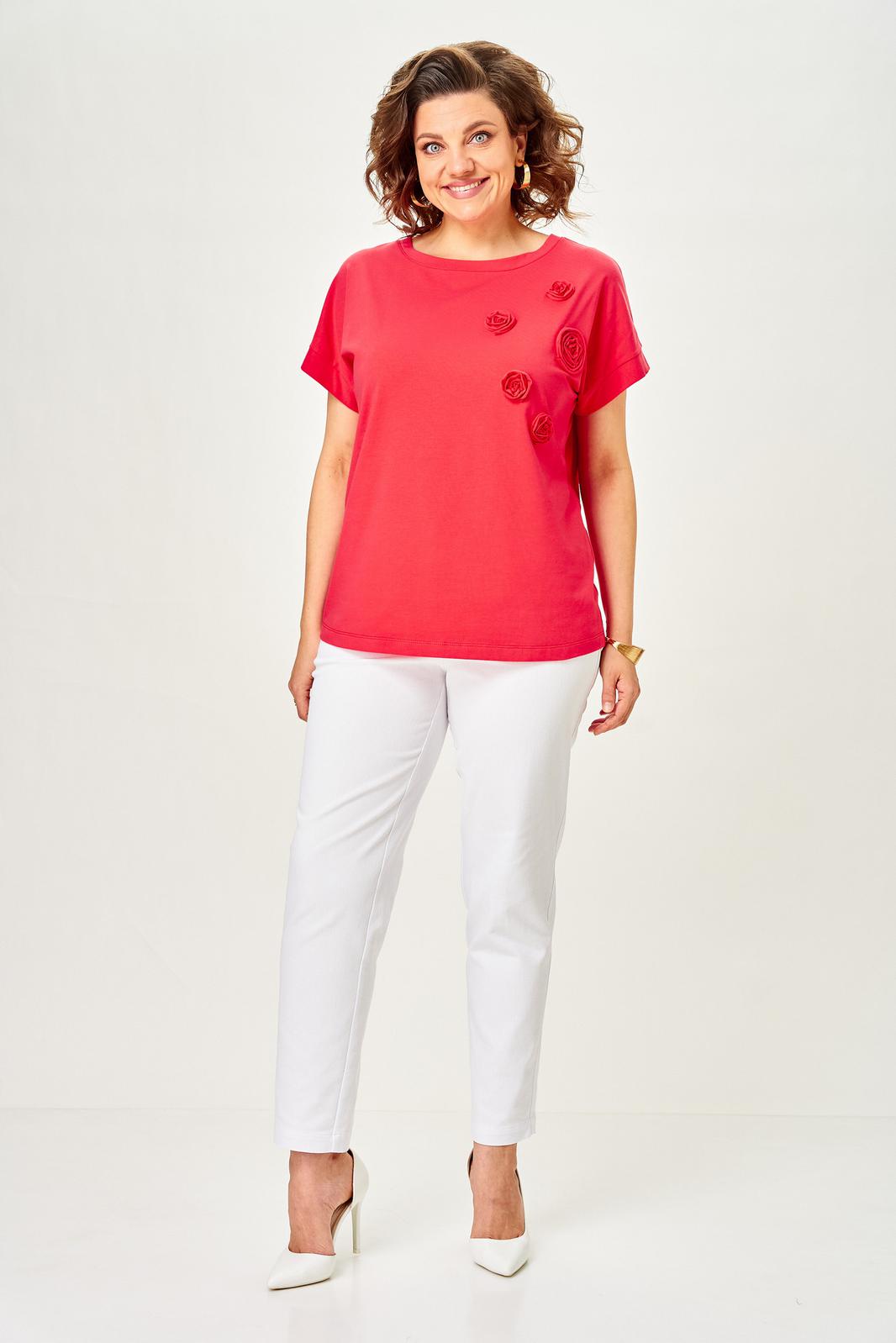 Джемпер из трикотажной хлопковой ткани, со спущенным плечом. По переду джемпера расположены декоративные элементы. Вырез горловины круглый, оформлен бейкой. Спинка без среднего шва.