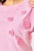 Джемпер из трикотажной хлопковой ткани, со спущенным плечом. По переду джемпера расположены декоративные элементы. Вырез горловины круглый, оформлен бейкой. Спинка без среднего шва.