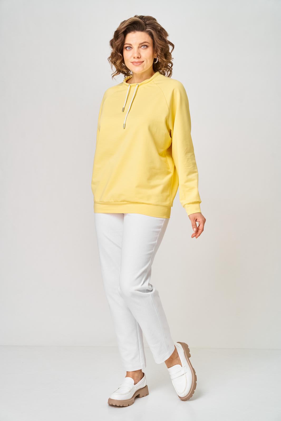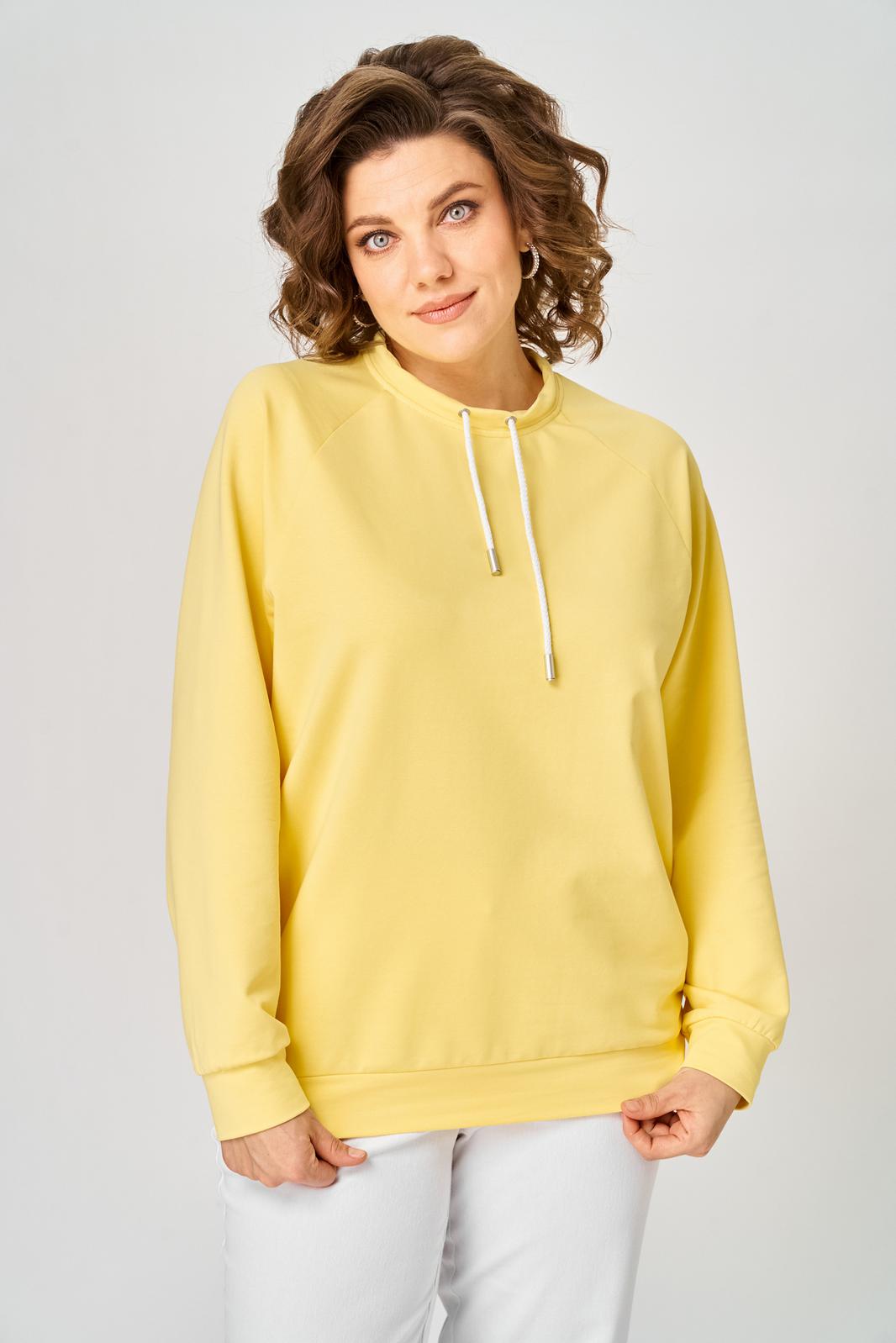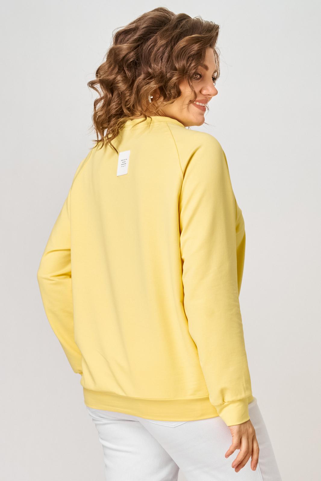 Джемпер женский из трикотажной хлопковой ткани (двунитка). Рукав реглан. Низ рукава обработан притачной манжетой. Низ изделия оформлен притачным поясом. На спинке настрочен декоративный элемент. Вырез горловины круглый, обработан бейкой со шнуром.