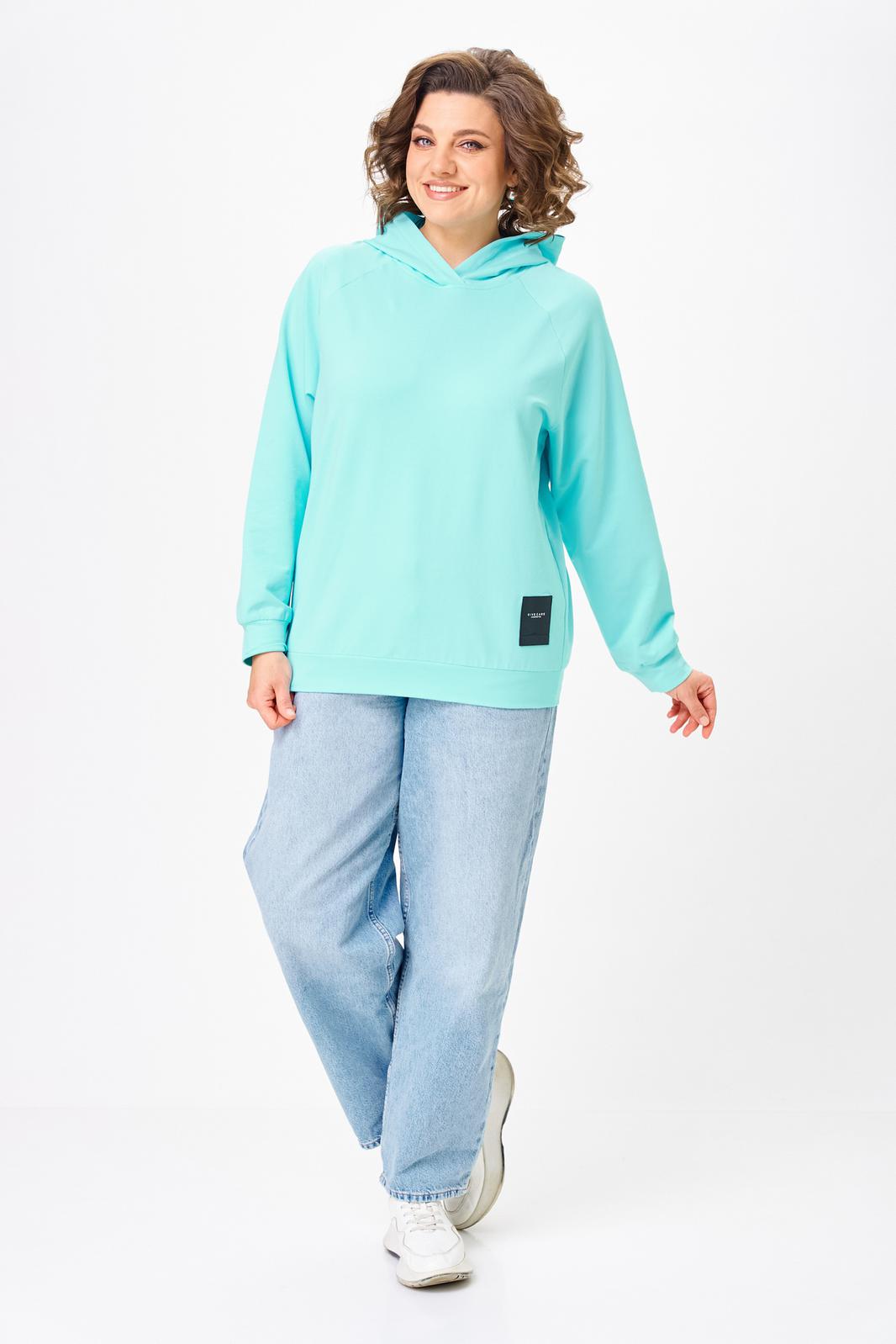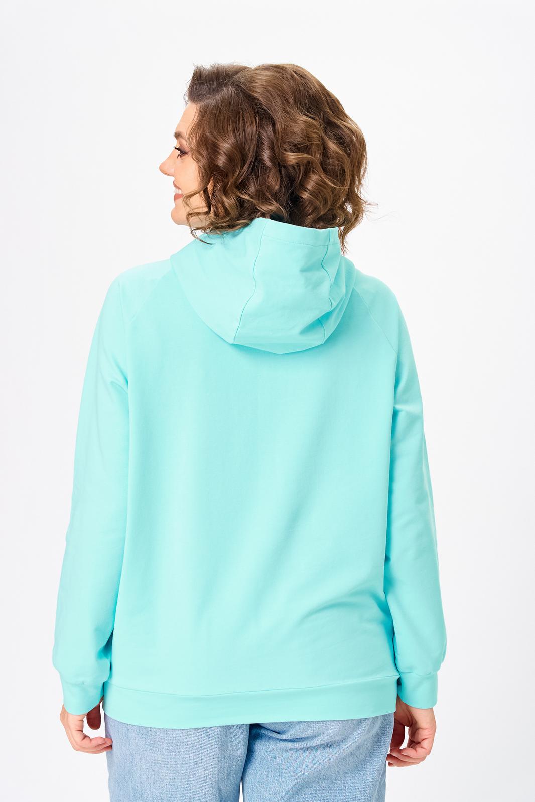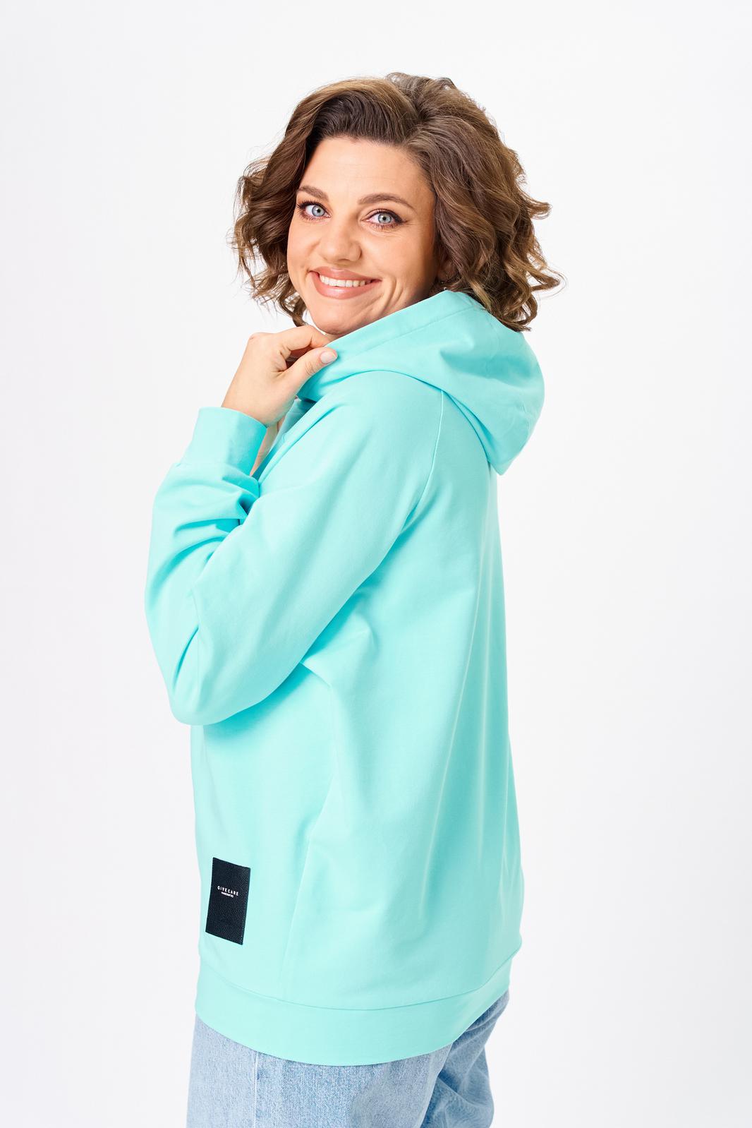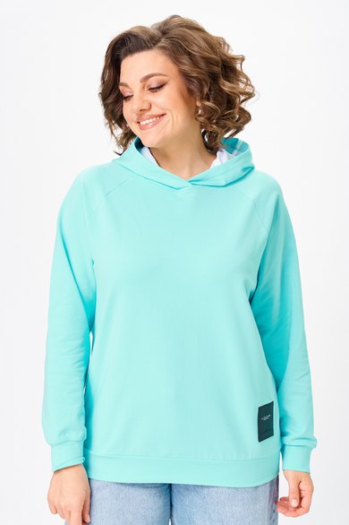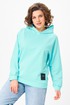 Худи из трикотажной хлопковой ткани (двунитка). Рукав реглан. Низ рукава обработан притачной манжетой. Низ изделия оформлен притачным поясом. По низу полочки настрочен декоративный элемент. Вырез горловины круглый, обработан капюшоном.