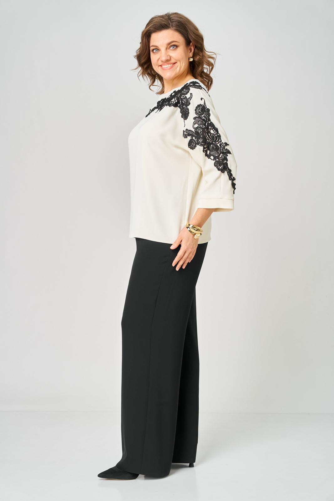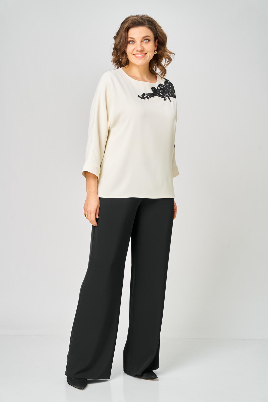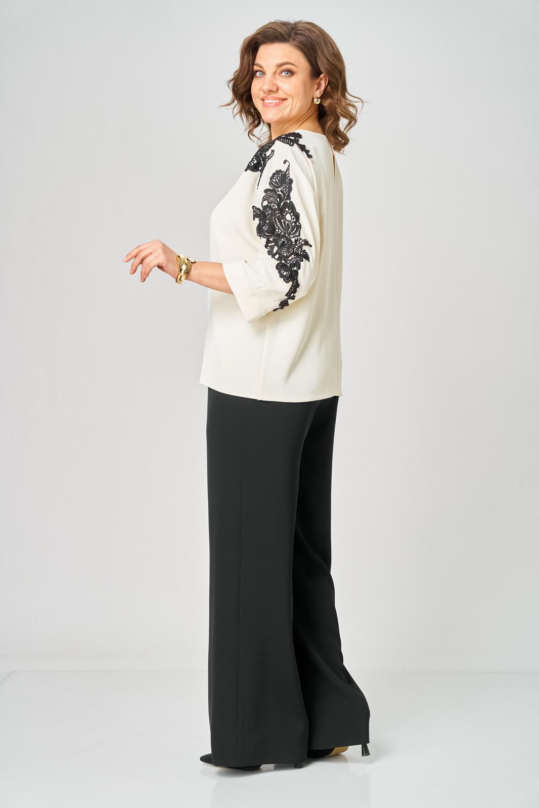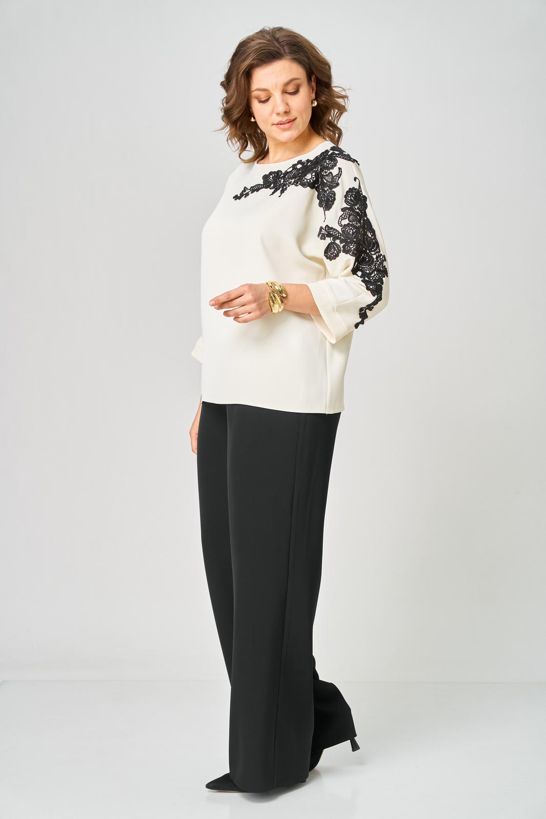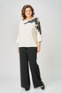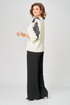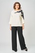 Блузка женская из текстильной ткани с цельнокроеным рукавом. Прямого силуэта. По переду блузки настрочена аппликация. По спинке расположен средний шов. Рукав 3/4, низ рукава с манжетой. Вырез горловины круглый, обработан обтачкой. Блузка застегивается на петлю-пуговицу.