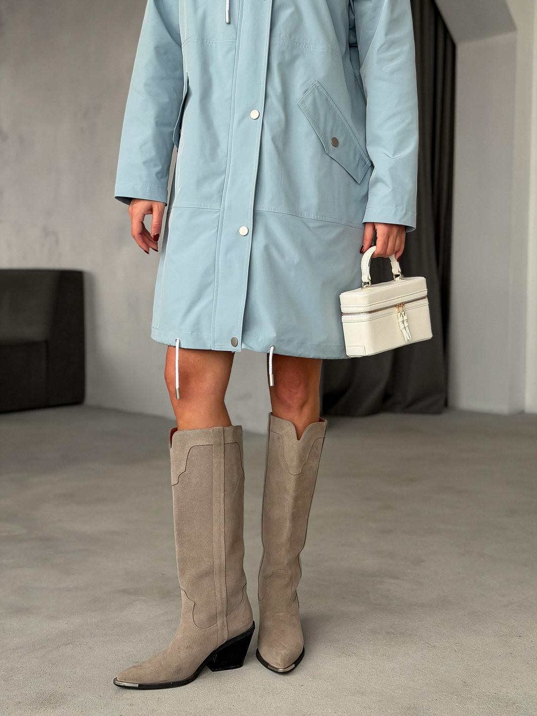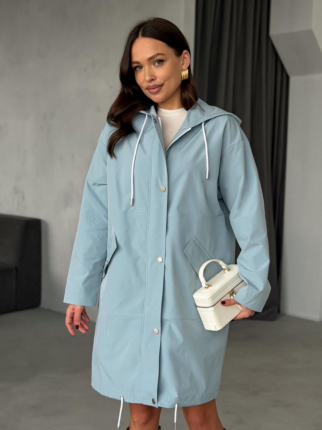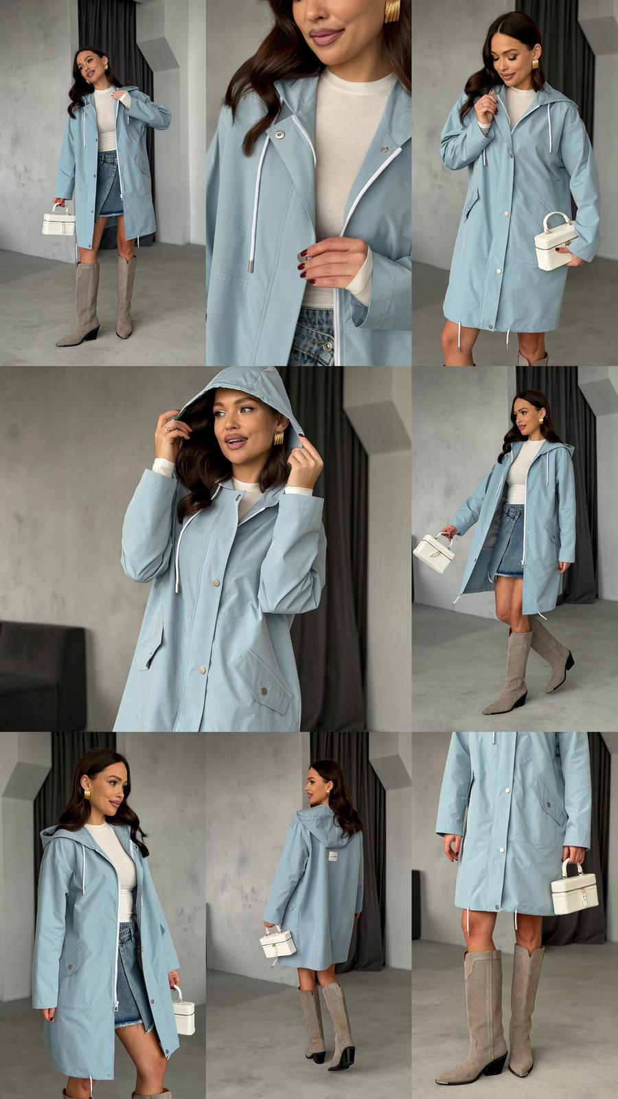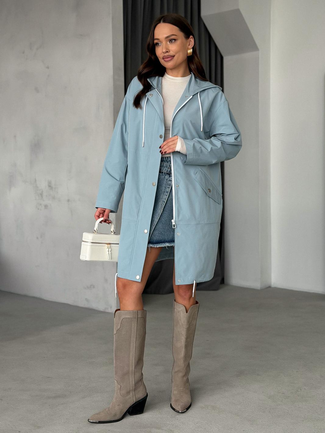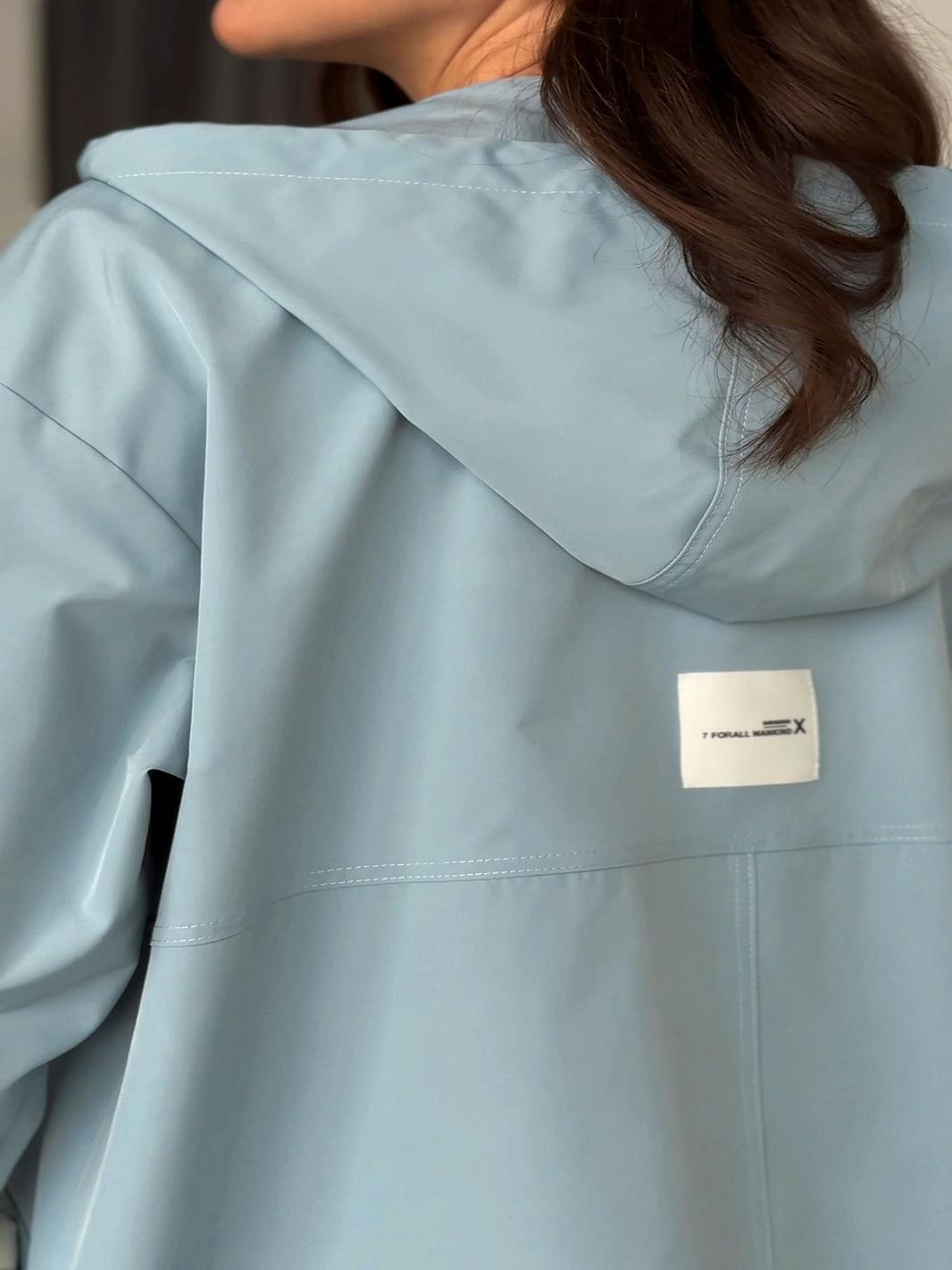 Куртка женская из текстильной ткани (водоотталкивающая) прямого силуэта. По переду расположены декоративные подрезы с прорезными карманами. Спинка состоит из 2-ух частей. На верхней части расположена кокетка и настрочной элемент (возможно изменение элемента-нашивки). Нижняя часть со средним швом. Спущенное плечо, рукав прямой. Вырез горловины оформлен капюшоном с блочками и шнуром. Куртка с планкой, застегивается на молнию и кнопки. По низу изделия расположен шнур с наконечниками.