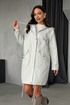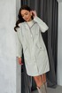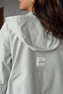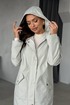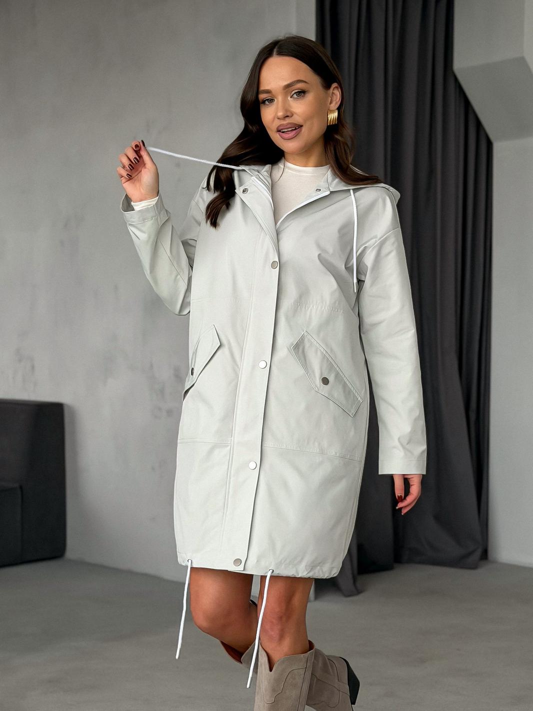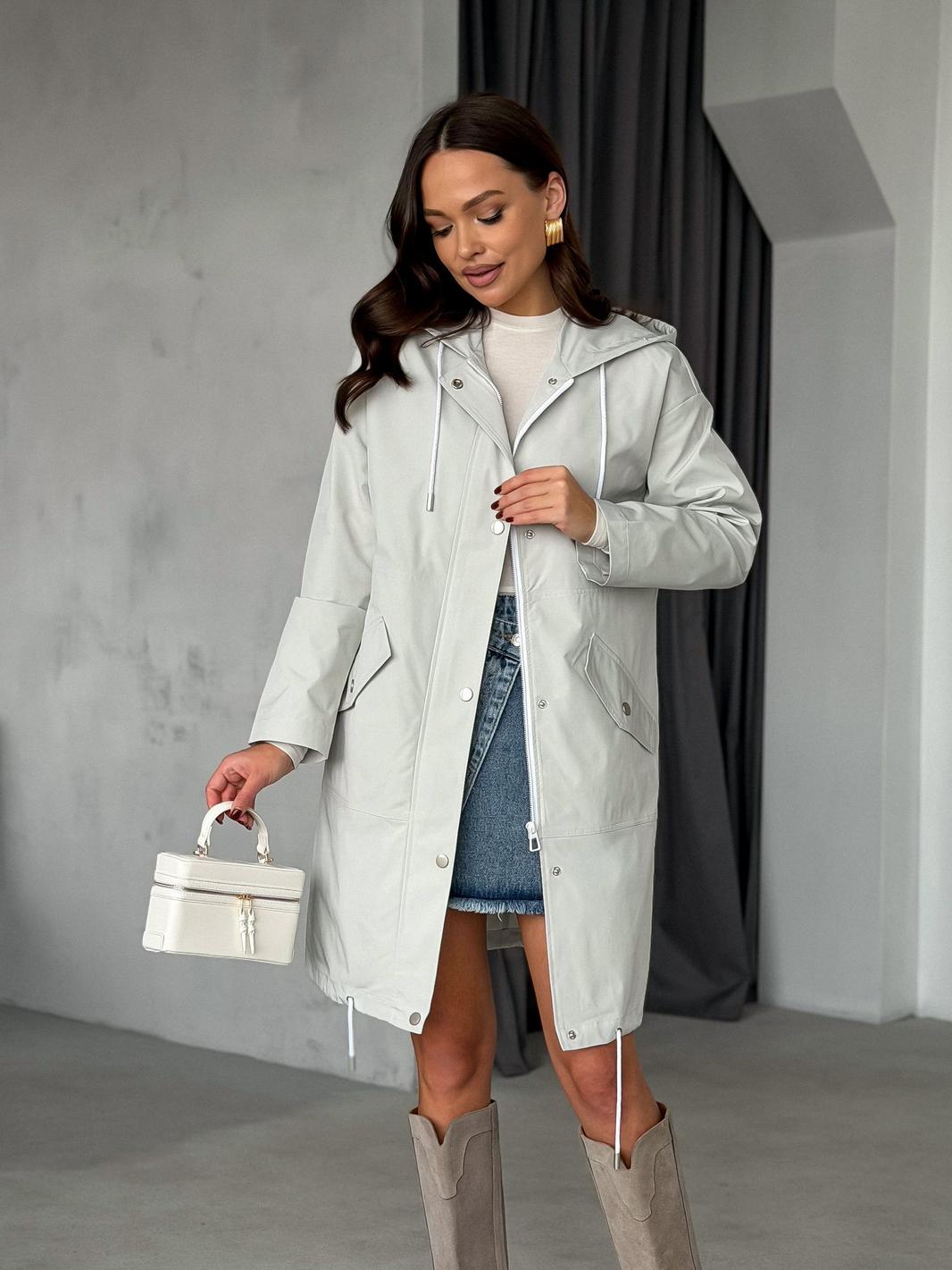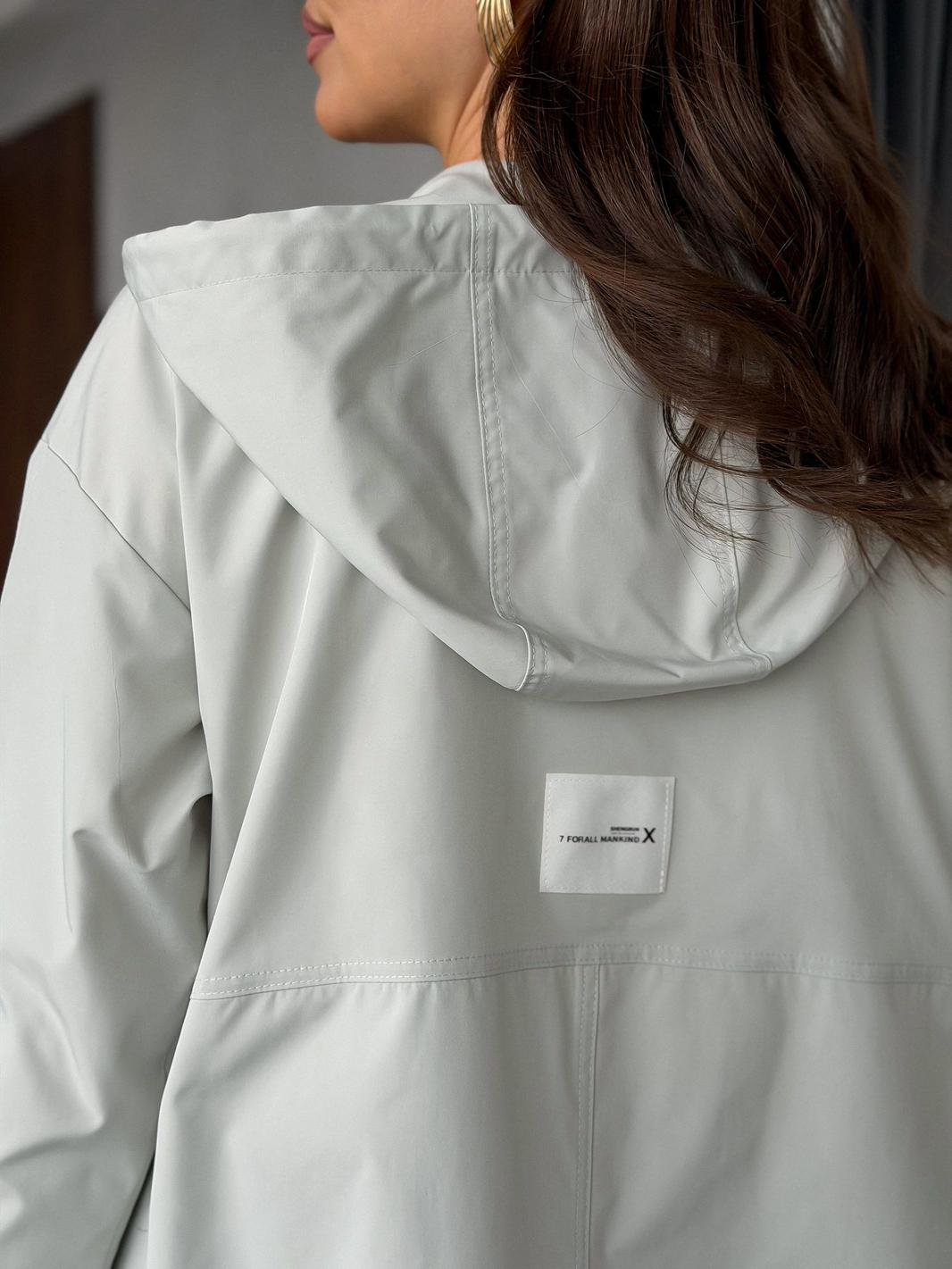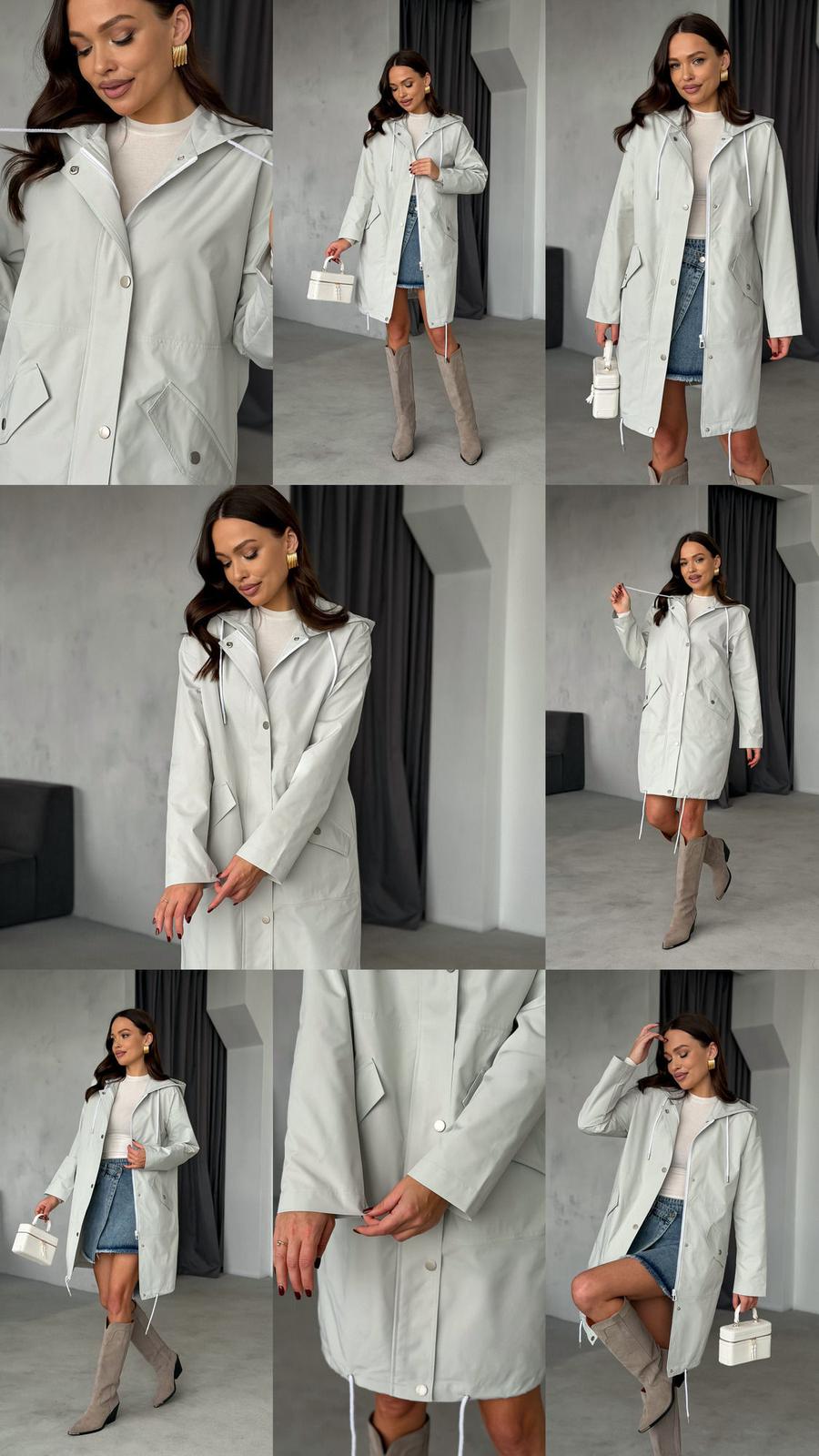 Куртка женская из текстильной ткани (водоотталкивающая) прямого силуэта. По переду расположены декоративные подрезы с прорезными карманами. Спинка состоит из 2-ух частей. На верхней части расположена кокетка и настрочной элемент (возможно изменение элемента-нашивки). Нижняя часть со средним швом. Спущенное плечо, рукав прямой. Вырез горловины оформлен капюшоном с блочками и шнуром. Куртка с планкой, застегивается на молнию и кнопки. По низу изделия расположен шнур с наконечниками.