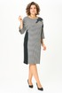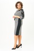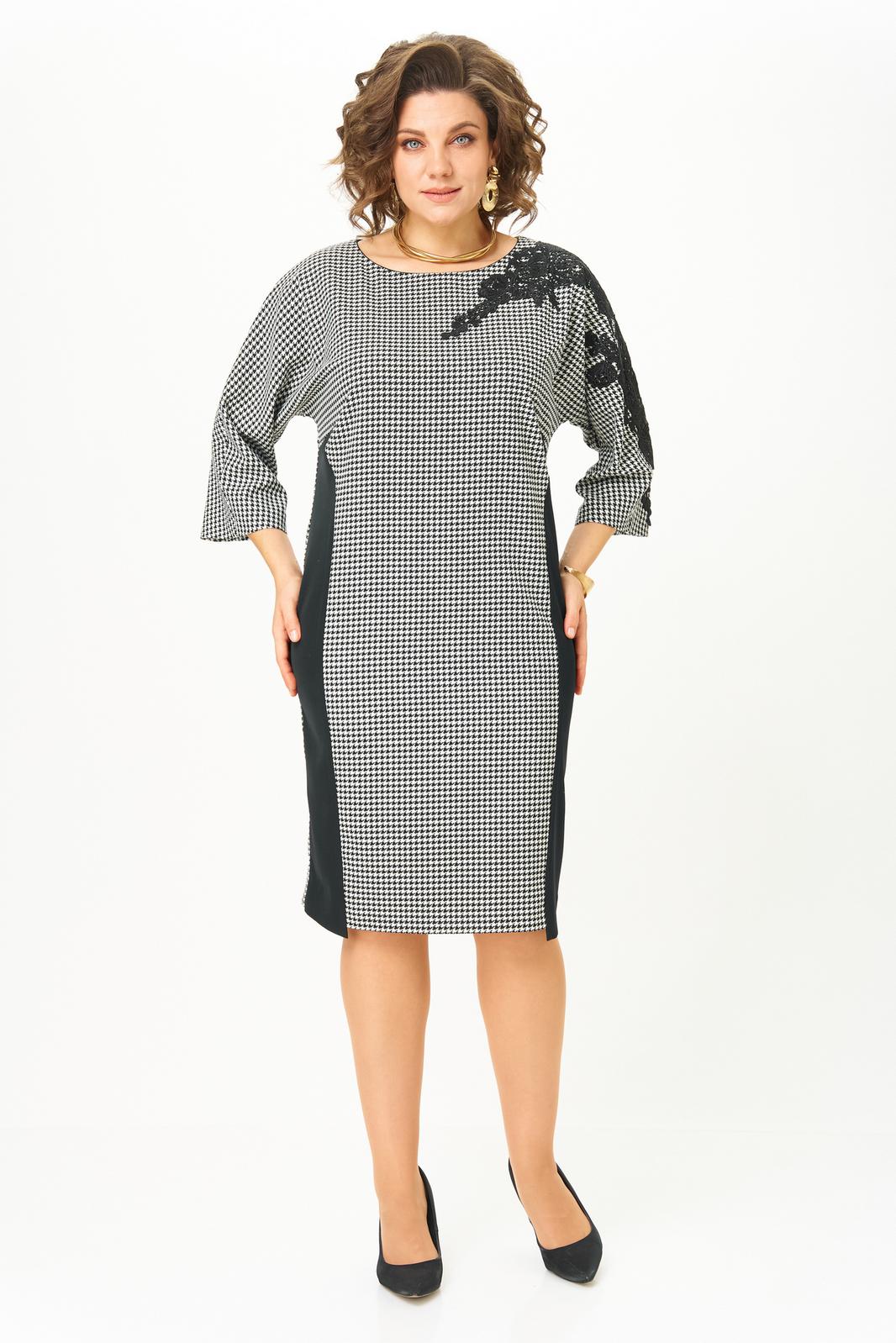 Платье женское, полуприлегающего силуэта из текстильной ткани. Перед платья с нагрудными выточками и отрезным бочком из отделочной ткани. Спинка со средним швом и шлицей. Рукав цельнокроеный. Вырез горловины круглый. На плечевом шве расположена аппликация.