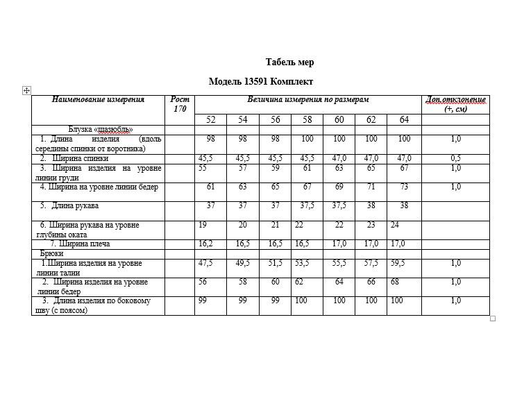 Комплект женский состоит из шазюбля и брюк. Шазюбль женский из текстильной ткани прямого свободного силуэта, выполнен из двух видов ткани. Левая часть передней полки из однотонной ткани с нанесением нижней части рисунка - печати. В верхней части настрочной карман ассиметричной формы. Карман по нижнему срезу украшен декоративной тесьмой красного цвета. По передней полке застежка на петли - пуговицы контрастного цвета. В шазюбле обработаны карманы в боковых швах. Горловина оформлена отложным рубашечным воротником на стойке. Спинка прямого силуэта с кулисой в области талии и шнурками. Линия плеча чуть спущена, рукав втачного покроя, одношовный. Низ рукава оформлен отложным широким манжетом. На рукав по центру настрочена декоративная тесьма, длину которой можно регулировать при помощи пряжки - полукольца, тем самым регулируя длину рукава. Низ шазюбля фигурной формы, округлен к бокам, перед короче спинки на 7 см. В боковых швах разрезы по 14 см. Брюки выполнены из трикотажного полотна, прилегающего силуэта, зауженные к низу. На передних половинках застежка на тесьму - молнию. Задние половинки с талиевыми вытачками. По задней части - на эластичной резинке, по передней полке застежку на петлю-пуговицу.