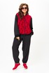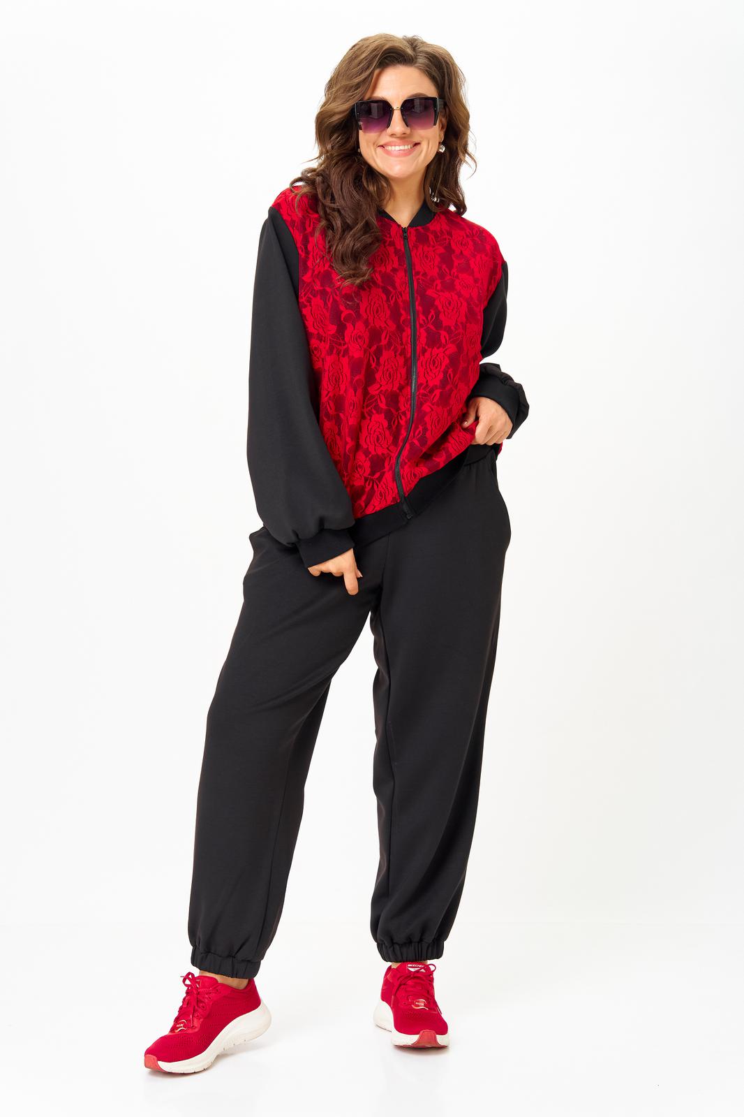 Костюм женский спортивный, состоящий из бомбера и брюк. Легкий джемпер-бомбер, предназначен для молодых и стильных женщин. Выполнен из двойной костюмно-плательной ткани. Перед и спинка выполнены из гипюра. Стойка-воротника выполнена из ткани кашкорсе, из этой же ткани выполнены манжеты на рукавах. По центру изделия молния. Украшением изделия служит нашивка на рукаве.