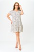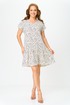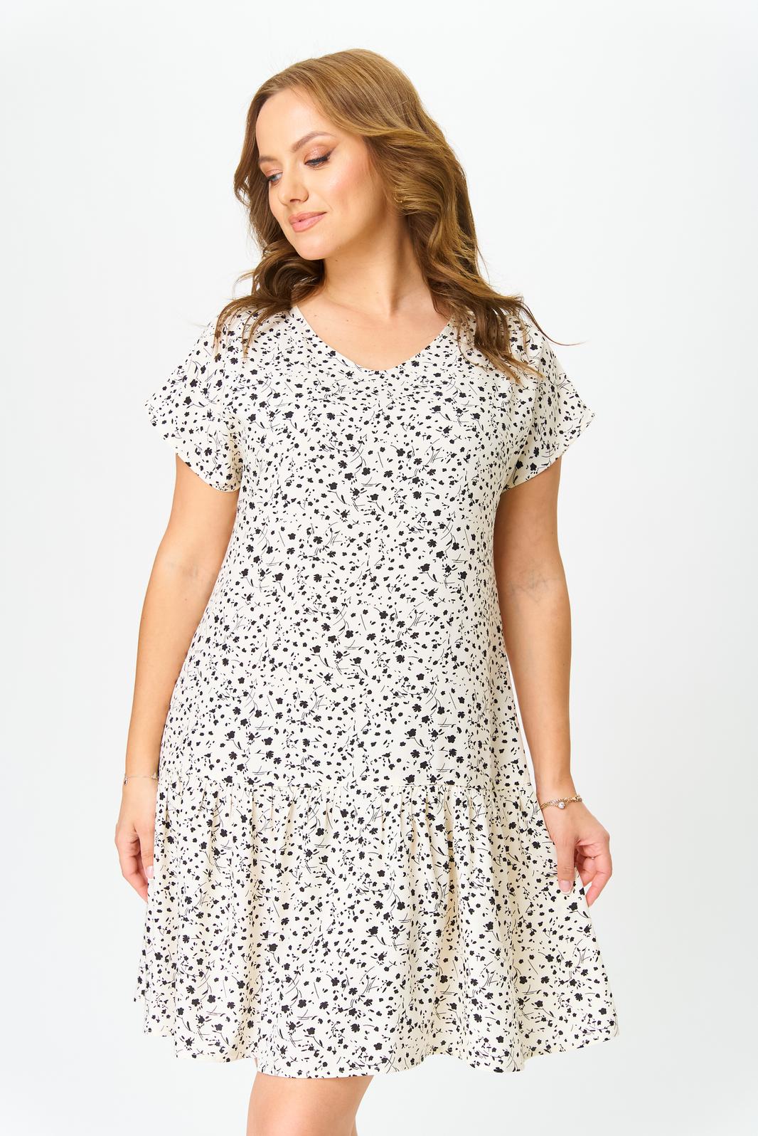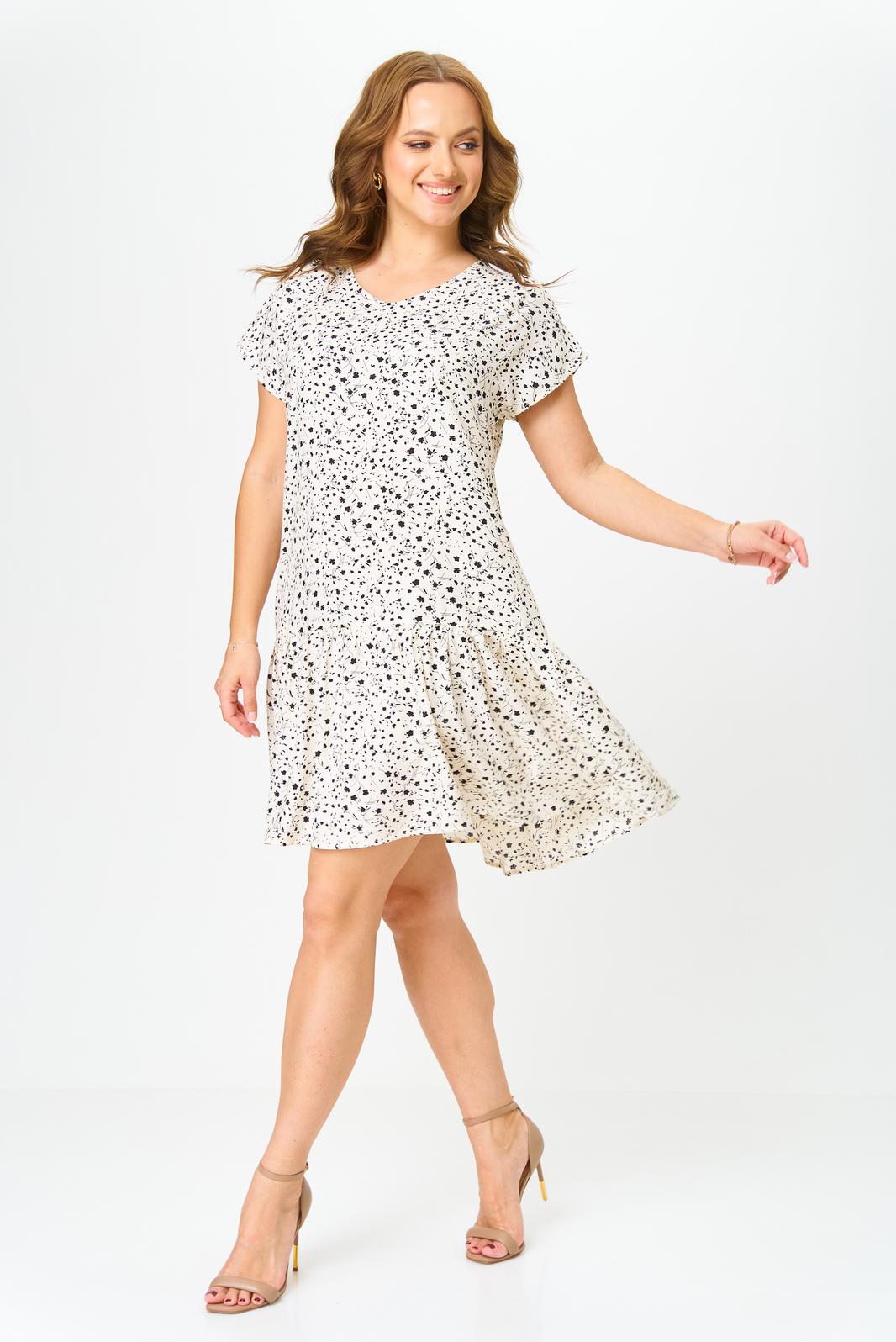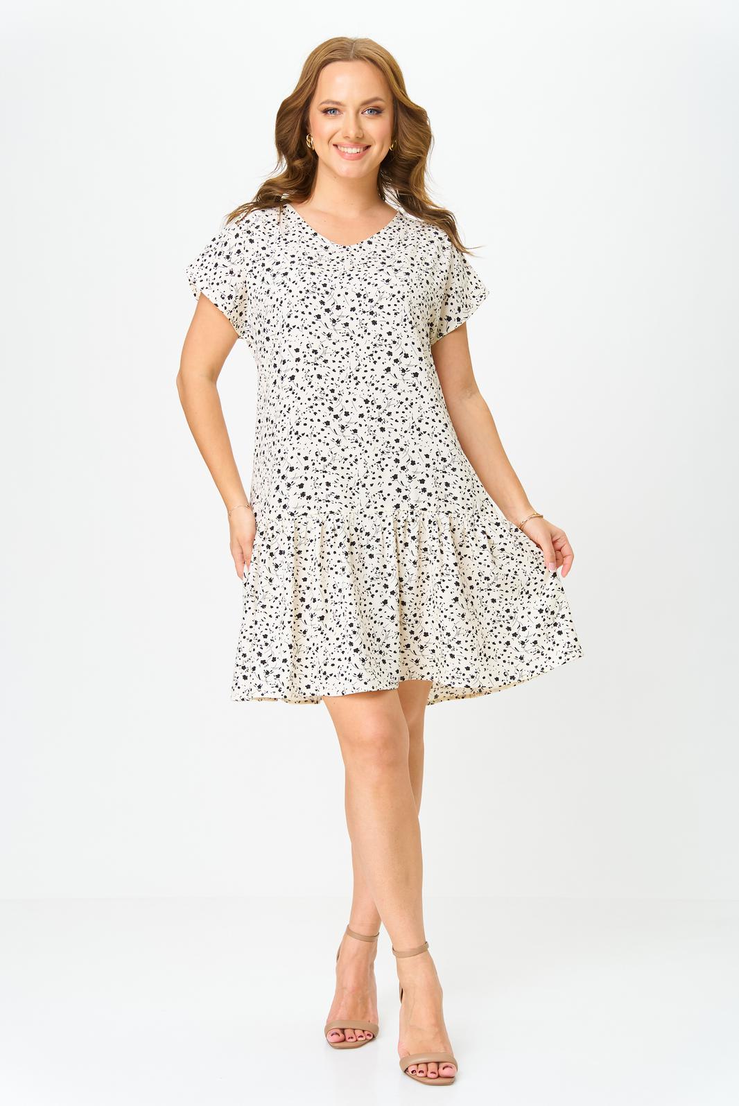 Легкое платье с v-образным вырезом , свободного кроя ,с коротким рукавом, по низу платья волан со сборкой ,длинною выше колен.