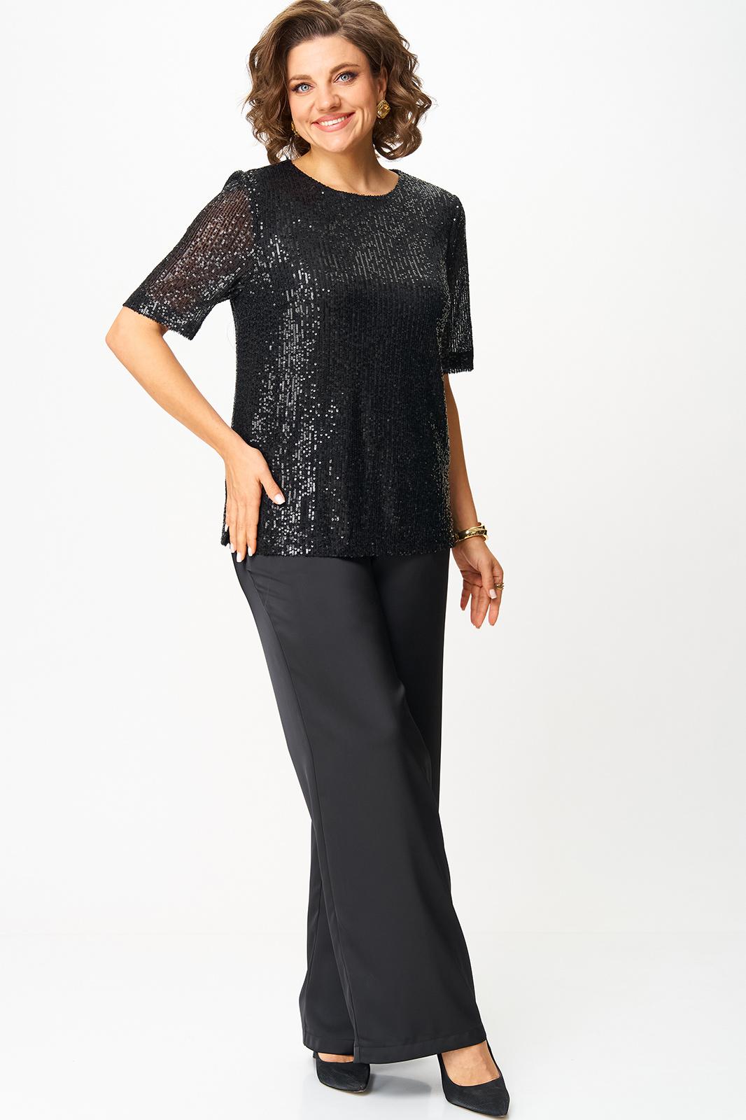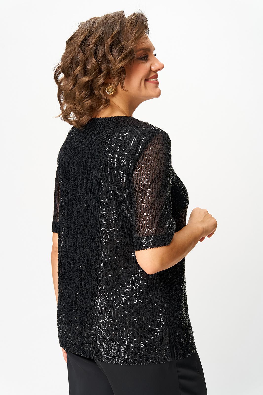 Блузка женская прямого силуэта из ткани пайетка с втачным рукавом. Горловина округлой формы обработана обтачкой. По линии груди вытачки. Рукав длиной до уровня локтя. В боковых шах обработаны разрезы. Перед и спинка блузки на трикотажной подкладке.