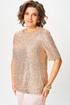 Блузка женская прямого силуэта из ткани пайетка с втачным рукавом. Горловина округлой формы обработана обтачкой. По линии груди вытачки. Рукав длиной до уровня локтя. В боковых шах обработаны разрезы. Перед и спинка блузки на трикотажной подкладке.