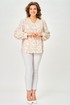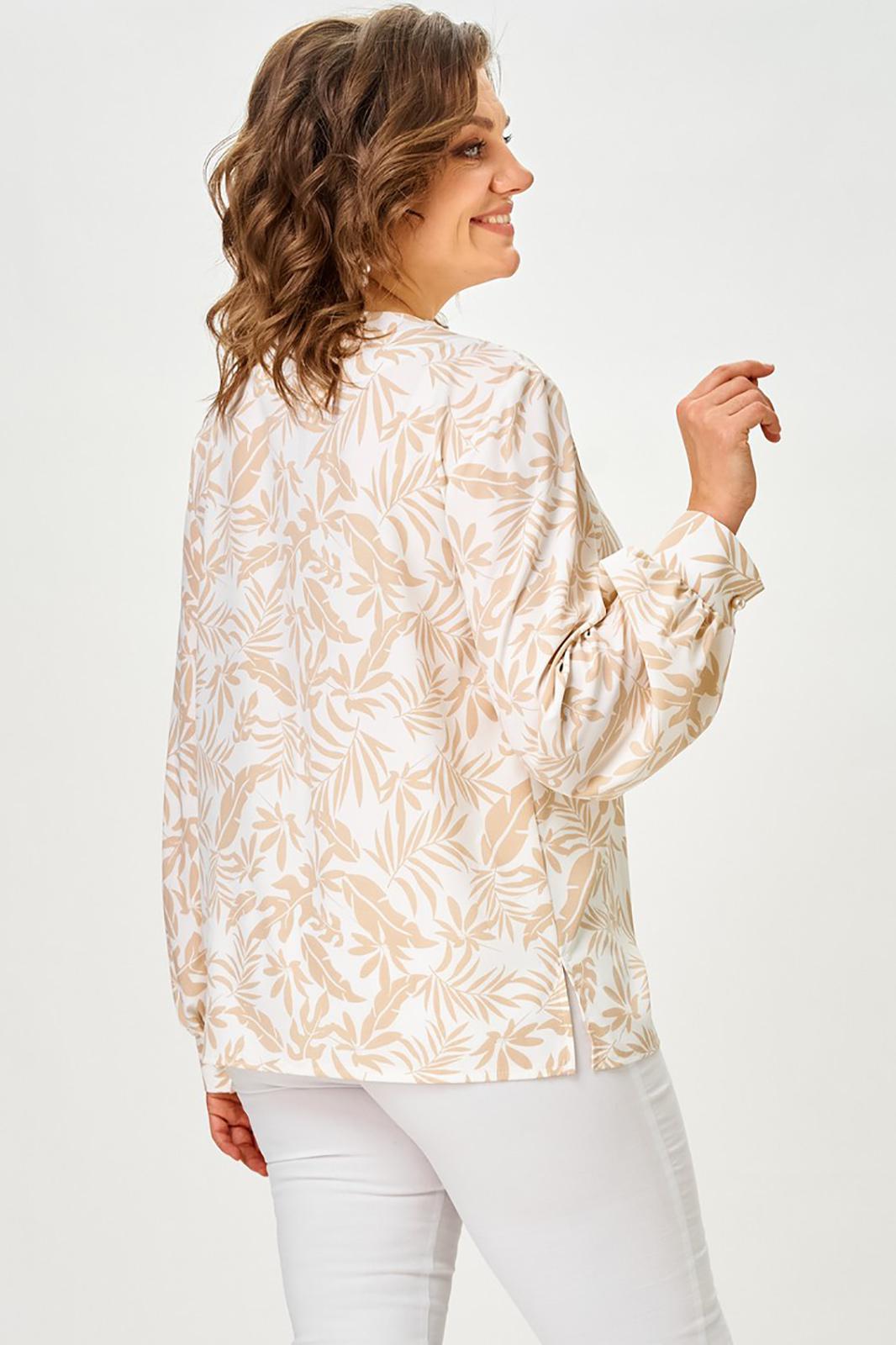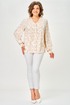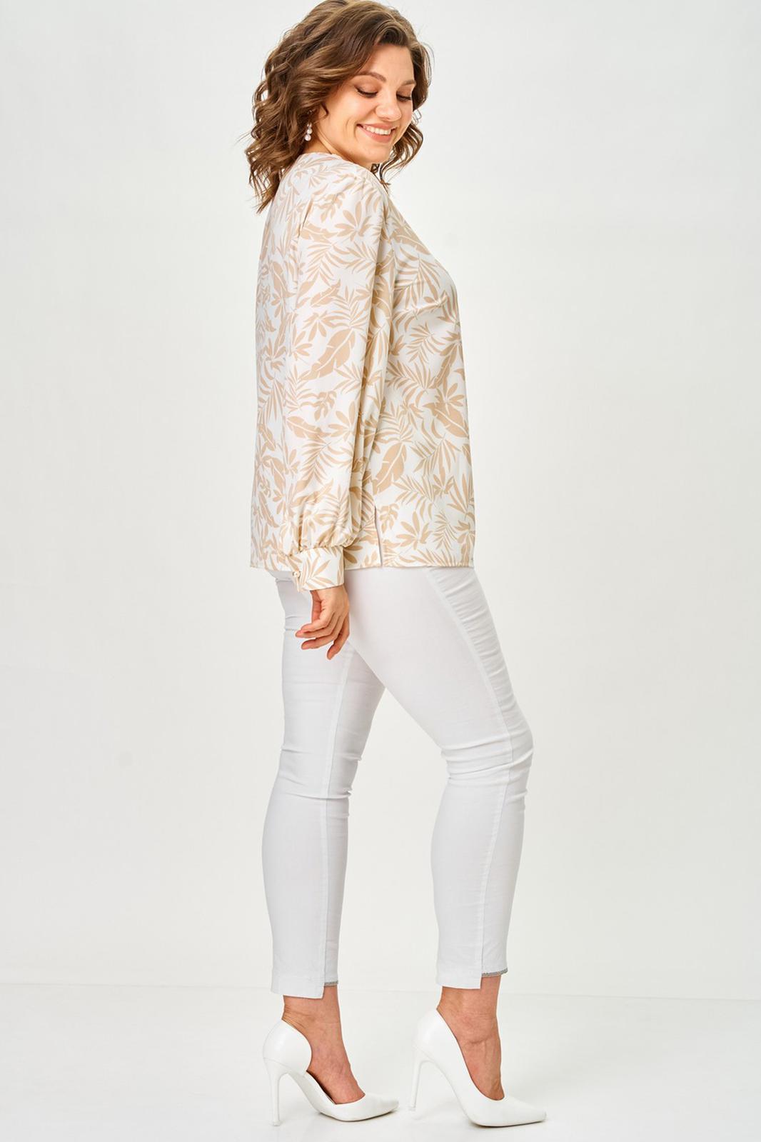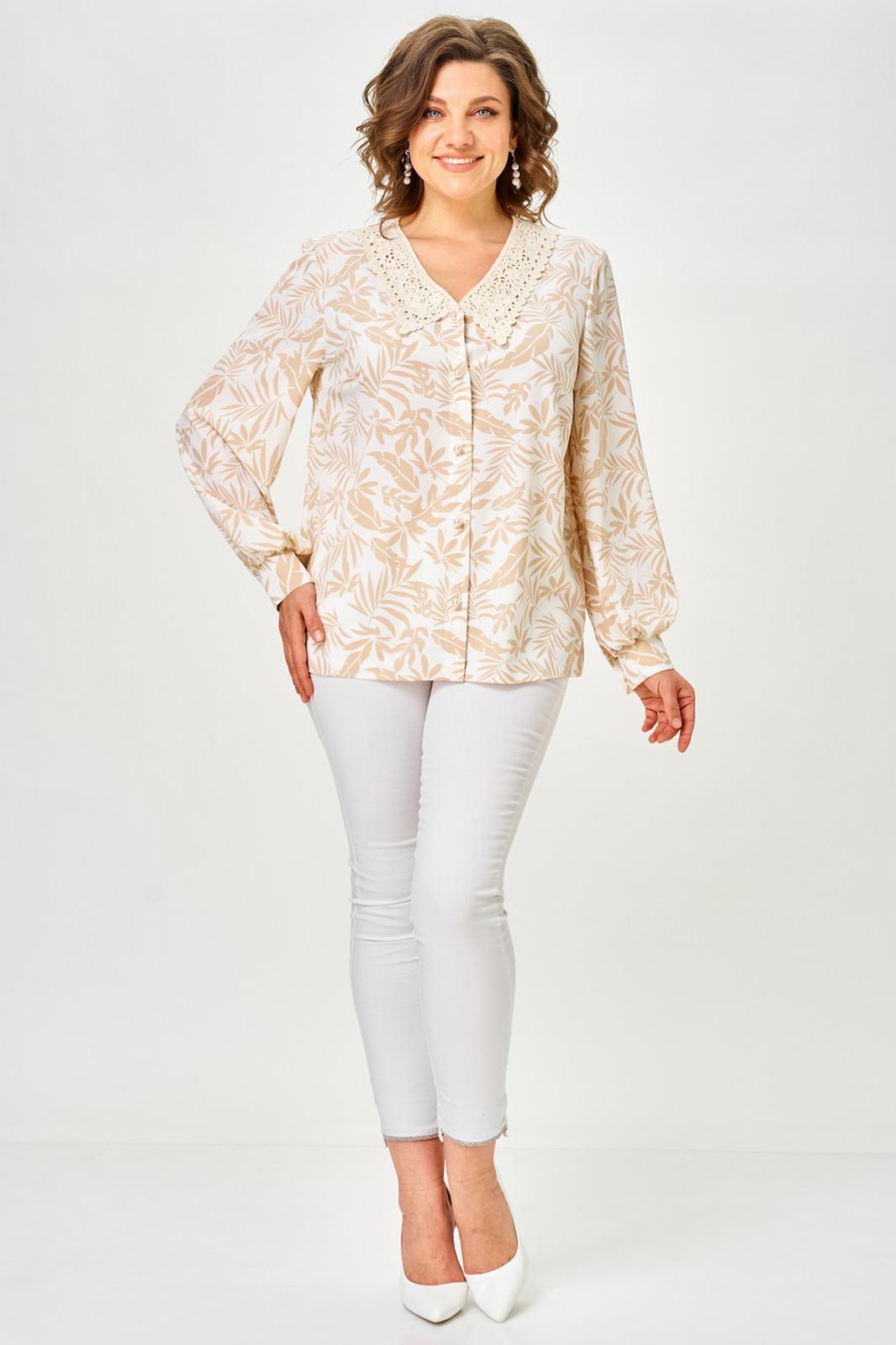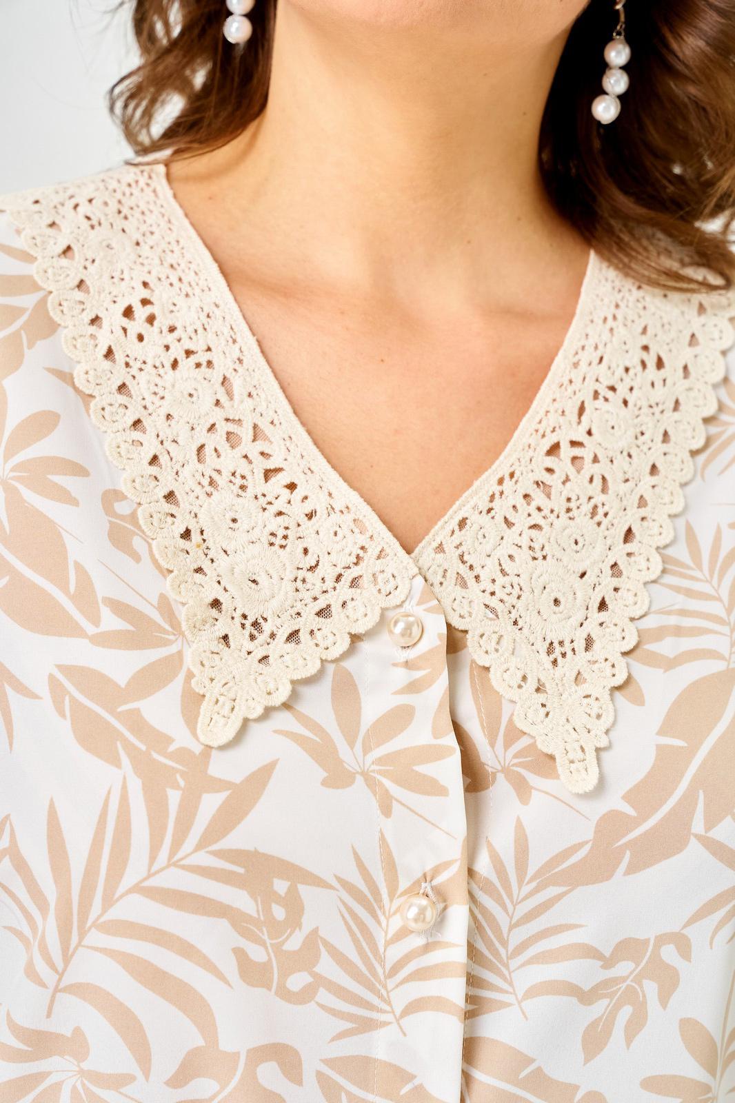 Блузка женская прямого силуэта, с втачным рукавом. Горловина v-образной формы. Отделкой служит воротничок из кружева. Застежка центральная на пять петель и пуговиц. По линии груди вытачки. Рукав длинный расширенный к низу, на притачной манжете с застежкой на петлю и пуговицу. В боковых швах обработаны разрезы.