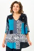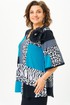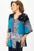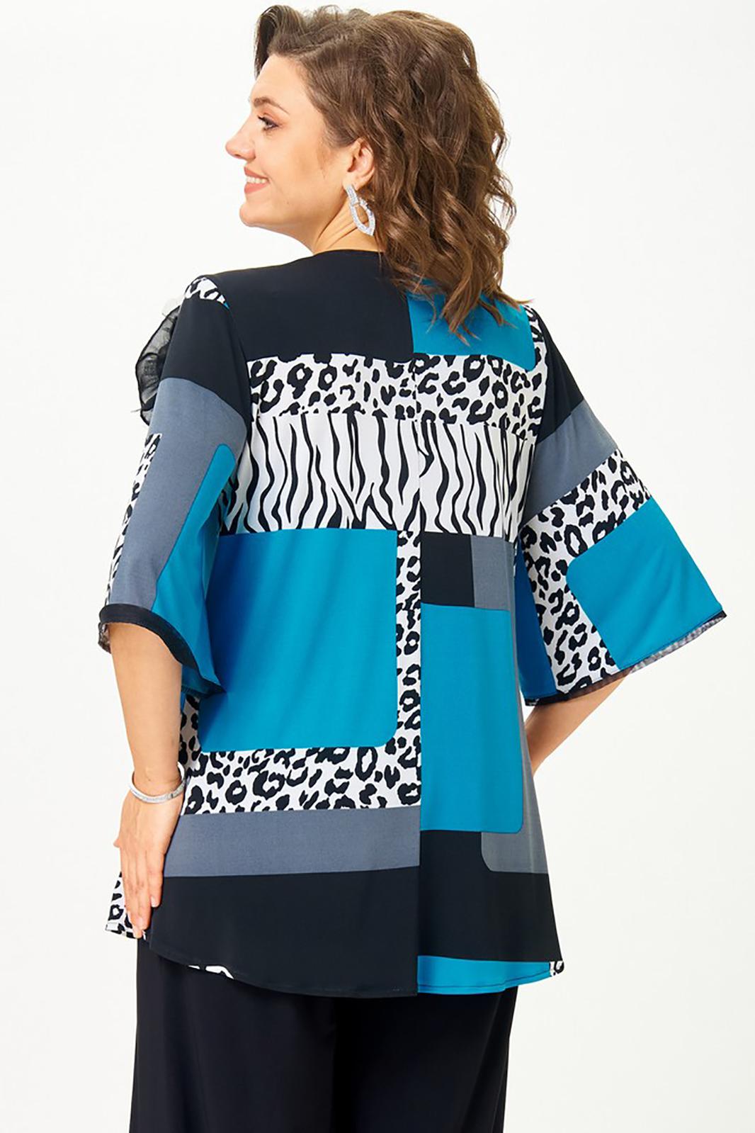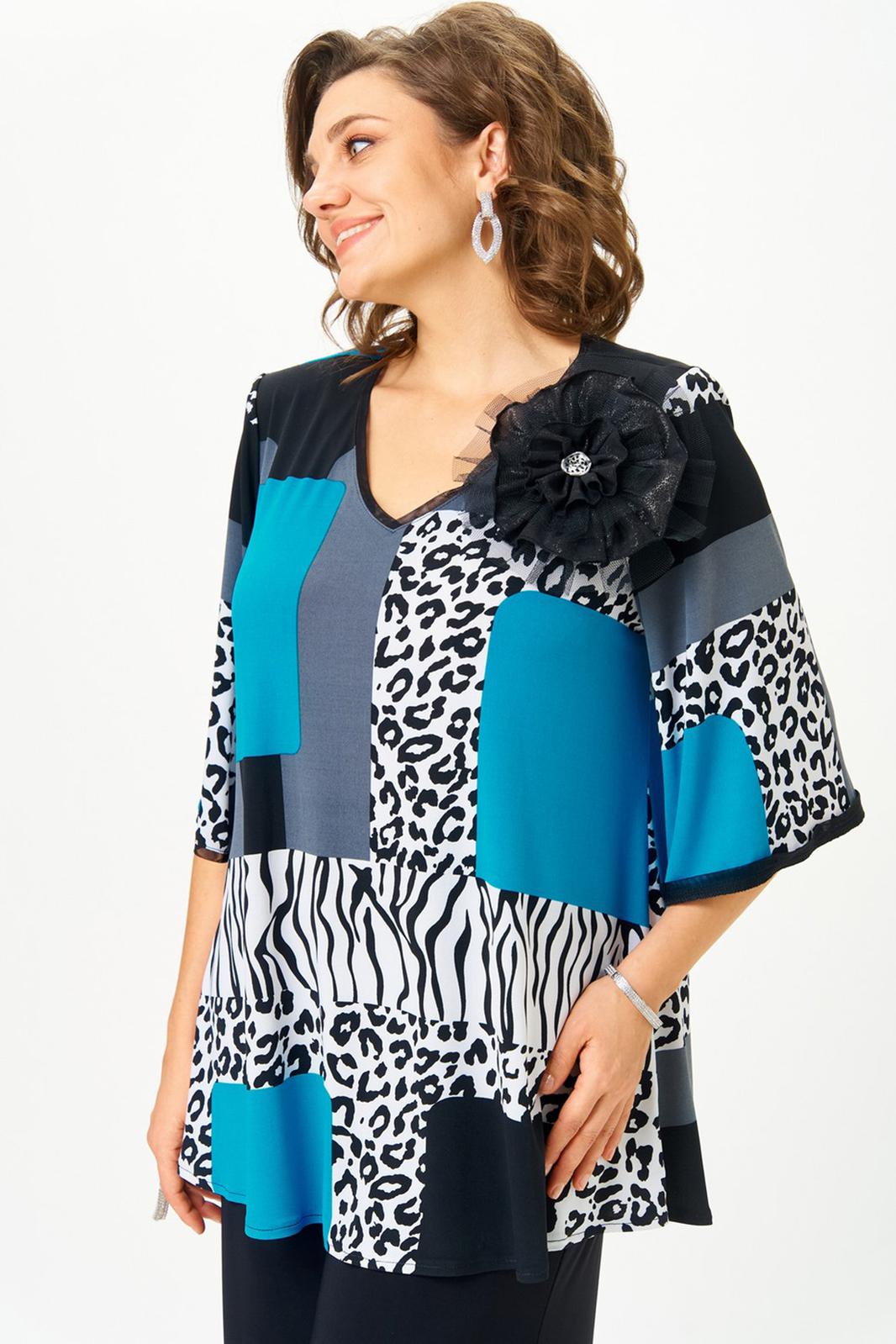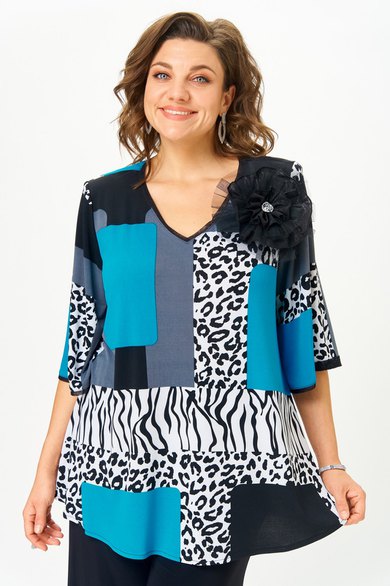 Блузка А-силуэта с втачным рукавом. Вырез горловины v- образной формы. Рукав длиной 3/4 расширен к низу. По горловине и по низу рукава бейка из сетки. Украшением служит съемный цветок из отделочной ткани.