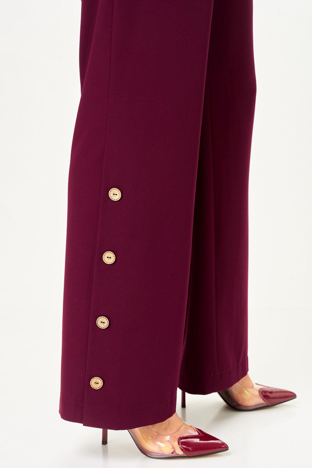 Брюки прямого силуэта с декоративной застежкой по низу в боковых швах. Передние половинки брюк с карманами. Брюки с застежкой на молнию, по поясу на петлю и пуговицу. По бокам резинка для удобства посадки на талии. Костюм без подкладки.
