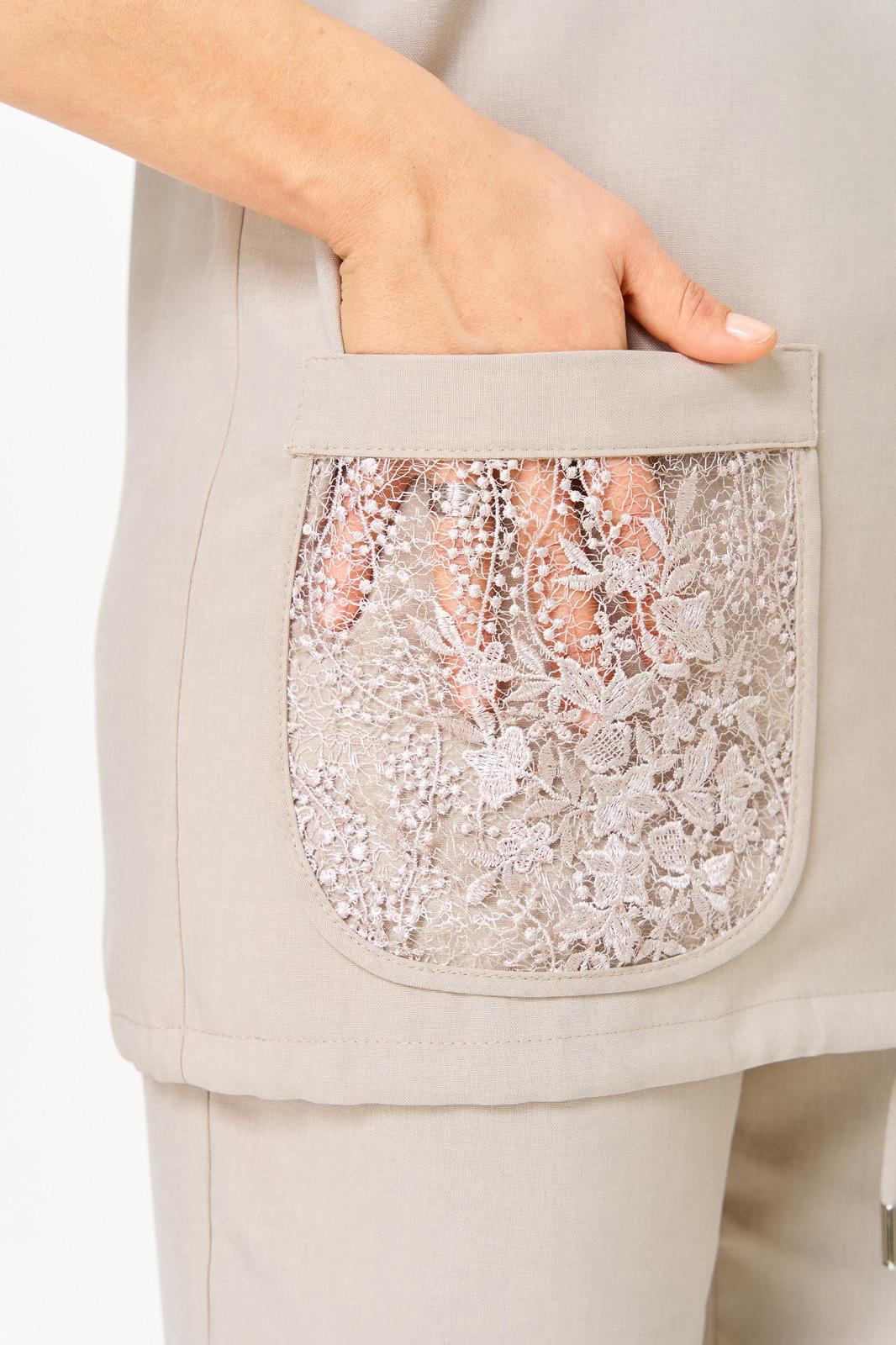 Жакет прямого силуэта. Застежка на молнию. По горловине капюшон на кулисе. По полочкам накладные карманы. Карманы, вставка рукава и капюшон выполнены из гипюра. Низ жакета на кулисе.