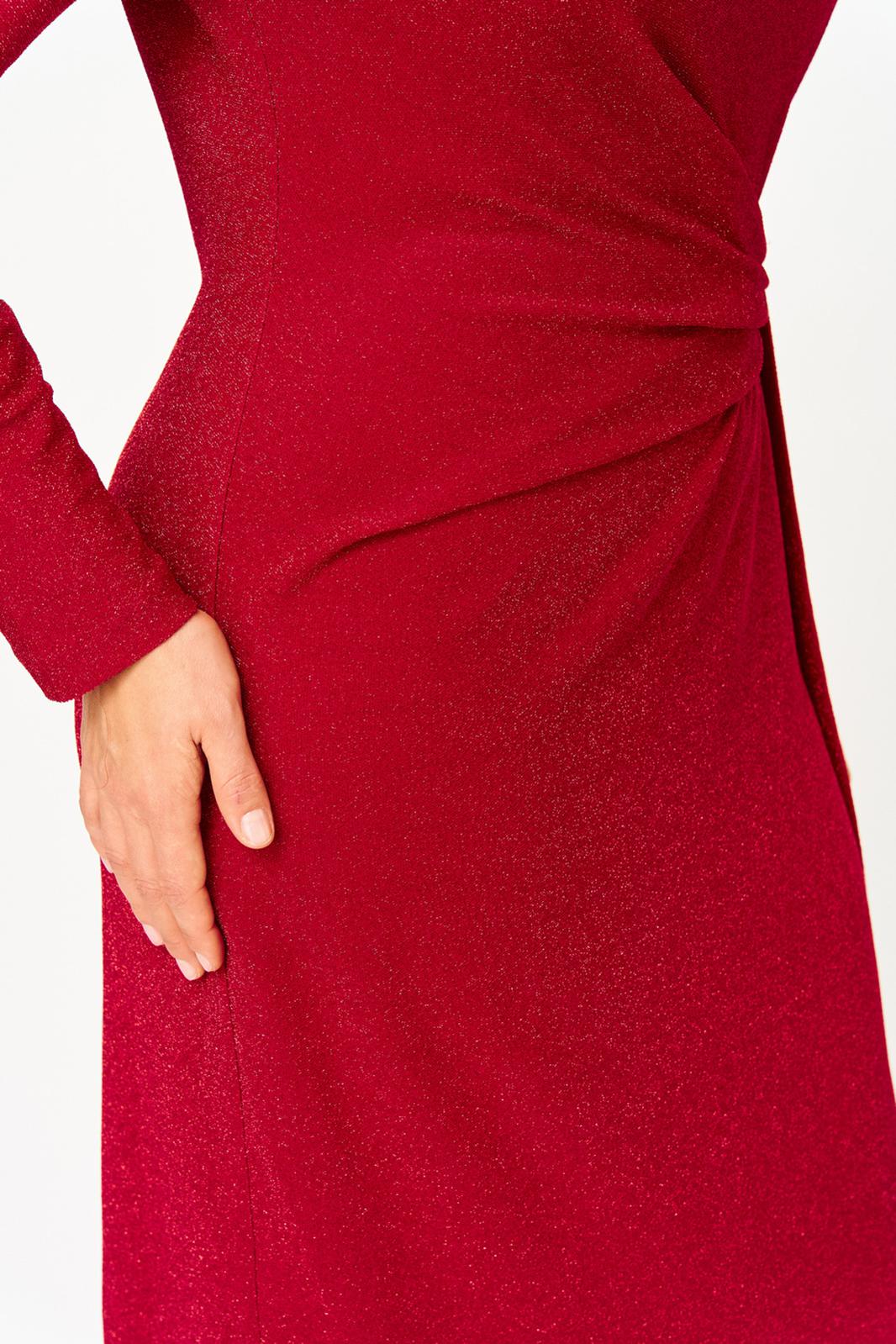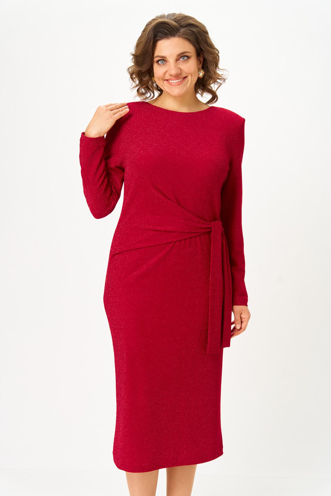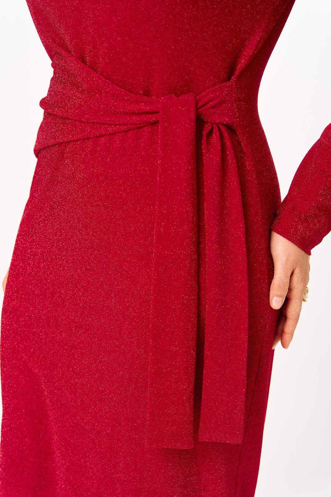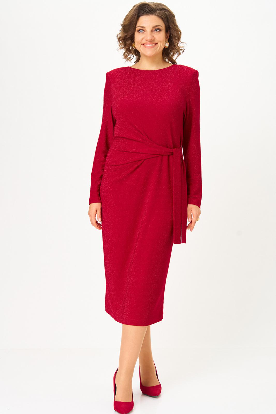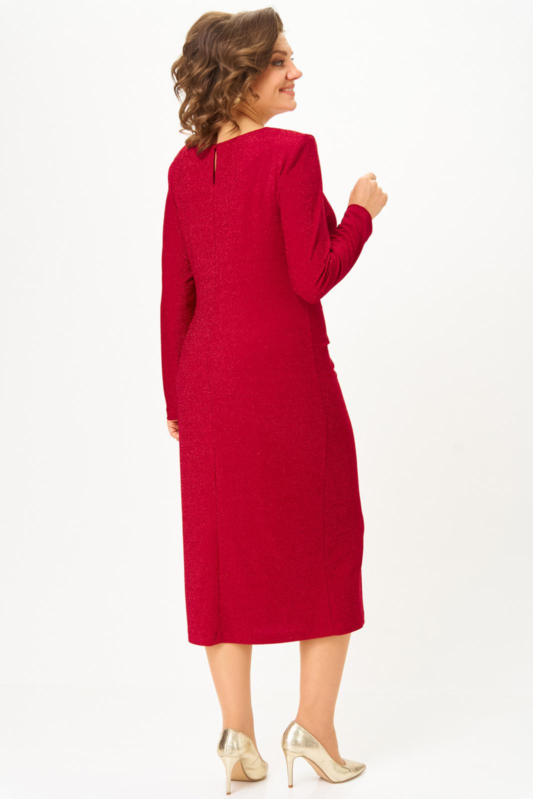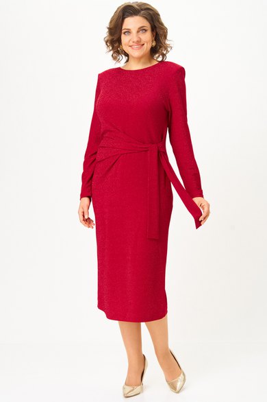 Платье женское нарядное полуприлегающего силуэта, длиной миди. Горловина округлой формы с застежкой по спинке на воздушную петлю и пуговицу. Спинка со средним швом. Рукав втачной длинный. По линии талии элегантный пояс, регулируется по фигуре, подчеркнет талию и добавит образу оригинальность и изюминку.