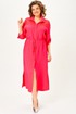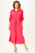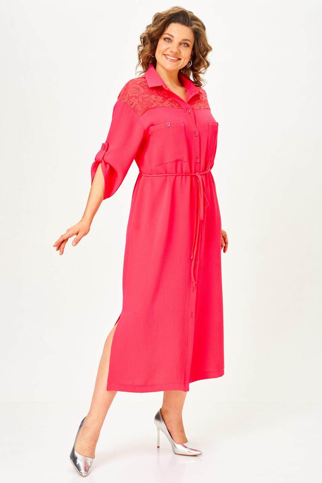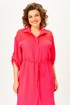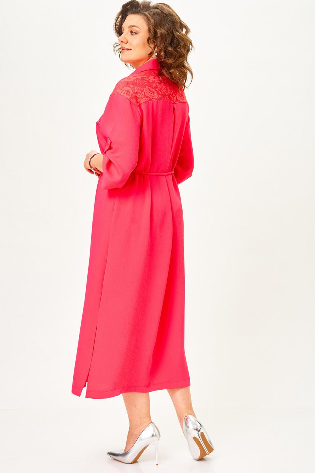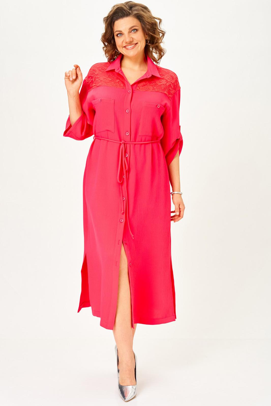 Платье женское в стиле сафари прямого силуэта с декором из кружева. Втачные рукава длиной ¾, по низу регулируются патой. Линия плеча спущена. Застежка центральная на петли и пуговицы. Воротник отложной на стойке. Нижняя часть спинки со складкой из-под кокетки. Верхняя часть переда с накладными карманами. В боковых швах разрезы. По линии талии съемный пояс в тон.