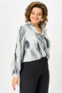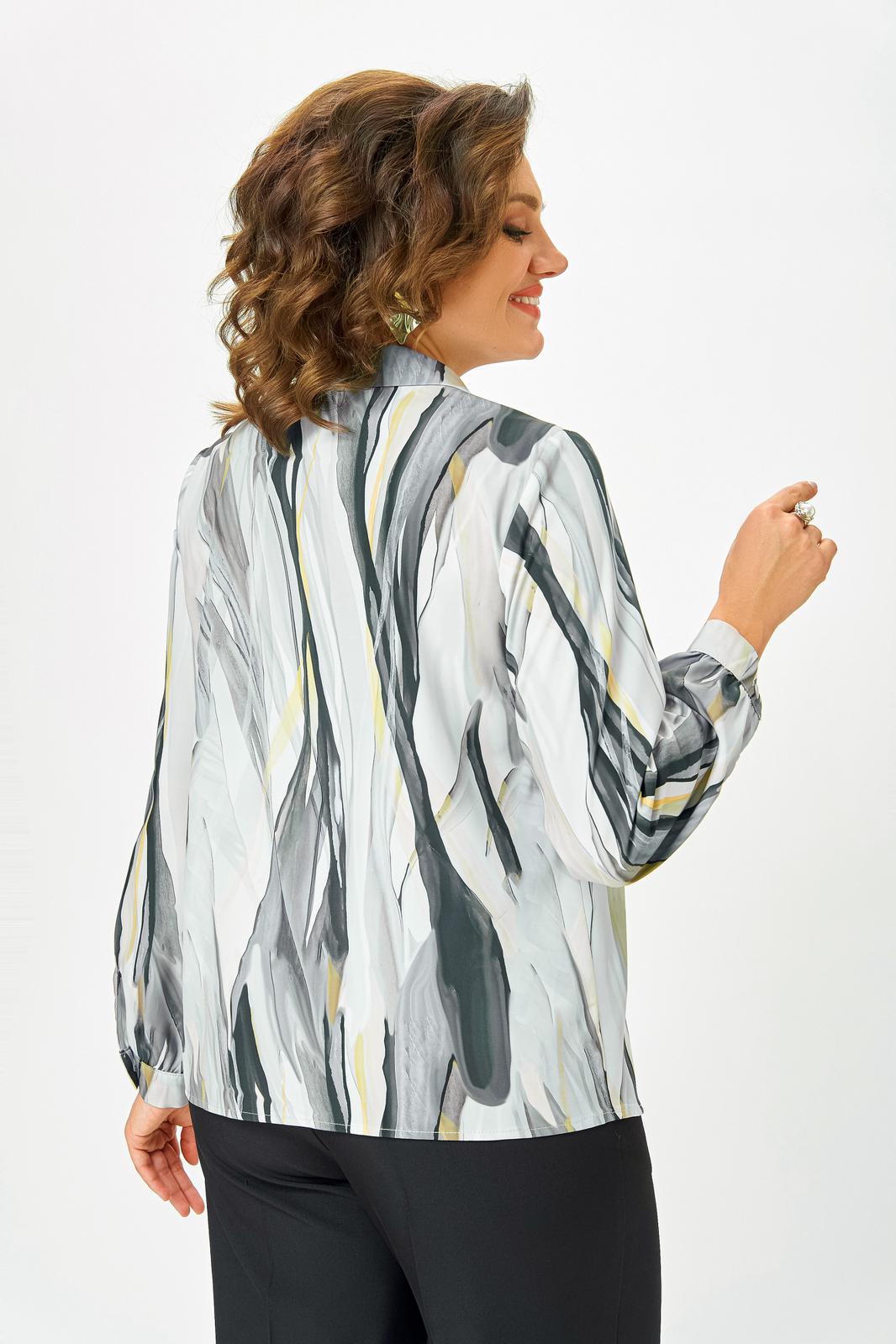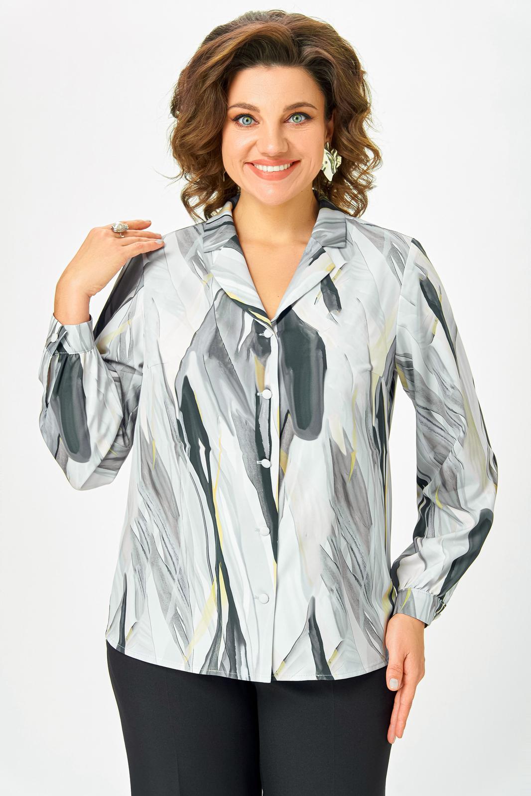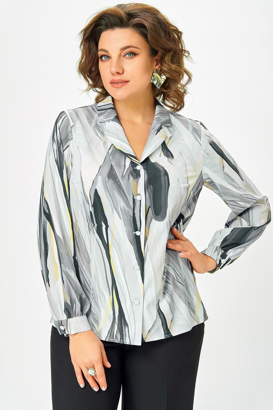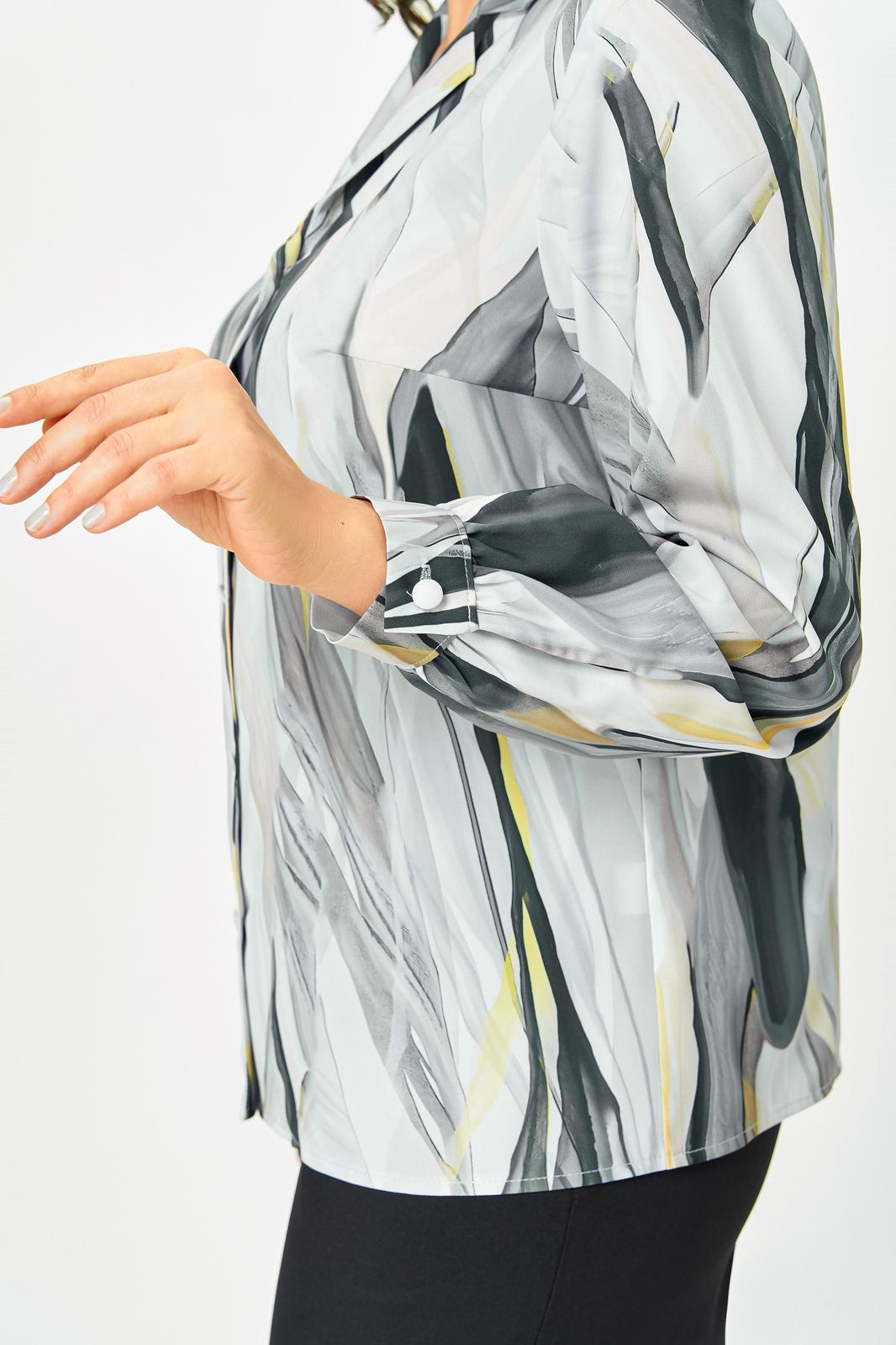 Блузка женская из мягкой вискозной ткани, прямого силуэта с центральной застёжкой на петли и декоративные пуговицы. По переду обработаны нагрудные вытачки, спинка цельная. Воротник пиджачного типа с отложными лацканами. Рукав втачной, одношовный длинный, внизу со сборкой и манжетой, которая застёгивается на петлю и пуговицу.