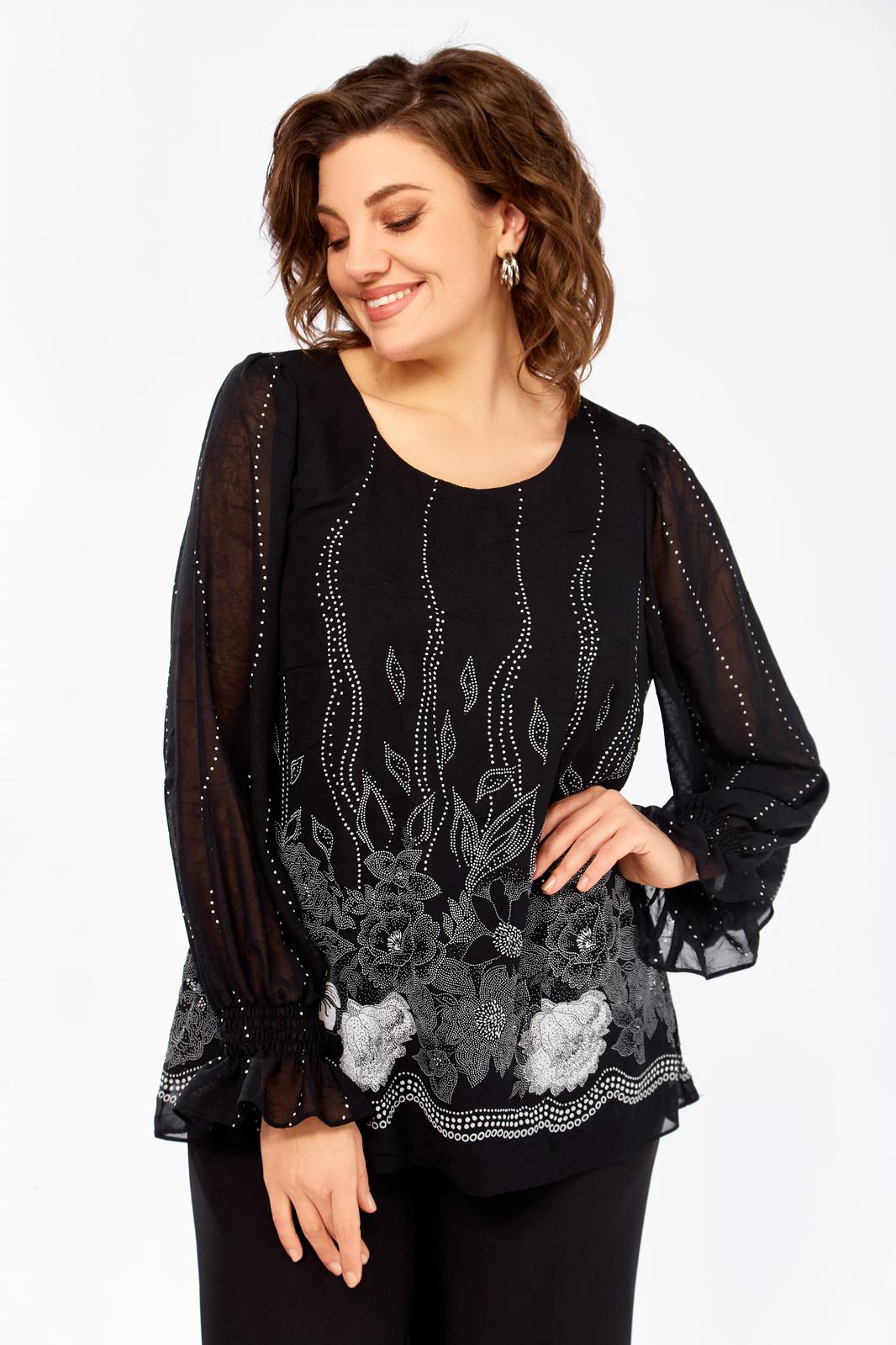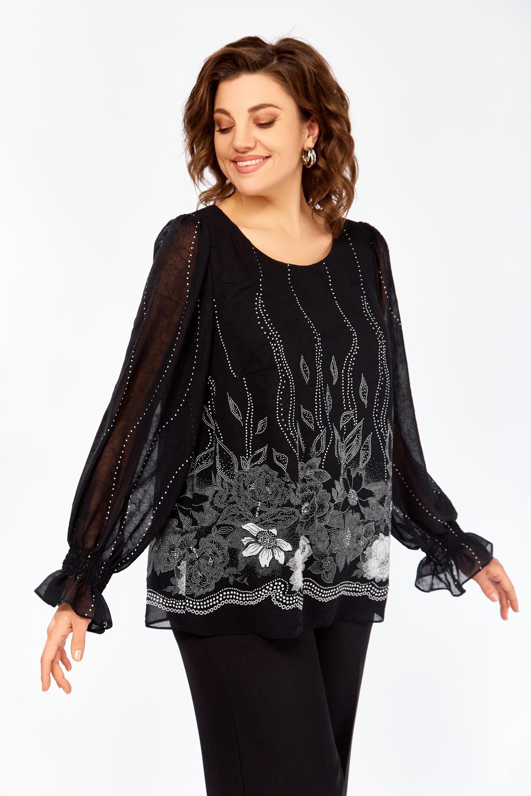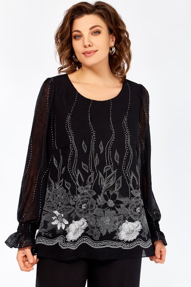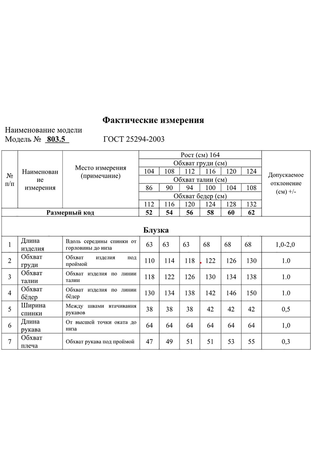 Блузка А-силуэта из нежной шифоновой ткани с лёгким эффектом «жатки», на подкладке из шифона. Полочка с нагрудными выточками, спинка без особенностей. Горловина круглая. Рукав втачной длинный по окату со сборкой, в нижней части собран на эластичную нить, которая внизу образует рюшу высотой 6 см.