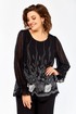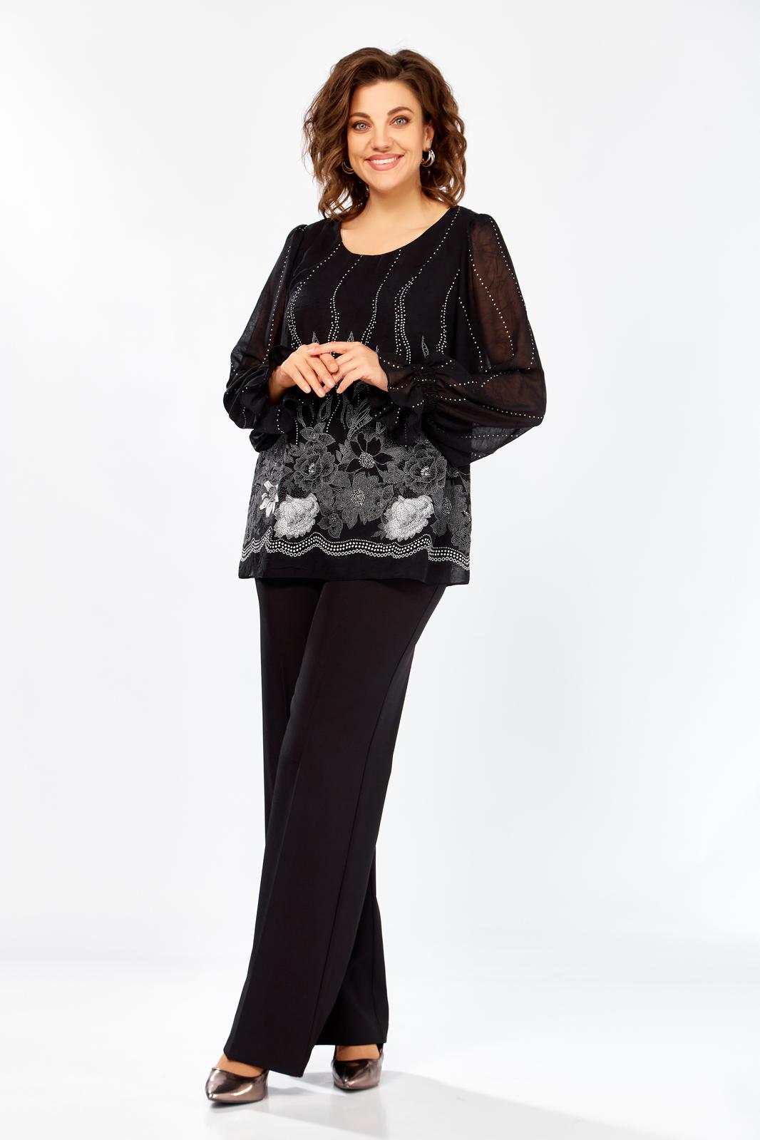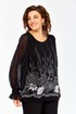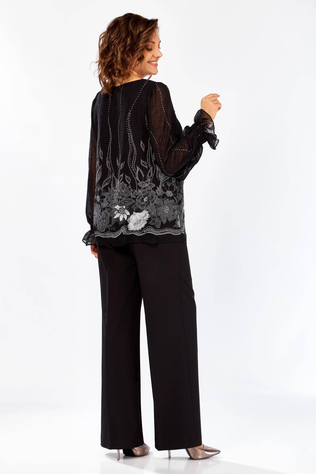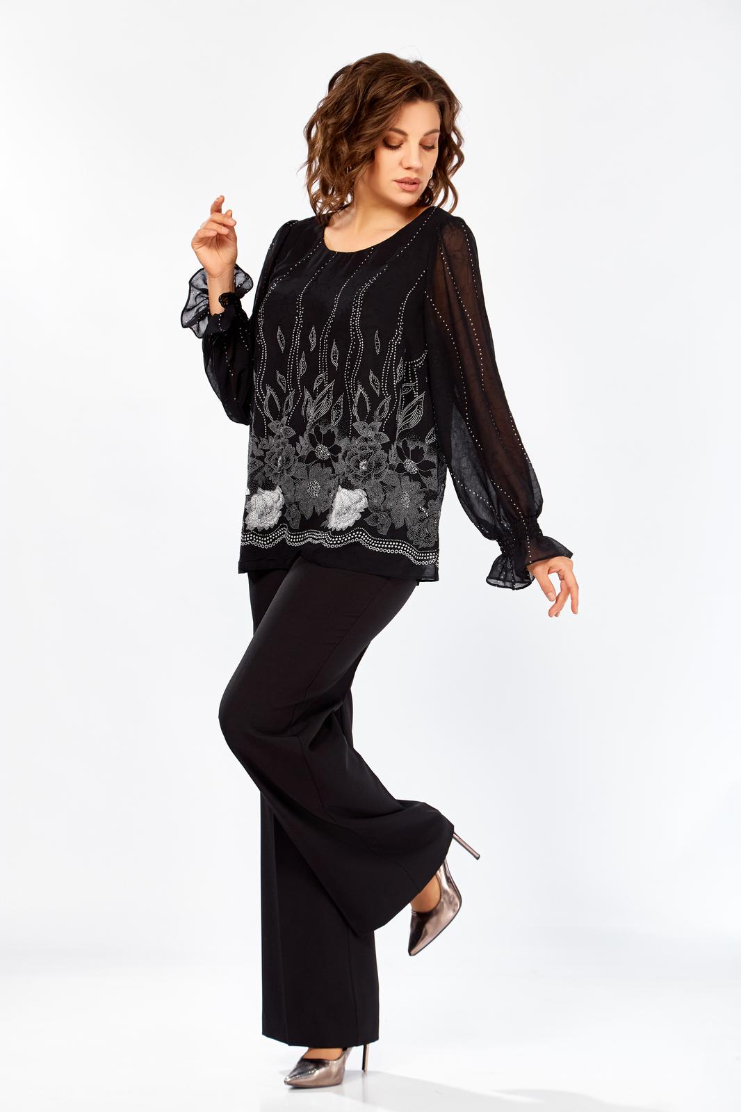 Блузка А-силуэта из нежной шифоновой ткани с лёгким эффектом «жатки», на подкладке из шифона. Полочка с нагрудными выточками, спинка без особенностей. Горловина круглая. Рукав втачной длинный по окату со сборкой, в нижней части собран на эластичную нить, которая внизу образует рюшу высотой 6 см.